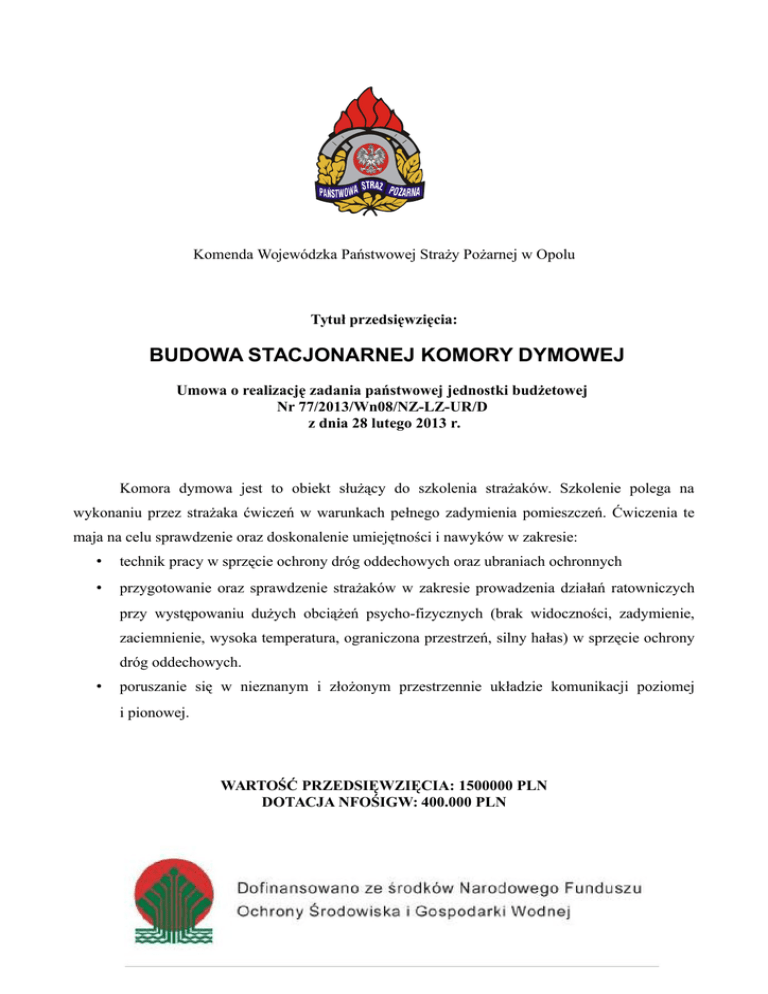 Komenda Wojewódzka Państwowej Straży Pożarnej w Opolu Tytuł przedsięwzięcia: BUDOWA STACJONARNEJ KOMORY DYMOWEJ Umowa o realizację zadania państwowej jednostki budżetowej Nr 77/2013/Wn08/NZ-LZ-UR/D z dnia 28 lutego 2013 r. Komora dymowa jest to obiekt służący do szkolenia strażaków. Szkolenie polega na wykonaniu przez strażaka ćwiczeń w warunkach pełnego zadymienia pomieszczeń. Ćwiczenia te maja na celu sprawdzenie oraz doskonalenie umiejętności i nawyków w zakresie: • technik pracy w sprzęcie ochrony dróg oddechowych oraz ubraniach ochronnych • przygotowanie oraz sprawdzenie strażaków w zakresie prowadzenia działań ratowniczych przy występowaniu dużych obciążeń psycho-fizycznych (brak widoczności, zadymienie, zaciemnienie, wysoka temperatura, ograniczona przestrzeń, silny hałas) w sprzęcie ochrony dróg oddechowych. • poruszanie się w nieznanym i złożonym przestrzennie układzie komunikacji poziomej i pionowej. WARTOŚĆ PRZEDSIĘWZIĘCIA: 1500000 PLN DOTACJA NFOŚIGW: 400.000 PLN