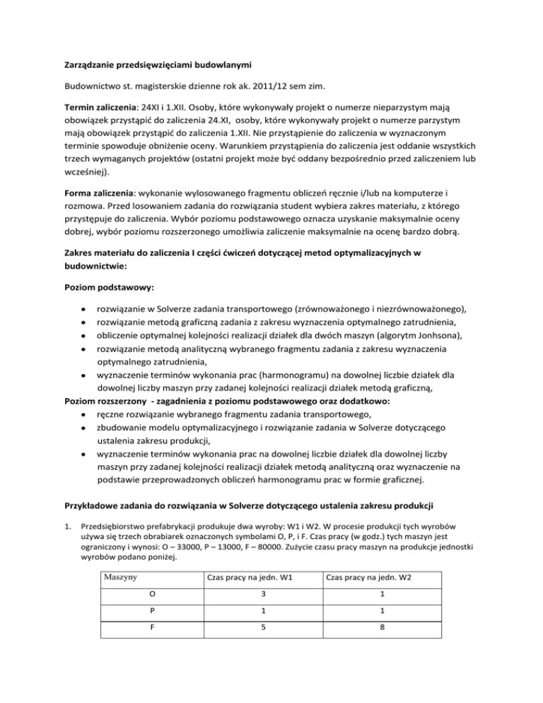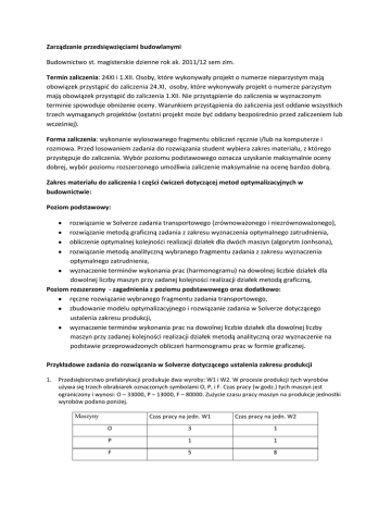 Zarządzanie przedsięwzięciami budowlanymi Budownictwo st. magisterskie dzienne rok ak. 2011/12 sem zim. Termin zaliczenia: 24XI i 1.XII. Osoby, które wykonywały projekt o numerze nieparzystym mają obowiązek przystąpić do zaliczenia 24.XI, osoby, które wykonywały projekt o numerze parzystym mają obowiązek przystąpić do zaliczenia 1.XII. Nie przystąpienie do zaliczenia w wyznaczonym terminie spowoduje obniżenie oceny. Warunkiem przystąpienia do zaliczenia jest oddanie wszystkich trzech wymaganych projektów (ostatni projekt może być oddany bezpośrednio przed zaliczeniem lub wcześniej). Forma zaliczenia: wykonanie wylosowanego fragmentu obliczeń ręcznie i/lub na komputerze i rozmowa. Przed losowaniem zadania do rozwiązania student wybiera zakres materiału, z którego przystępuje do zaliczenia. Wybór poziomu podstawowego oznacza uzyskanie maksymalnie oceny dobrej, wybór poziomu rozszerzonego umożliwia zaliczenie maksymalnie na ocenę bardzo dobrą. Zakres materiału do zaliczenia I części ćwiczeń dotyczącej metod optymalizacyjnych w budownictwie: Poziom podstawowy: rozwiązanie w Solverze zadania transportowego (zrównoważonego i niezrównoważonego), rozwiązanie metodą graficzną zadania z zakresu wyznaczenia optymalnego zatrudnienia, obliczenie optymalnej kolejności realizacji działek dla dwóch maszyn (algorytm Jonhsona), rozwiązanie metodą analityczną wybranego fragmentu zadania z zakresu wyznaczenia optymalnego zatrudnienia, wyznaczenie terminów wykonania prac (harmonogramu) na dowolnej liczbie działek dla dowolnej liczby maszyn przy zadanej kolejności realizacji działek metodą graficzną, Poziom rozszerzony - zagadnienia z poziomu podstawowego oraz dodatkowo: ręczne rozwiązanie wybranego fragmentu zadania transportowego, zbudowanie modelu optymalizacyjnego i rozwiązanie zadania w Solverze dotyczącego ustalenia zakresu produkcji, wyznaczenie terminów wykonania prac na dowolnej liczbie działek dla dowolnej liczby maszyn przy zadanej kolejności realizacji działek metodą analityczną oraz wyznaczenie na podstawie przeprowadzonych obliczeń harmonogramu prac w formie graficznej. Przykładowe zadania do rozwiązania w Solverze dotyczącego ustalenia zakresu produkcji 1. Przedsiębiorstwo prefabrykacji produkuje dwa wyroby: W1 i W2. W procesie produkcji tych wyrobów używa się trzech obrabiarek oznaczonych symbolami O, P, i F. Czas pracy (w godz.) tych maszyn jest ograniczony i wynosi: O – 33000, P – 13000, F – 80000. Zużycie czasu pracy maszyn na produkcje jednostki wyrobów podano poniżej. Czas pracy na jedn. W1 Maszyny Czas pracy na jedn. W2 O 3 1 P 1 1 F 5 8 Zysk ze sprzedaży (w zł) wyrobów wynosi W1 – 1, W2 – 3. Wyrobu W2 nie daje się sprzedać więcej niż 7000 szt. Ustał rozmiar produkcji maksymalizujący zysk ze sprzedaży wyrobów W1 i W2. Czy optymalna struktura produkcji ulegnie zmianie, jeśli zysk ze sprzedaży wyrobu I wzrośnie do 4 zł? 2. Dwa gatunki węgla A i B zawierają zanieczyszczenia fosforem i popiołem. Niezbędne jest dobranie co najmniej 90 ton opału zawierającego nie więcej niż 0,03% fosforu i nie więcej niż 4% popiołu. Procent zanieczyszczeń i ceny zakupu podano w tabeli. Jak zmieszać oba gatunki węgla, aby uzyskać najtańsze paliwo spełniające stawiane wymagania? Węgiel % zawartość zanieczyszczeń fosforu % zawartość zanieczyszczeń popiołu Cena zakupu 1 t węgla A 0,02 3 200 B 0,05 5 160 Czy skład paliwa należy zmienić, jeśli cena węgla B wzrośnie do 200 zł za tonę? 3. Przedsiębiorstwo „Kop z nami” wykonuje wykop pod budynek. Na stanie przedsiębiorstwa są samochody 8 i 10 tonowe. Koparka wykonująca wykop może załadować maksymalnie 25 jednostek w ciągu zmiany bez względu na pojemność samochodu. Na jeden kurs samochód 8 tonowy zużywa 6 litrów paliwa, 10 tonowy – 8 litrów. Żaden z samochodów nie jest w stanie wykonać więcej niż 20 kursów w ciągu zmiany. Dzienny limit paliwa wynosi 196 litrów. Ile cykli przewozowych należy zaplanować dla każdego z dwóch typów samochodów, aby objętość wywiezionego gruntu była największa? Czy zlikwidowanie limitu zużywanego paliwa zmieni rozwiązanie? 4. Zakład dysponuje jednym urządzeniem do produkcji mieszanek betonowych A i B. Mieszanki rozwożone są tym samym typem wywrotki. Urządzenie produkujące mieszanki w ciągu jednej godziny jest wstanie wyprodukować 14 wywrotek mieszanki A lub 7 wywrotek mieszanki B. Ze względu na różne odległości do odbiorców samochody są w stanie przewieść mieszankę A siedem razy na godzinę lub 12 razy na godzinę mieszankę B. Urządzenie do załadunku jest w stanie obsłużyć nie więcej niż 8 samochodów na godzinę bez względu na rodzaj mieszanki. Zysk ze sprzedaży mieszanki A wynosi 50 zł za wywrotkę a 100 zł za mieszankę B. Ile wywrotek mieszanki A i B powinien produkować zakład, aby zmaksymalizować dochód ze sprzedaży betonów? Do ilu należałoby zwiększyć moc urządzenia załadunkowego, aby nie stanowiło ograniczenia wzrostu sprzedaży produkowanych mieszanek betonowych? 5. Przedsiębiorstwo budowlane produkuje dwa elementy: A i B ze sprzedaży których uzyskuje zysk odpowiednio 300 i 450 zł. Do produkcji zużywa się dwa materiały (stal i blachę), których miesięczne dostawy są w ograniczonej ilości. W procesie produkcji używa się trzech maszyn o limitowanej miesięcznej przepustowości wyrażonej w maszynogodzinach. Dane o wielkości zapasów, przepustowości maszyn i norm użycia materiałów i maszyn przy produkcji jednego elementu podane są w tabeli. Wielkość zapasów Rodzaj zasobu Stal [kg] Norma zużycia na jedn. wyr. A Norma zużycia na jedn. wyr. B 2800 35 40 Blacha [m ] 1200 12 25 Wózek widłowy [mg] 1800 30 40 2 Giętarka [mg] 2000 25 40 Nożyce [mg] 2400 20 60 300 450 Zysk [zł] Wyznacz plan produkcji maksymalizujący zysk ze sprzedaży elementów A i B. Czy zwiększenie miesięcznych dostaw stali 