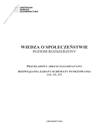 .pl lm ed ia .sq ww zw po br an o WIEDZA O SPOŁECZEŃSTWIE POZIOM ROZSZERZONY PRZYKŁADOWY ARKUSZ EGZAMINACYJNY ROZWIĄZANIA ZADAŃ I SCHEMATY PUNKTOWANIA (A1, A3, A7) GRUDZIEŃ 2014 .pl lm ed ia .sq po br an o zw ww Zadanie 1. (0–1) Wymagania ogólne I. Wykorzystanie i tworzenie informacji. II. Rozpoznawanie i rozwiązywanie problemów. VI. Dostrzeganie współzależności we współczesnym świecie. Wymagania szczegółowe 1. Życie zbiorowe i jego reguły. Uczeń: 1) charakteryzuje wybrane zbiorowości, społeczności, wspólnoty, społeczeństwa, ze względu na obowiązujące w nich reguły i więzi. 3. Grupa społeczna. Uczeń: 2) omawia na przykładach różne rodzaje grup i wyjaśnia funkcjonowanie wskazanej grupy. 8. Kultura i pluralizm kulturowy. Uczeń: 8) charakteryzuje subkultury młodzieżowe w Polsce i Europie. (III etap) 2. Życie społeczne. Uczeń: 2) wyjaśnia na przykładach znaczenie podstawowych norm współżycia między ludźmi, w tym wzajemności, odpowiedzialności i zaufania. Poprawne rozstrzygnięcie: NIE Przykład uzasadnienia: Inna jest trwałość relacji – długotrwałe związki w subkulturach wobec krótkotrwałych relacji wśród współczesnej młodzieży. Inny jest także charakter relacji – członkowie subkultur z lat 80. tworzyli grupy, które wycofywały się z tzw. normalnego życia, narzucały swoim członkom wygląd, styl życia; współczesna młodzież funkcjonuje w wielu różnych grupach, a zewnętrzne elementy identyfikacji: fryzura, strój nie są tak silne; Schemat punktowania: 1 pkt – podanie dwóch poprawnych elementów odpowiedzi (rozstrzygnięcia i uzasadnienia) 0 pkt – inna odpowiedź lub brak odpowiedzi Zadanie 2. (0–1) I. Wykorzystanie i tworzenie informacji. II. Rozpoznawanie i rozwiązywanie problemów. VI. Dostrzeganie współzależności we współczesnym świecie. 1. Życie zbiorowe i jego reguły. Uczeń: 1) charakteryzuje wybrane zbiorowości, społeczności, wspólnoty, społeczeństwa, ze względu na obowiązujące w nich reguły i więzi. 3. Grupa społeczna. Uczeń: 2) omawia na przykładach różne rodzaje grup i wyjaśnia funkcjonowanie wskazanej grupy. 8. Kultura i pluralizm kulturowy. Uczeń: 8) charakteryzuje subkultury młodzieżowe w Polsce i Europie. Poprawna odpowiedź: · ze względu na zorganizowanie – nieformalna · ze względu na otwartość – inkluzywna Schemat punktowania: 1 pkt – podanie dwóch poprawnych elementów odpowiedzi 0 pkt – inna odpowiedź lub brak odpowiedzi .pl lm ed ia .sq ww zw po br an o Zadanie 3. (0–2) I. Wykorzystanie i tworzenie informacji. II. Rozpoznawanie i rozwiązywanie problemów. VI. Dostrzeganie współzależności we współczesnym świecie. 5. Zmiana społeczna. Uczeń: 2) omawia cechy współczesnego społeczeństwa zachodniego (otwarte, postindustrialne, konsumpcyjne, masowe, informacyjne); 3) analizuje sposoby adaptacji do zmiany społecznej na podstawie własnych obserwacji i tekstów kultury. 6. Naród, ojczyzna i mniejszości narodowe. Uczeń: 2) omawia czynniki sprzyjające asymilacji oraz służące zachowaniu tożsamości narodowej. 7. Procesy narodowościowe i społeczne we współczesnym świecie. Uczeń: 1) wyjaśnia, dlaczego i w jakim zakresie doszło do integracji narodów w świecie zachodnim. 9. Współczesne spory światopoglądowe. Uczeń: 5) rozpatruje racje stron innych aktualnych sporów światopoglądowych i formułuje swoje stanowisko w danej sprawie. 41. Globalizacja współczesnego świata. Uczeń: 1) przedstawia wieloaspektowy charakter procesów globalizacji (polityka, gospodarka, kultura, komunikacja, ekologia). (III etap) 23. Problemy współczesnego świata. Uczeń: 3) wyjaśnia, odwołując się do przykładów, na czym polega globalizacja w sferze kultury, gospodarki i polityki; ocenia jej skutki. Przykład poprawnej odpowiedzi: Przyczyny: · w obu tekstach autorzy wskazują globalizację jako jedną z przyczyn zachodzących zmian, · w tekście 1. autor wskazuje usieciowienie i elastyczność, a autor tekstu 2. – modernizację, rozwój gospodarczy, urbanizację. Charakter: Według tekstu 1. zmiany prowadzą do fundamentalizmu religijnego, nacjonalizmu kulturowego, komun terytorialnych, zaś w tekście 2. powodują one, że subnarodowe tożsamości kulturowe i regionalne uzyskują pierwszeństwo przed szerszą tożsamością narodową / zawężanie tożsamości postępuje równolegle z jej poszerzaniem. lub W tekście 1. mamy negatywną ocenę zmian, zaś w tekście 2. nie ma jednoznacznie negatywnej oceny zmian. Schemat punktowania: 2 pkt – podanie dwóch poprawnych elementów odpowiedzi (przyczyn i charakteru zmian) 1 pkt – podanie jednego poprawnego elementu odpowiedzi (przyczyn lub charakteru zmian) 0 pkt – inna odpowiedź lub brak odpowiedzi Zadanie 4. (0–1) I. Wykorzystanie i tworzenie informacji. II. Rozpoznawanie i rozwiązywanie problemów. 5. Zmiana społeczna. Uczeń: 1) charakteryzuje historyczne formy organizacji społeczeństwa (pierwotne, tradycyjne, przemysłowe, postindustrialne); 2) omawia cechy współczesnego społeczeństwa zachodniego (otwarte, postindustrialne, konsumpcyjne, masowe, informacyjne). .pl lm ed ia .sq po br an o zw ww Poprawna odpowiedź: A. pierwotne B. informacyjne / postindustrialne Schemat punktowania: 1 pkt – podanie dwóch poprawnych elementów odpowiedzi 0 pkt – inna odpowiedź lub brak odpowiedzi Zadanie 5. (0–1) I. Wykorzystanie i tworzenie informacji. II. Rozpoznawanie i rozwiązywanie problemów. 4. Struktura społeczna. Uczeń: 5) charakteryzuje wybrane problemy życia społecznego w Polsce (w tym sytuację młodych ludzi); rozważa możliwości ich rozwiązania. (III etap) 3. Współczesne społeczeństwo polskie. Uczeń: 1) charakteryzuje – odwołując się do przykładów – wybrane warstwy społeczne, grupy zawodowe i style życia. (III etap) 26. Gospodarstwo domowe. Uczeń: 1) wyjaśnia na przykładach, jak funkcjonuje gospodarstwo domowe. Przykład po