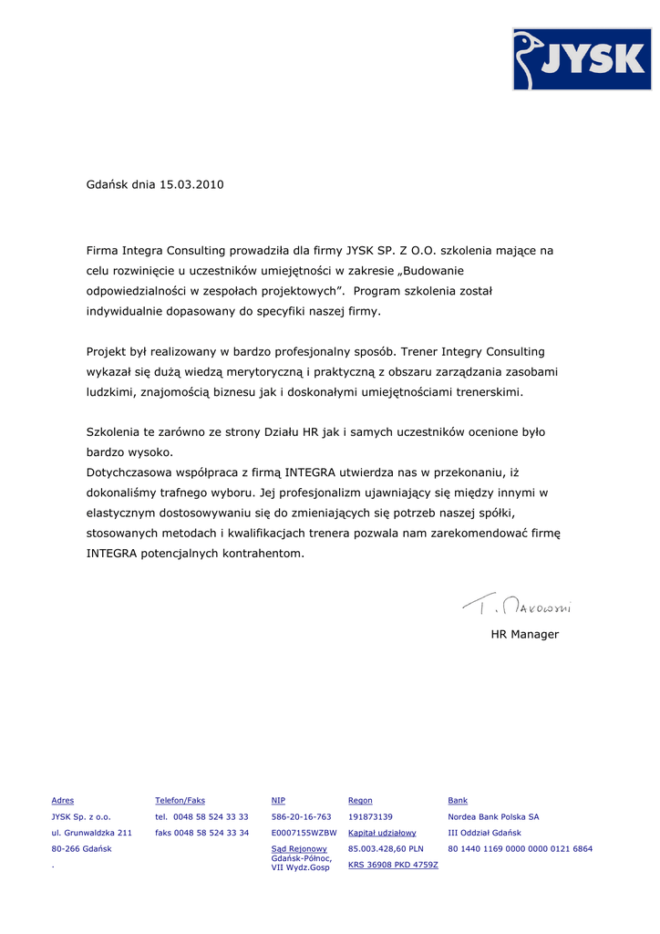 Gdańsk dnia 15.03.2010 Firma Integra Consulting prowadziła dla firmy JYSK SP. Z O.O. szkolenia mające na celu rozwinięcie u uczestników umiejętności w zakresie „Budowanie odpowiedzialności w zespołach projektowych”. Program szkolenia został indywidualnie dopasowany do specyfiki naszej firmy. Projekt był realizowany w bardzo profesjonalny sposób. Trener Integry Consulting wykazał się duŜą wiedzą merytoryczną i praktyczną z obszaru zarządzania zasobami ludzkimi, znajomością biznesu jak i doskonałymi umiejętnościami trenerskimi. Szkolenia te zarówno ze strony Działu HR jak i samych uczestników ocenione było bardzo wysoko. Dotychczasowa współpraca z firmą INTEGRA utwierdza nas w przekonaniu, iŜ dokonaliśmy trafnego wyboru. Jej profesjonalizm ujawniający się między innymi w elastycznym dostosowywaniu się do zmieniających się potrzeb naszej spółki, stosowanych metodach i kwalifikacjach trenera pozwala nam zarekomendować firmę INTEGRA potencjalnych kontrahentom. HR Manager Adres Telefon/Faks NIP Regon Bank JYSK Sp. z o.o. tel. 0048 58 524 33 33 586-20-16-763 191873139 Nordea Bank Polska SA ul. Grunwaldzka 211 faks 0048 58 524 33 34 E0007155WZBW Kapitał udziałowy III Oddział Gdańsk Sąd Rejonowy Gdańsk-Północ, VII Wydz.Gosp 85.003.428,60 PLN 80 1440 1169 0000 0000 0121 6864 80-266 Gdańsk . KRS 36908 PKD 4759Z