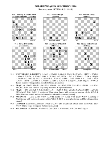 POLSKI ZWIĄZEK SZACHOWY 2016 ROZWIĄZANIA 28 VI 2016 [911-916] 911. Anatolij WASYLENKO & Mark BASISTY (Ukraina) #2 (10+8) 914. Żivko JANEVSKI (Macedonia) h#2** (4+9) 912. Marian FRĄK (Polska) #3 b,c) Sa1→c4,a4 (4+1) 915. Abdelaziz ONKOUD (Maroko) h#2 4 rozwiązania (8+11) 913. Marian FRĄK (Polska) s#3 (9+7) 916. Stefan MILEWSKI (Polska) h#3 2 rozwiązania (3+6) 911 WASYLENKO & BASISTY 1.He4? ~ 2.Wb4# 1...G:d4 b 2.Se3# 1...W:d4! a 1.Hf3? ~ 2.Wb4# 1...G:d4 b 2.Hb3# 1...K:d4 2.Hf4# 1...W:d4+! a (2.Hb3?) 1.S~? ~ 2.Wb4# 1...G:d4 b 2.H:g8# 1...W:d4! a (2.Hc8? B) 1.e3? ~ 2.Hc8# B 1...W:d4 a 2.H:d4# 1...G:d5 2.Wb4 A # 1...G:e3 2. S:e3# 1...Ge6! 1.Sf4! ~ 2.Wb4# A 1...W:d4 a 2.Hc8# B 1...G:d4 b 2.H:g8# 1...K:d4 2.Sg2#. 10 WCCT theme, Dombrovskis paradox, pseudo le Grand. [Autorzy] 912 FRĄK a) 1.We2! Kb1,d1 2.Gc3 Kc1 3.We1# b) 1.Wb2! Kd1 2.Sa3 Kc1 3.Wb1# c) 1.Wa2! Kb1,d1 2.Sc3+ Kc1 3.Gd2#. Trzy maty wzorowe w superminiaturze. 913 FRĄK 1.h7? g6 2.Se2 f3 3.Sc1 Sd2# 1...f3! 1.Se2! f3 2.Sc1 g6/g:h6 3.h7/g:h6 Sd2# 1...g6/g:h6 2.h7/g:h6 f3 3.Sc1 Sd2#. A setting of Chumakov theme with reciprocal capture of the WPc3 & BPb4, black self-block and model mates in a Meredith position. [Autor] 914 JANEVSKI 1...e:f3 2.e:f3 Wd4# 1...Wd2 2.e:d2 e3# 1.f:e2 W-f6 2.Kf3 W:f5#. A setting of Zilahi theme with reciprocal capture of the WPe2 & BPf3 in a set-play forma and Meredith position. [Autor] 915 ONKOUD 1.f:e5 Gb1 2.e4 Ga2# 1.Wc1 e3 2.Wc4 e4# 1.Ge8 S:c8 2.G:c6 Sb6# 1.Sb6 Wb7 2.Sc4 Wb5#. Thème Rope cyclique à 4 chainons. [Autor] 916 MILEWSKI 1.Kd5 Ga4 2.Wc6 Gc7 3.Gc5 Gb3# 1.We6 Gh4 2.Wf6 Gc6 3.Gf5 Gg3#.