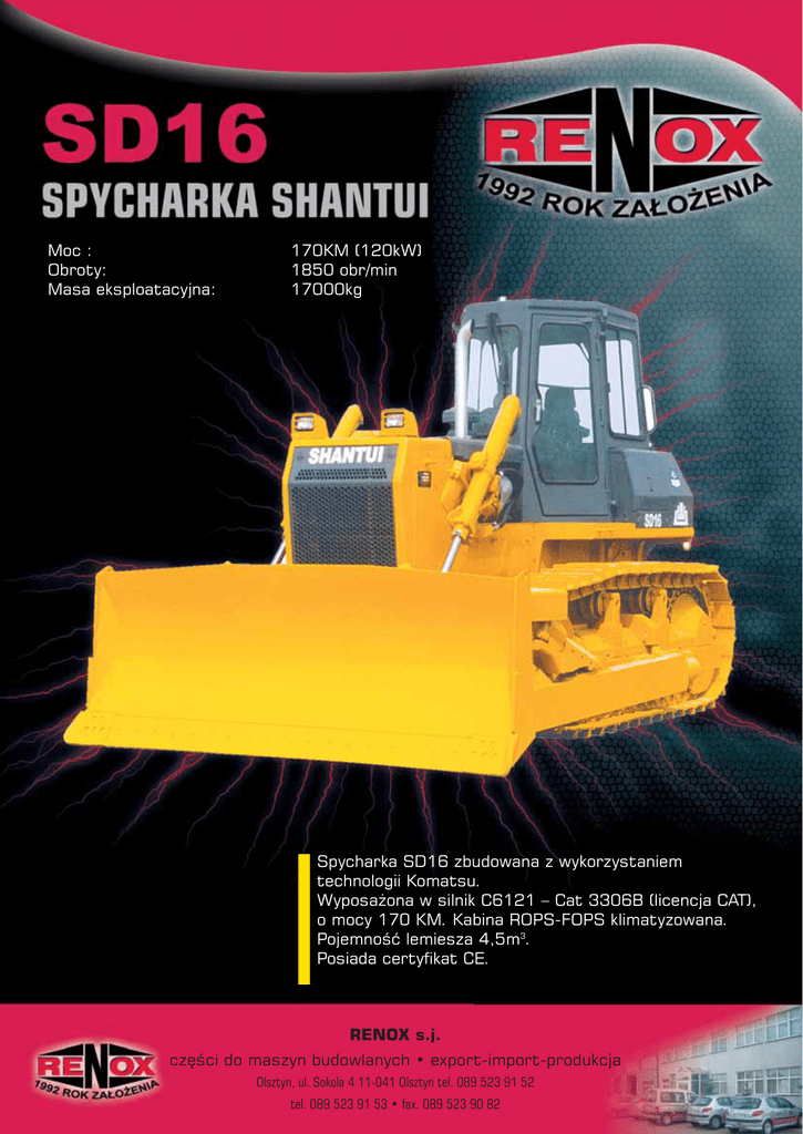 Moc : Obroty: Masa eksploatacyjna: 170KM (120kW) 1850 obr/min 17000kg Spycharka SD16 zbudowana z wykorzystaniem technologii Komatsu. Wyposa˝ona w silnik C6121 – Cat 3306B (licencja CAT), o mocy 170 KM. Kabina ROPS-FOPS klimatyzowana. PojemnoÊç lemiesza 4,5m3. Posiada certyfikat CE. RENOX s.j. cz´Êci do maszyn budowlanych • export-import-produkcja Olsztyn, ul. Sokola 4 11-041 Olsztyn tel. 089 523 91 52 tel. 089 523 91 53 • fax. 089 523 90 82 Typ ............................................................... C6121-cat 3306B cieczà Ch∏odzony Moc znamionowa..............................................170KM/120kW Obrót znamieniowy ............................................1850 obr/min cylindrów-Êrednica !" IloÊç x skok t∏oka ..................6-126x130 # PojemnoÊç skokowa ....................................................9,726L $%& Minimalne paliwa .....................................214g/KW h zu˝ycie '!( %)" Maksymalny moment obrotowy ................................764 Nm *' + ,"./,"- $ %$ $ &" + ./ / 3"2/+ .++4",""3+2./4,')+,353"2/+ " .,"62+/,7.',""54"," - 8/4," !'2",""/2",""3/"2' ' ,""3/"2/+ /,""9 ,'- % % $ % $ % $% $ % +0 2 / Rolki podtrzymujàce ............................................................ 4 & Rolki jezdne ..........................................................................12 & (po ka˝dej stronie: 4 jednoko∏nierzowe, $!'2"" dwuko∏nierzowe) ! "" SzerekoÊç std p∏yt gàsienicowych ............................510 mm Podzia∏ka gàsienic ....................................................203.2mm IloÊç p∏yt gàsienicowych .............................................. 37 szt. D∏ugoÊç gàsienicy..................................................... 2430 mm 35 +"+ . ( &!" # ;# % % $ % ! 2"./.+/:/ " + +2. " # + ." /2/ 4.+ 4+ " /' $ ! mokre, hydrauliczne, " 2. wielotarczowe, + // 2 po∏àczone z hamulcem +"2" % " //+"'" ! dwustopniowa .+redukcja 4+pr´dkoÊci, smarowanie rozbryzgowe .2 + ./ " /'