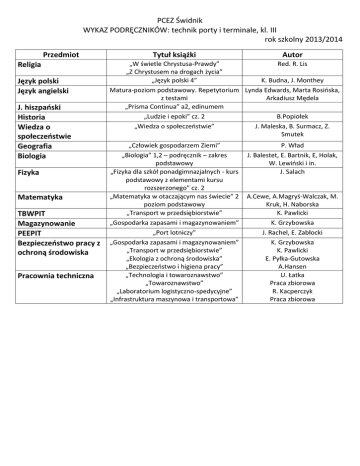 PCEZ Świdnik WYKAZ PODRĘCZNIKÓW: technik porty i terminale, kl. III rok szkolny 2013/2014 Przedmiot Religia Język polski Język angielski J. hiszpański Historia Wiedza o społeczeństwie Geografia Biologia Fizyka Matematyka TBWPIT Magazynowanie PEEPIT Bezpieczeństwo pracy z ochroną środowiska Pracownia techniczna Tytuł książki Autor „W świetle Chrystusa-Prawdy” Red. R. Lis „Z Chrystusem na drogach życia” „Język polski 4” K. Budna, J. Monthey Matura-poziom podstawowy. Repetytorium Lynda Edwards, Marta Rosińska, z testami Arkadiusz Mędela „Prisma Continua” a2, edinumem „Ludzie i epoki” cz. 2 B.Popiołek „Wiedza o społeczeństwie” J. Maleska, B. Surmacz, Z. Smutek „Człowiek gospodarzem Ziemi” „Biologia” 1,2 – podręcznik – zakres podstawowy „Fizyka dla szkół ponadgimnazjalnych - kurs podstawowy z elementami kursu rozszerzonego” cz. 2 „Matematyka w otaczającym nas świecie” 2 poziom podstawowy „Transport w przedsiębiorstwie” „Gospodarka zapasami i magazynowaniem” „Port lotniczy” „Gospodarka zapasami i magazynowaniem” „Transport w przedsiębiorstwie” „Ekologia z ochroną środowiska” „Bezpieczeństwo i higiena pracy” „Technologia i towaroznawstwo” „Towaroznawstwo” „Laboratorium logistyczno-spedycyjne” „Infrastruktura maszynowa i transportowa” P. Wład J. Balestet, E. Bartnik, E, Holak, W. Lewiński i in. J. Salach A.Cewe, A.Magryś-Walczak, M. Kruk, H. Naborska K. Pawlicki K. Grzybowska J. Rachel, E. Zabłocki K. Grzybowska K. Pawlicki E. Pyłka-Gutowska A.Hansen U. Łatka Praca zbiorowa R. Kacperczyk Praca zbiorowa