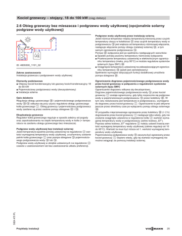 Kocioł grzewczy – stojący, 18 do 100 kW (ciąg dalszy) 2.6 Obieg grzewczy bez mieszacza i podgrzewu wody użytkowej (opcjonalnie solarny podgrzew wody użytkowej) ID: 4605300_1101_02 Zakres zastosowania Instalacja grzewcza z podgrzewem wody użytkowej Elementy podstawowe ■ Olejowy kocioł kondensacyjny lub gazowy kocioł kondensacyjny 18 do 60 kW ■ Pojemnościowy podgrzewacz wody (dwusystemowy) ■ Instalacja solarna Opis działania Regulacja obiegu grzewczego eP i pojemnościowego podgrzewacza wody qP/qR odbywa się przy użyciu regulatora obiegu grzewczego kotła grzewczego 1. Obieg grzewczy i pojemnościowy podgrzewacz wody zasilane są przez osobne pompy obiegowe eQ i qE. Eksploatacja grzewcza Regulator kotła grzewczego reguluje w sposób zależny od pogody oraz zapotrzebowania na ciepło temperaturę wody w kotle (= temperatura na zasilaniu obiegu grzewczego bez mieszacza). Ograniczenie dogrzewu pojemnościowego podgrzewacza wody przez kocioł grzewczy w połączeniu z regulatorem systemów solarnych (typu SM1) Ograniczenie dogrzewu odbywa się dwustopniowo. Dogrzew pojemnościowego podgrzewacza wody qR przez kocioł grzewczy 1 zostaje ograniczony, gdy tylko rozpocznie się podgrzew wody w pojemnościowym podgrzewaczu qR przez kolektory wP. W tym celu redukowana jest temperatura w podgrzewaczu, wymagana do dogrzewu przez kocioł grzewczy 1. Ograniczenie to jest aktywne jeszcze przez określony czas po wyłączeniu pompy obiegu solarnego wE. W przypadku nieprzerwanego ogrzewania przez kolektory wP (> 2 h) dogrzewanie przez kocioł grzewczy 1 następuje tylko wtedy, gdy nie zostanie osiągnięta ustawiona w regulatorze kotła 2 wartość wymaganej temperatury wody w podgrzewaczu (adres kodowy „67”). Poprzez adres kodowy „67” regulatora 2 należy ustawić trzecią wartość wymaganą temperatury wody użytkowej (zakres regulacji od 10 do 95°C). Wartość ta musi być niższa od 1. wartości wymaganej temperatury wody użytkowej. Pojemnościowy podgrzewacz wody qR zaczyna być ogrzewany przez kocioł grzewczy 1 dopiero wtedy, gdy tej wartości wymaganej nie można osiągnąć za pomocą instalacji solarnej. 5824 470 PL Podgrzew wody użytkowej bez instalacji solarnej Jeżeli temperatura spadnie poniżej ustawionej na regulatorze 2 wartości wymaganej temperatury wody użytkowej, uruchomiony zostanie palnik kotła grzewczego 1 oraz pompa obiegowa qE pojemnościowego podgrzewacza wody qP lub qR. Podgrzew wody użytkowej w obrębie ustawionych na regulatorze 2 czasów z zastosowaniem lub bez zastosowania układu preferencji. Podgrzew wody użytkowej przez instalację solarną Jeżeli różnica temperatur między temperaturą mierzoną przez czujnik temperatury cieczy w kolektorze wQ oraz czujnik temperatury wody w podgrzewaczu qT jest większa od temperatury różnicowej włączania, następuje włączenie pompy obiegu instalacji solarnej wE, a tym samym ogrzewanie podgrzewacza qR. Pompa wE wyłączana jest po spełnieniu następujących warunków: ■ Spadek poniżej poziomu temperatury różnicowej wyłączania ■ Przekroczenie temperatury ustawionej w elektronicznym ograniczniku temperatury (maks. przy 90°C) w module regulatora systemów solarnych (typu SM1) wZ ■ Osiągnięcie temperatury ustawionej na zabezpieczającym ograniczniku temperatury qZ (jeżeli jest zainstalowany) Spełnienie wymogów dotyczących funkcji dodatkowej umożliwia pompa obiegowa wR. Przykłady instalacji VIESMANN 25 2 Kocioł grzewczy – stojący, 18 do 100 kW (ciąg dalszy) Zasilanie 21 20 Powrót 2 30 26 --230 V---24---22-- --26/6-- --6---5---Magistrala KM-- Schemat instalacji hydraulicznej ID: 4605300_1101_02 --2/20-- 31 22 23 13 -2/A1/21- ---26/24-- CWU 12 --2/28-- 3 11 -- --2/X3.1;3.2-- 24 --26/22-- 16 --2/5-- -26/24- 25 KW 10 / 14 --5--X3.1;3.2--Magistrala KM-- 15 --26/5-1 --230 V---A1/21---28---20---96/156-- 2 Wskazówka: Niniejszy schemat jest przykładem podstawowej instalacji bez urządzeń odcinających i zabezpieczających. Nie zastępuje on fachowego projektu w miejscu montażu. Wymagane urządzenia 3 26 – Vitoladens 300-C z Vitotronic 200, typ KW6B – Vitocrossal 300 z Vitotronic 200, typ KW6B Czujnik temperatury zewnętrznej ATS VIESMANN Nr katalog. patrz cennik firmy Viessmann W zakresie dostawy kotła grzewczego, poz. 1 W zakresie dostawy Vitotronic, poz. 2 Przykłady instalacji 5824 470 PL ID: 4605300_1101_02 Poz. Oznaczenie Kocioł grzewczy wyposażony w 1 Regulator 2 Kocioł grzewczy – stojący, 18 do 100 kW (ciąg dalszy) ID: 4605300_1101_02 Poz. Oznaczenie Podgrzew wody użytkowej przez kocioł grzewczy Pojemnościowy podgrzewacz wody qP Czujnik temperatury wody w podgrzewaczu STS qQ qW qE qQ qW qE qR qT qZ wP wZ wQ wW wE wR wT wU eP eQ 5 6 7 zP zQ zW zE zR zT zZ zU zI uP Pompa cyrkulacyjna wody użytkowej ZP Pompa obiegowa podgrzewacza UPSB Pojemnościowy podgrzewacz wody, dwusystemowy Czujnik temperatury wody w podgrzewaczu SOL Zabezpieczający ogranicznik temperatury STB Kolektory słoneczne Moduł regulatora systemów solarnych, typ SM1 Czujnik temperatury cieczy w kolektorze KOL Zestaw pompowy Solar-Divicon Pompa obiegu solarnego Pompa obiegowa (zmieszanie) Termostatyczny automat mieszający Puszka rozgałęźna Obieg grzewczy I Pompa obiegu grzewczego A1 lub Divicon Wyposażenie dodatkowe (opcjonalnie) Wewnętrzny zestaw uzupełniający H1 (tylko do Vitocrossal 300, typ CU3A): – Podłączenie zewnętrznego, elektromagnetycznego zaworu bezpieczeństwa (gaz płynny) – Zbiorcze zgłaszanie usterek (alternatywa do zestawu uzupełniającego EA1) Wewnętrzny zestaw uzupełniający H2 (tylko do Vitocrossal 300, typ CU3A): – Blokada zewnętrznych wentylatorów odciągowych – Zbiorcze zgłaszanie usterek (alternatywa do zestawu uzupełniającego EA1) Zestaw uzupełniający EA1 Zewnętrzny,elektromagnetyczny zawór bezpieczeństwa gazu płynnego (wymagany wewnętrzny zestaw uzupełniający H1) tylko przy Vitocrossal 300, typ CU3A Blokada wentylatora wywiewneg