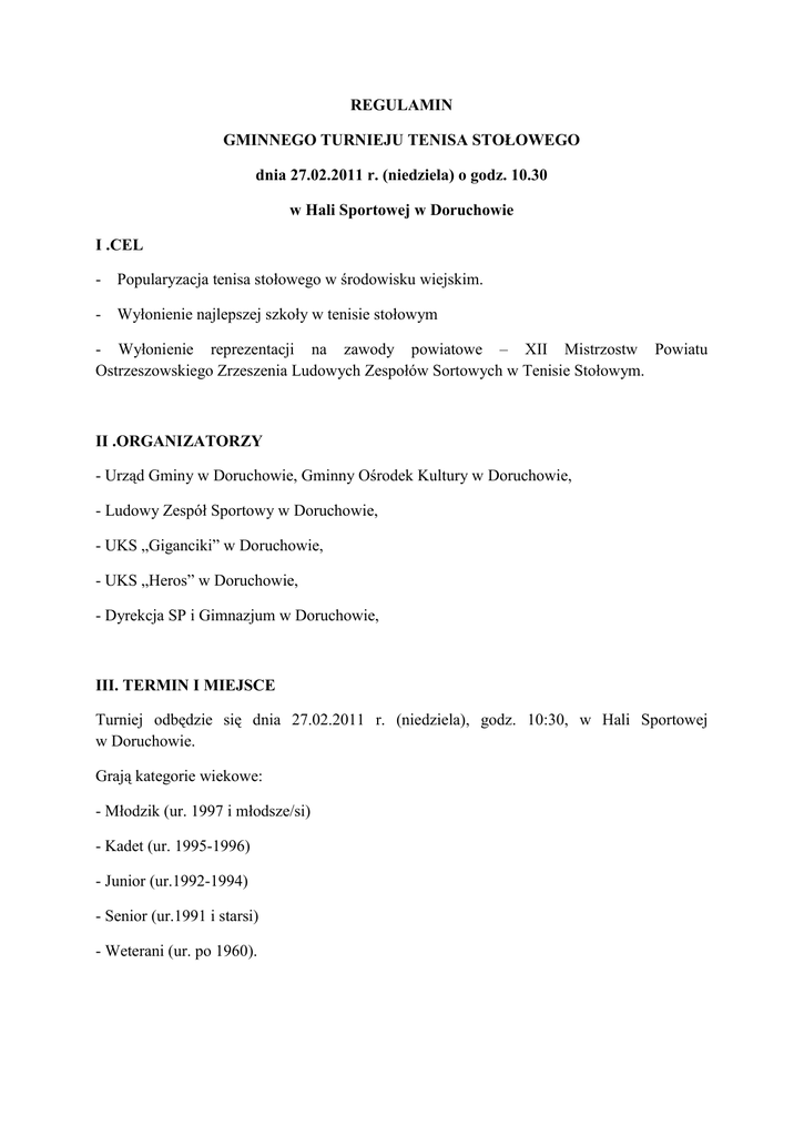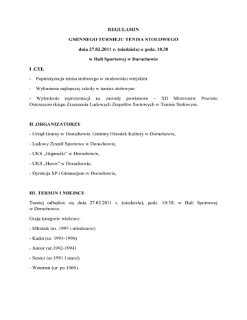 REGULAMIN GMINNEGO TURNIEJU TENISA STOŁOWEGO dnia 27.02.2011 r. (niedziela) o godz. 10.30 w Hali Sportowej w Doruchowie I .CEL - Popularyzacja tenisa stołowego w środowisku wiejskim. - Wyłonienie najlepszej szkoły w tenisie stołowym - Wyłonienie reprezentacji na zawody powiatowe – XII Mistrzostw Powiatu Ostrzeszowskiego Zrzeszenia Ludowych Zespołów Sortowych w Tenisie Stołowym. II .ORGANIZATORZY - Urząd Gminy w Doruchowie, Gminny Ośrodek Kultury w Doruchowie, - Ludowy Zespół Sportowy w Doruchowie, - UKS „Giganciki” w Doruchowie, - UKS „Heros” w Doruchowie, - Dyrekcja SP i Gimnazjum w Doruchowie, III. TERMIN I MIEJSCE Turniej odbędzie się dnia 27.02.2011 r. (niedziela), godz. 10:30, w Hali Sportowej w Doruchowie. Grają kategorie wiekowe: - Młodzik (ur. 1997 i młodsze/si) - Kadet (ur. 1995-1996) - Junior (ur.1992-1994) - Senior (ur.1991 i starsi) - Weterani (ur. po 1960). IV ZGŁOSZENIA Zgłoszenia przyjmowane będą w dniu zawodów tj. 27.02.2011 r. (niedziela). - do godz. 9.25 – uczniowie Szkół Podstawowych tj. kat. Młodzik - do godz. 10.30 – kat. Kadet (1995-1996) - do godz. 12.00 – kat. Junior (1992-1994) - do godz. 12.30 – kat. Senior (1991 i starsi) lub w dniu zawodów pod nr tel. ………………………………………………………………. V. ZASADY UCZESTNICTWA - Zawodnicy winni posiadać ważne badania lekarskie – odpowiedzialni opiekunowie kierownicy drużyn. - System gry zależny będzie od ilości zawodników. - Sprawy sporne rozstrzyga komisja sędziowska. - W zawodach mają prawo startu mieszkańcy Gminy Doruchów – zawodnicy/czki będący członkami LZS lub niezrzeszeni. - Liczba osób wymagana do rozegrania danej kategorii to 3 zawodników. VI. SPOSÓB PRZEPROWADZENIA Sposób przeprowadzenia rozgrywek zostanie ustalony przed rozgrywkami w danej kategorii wiekowej. VII. NAGRODY - za I- III medale i dyplomy VIII. ZASADY FINANSOWANIA - Koszty organizacyjne i nagród w zawodach pokrywają organizatorzy. - Koszty przejazdów na zawody i diet pokrywają zainteresowane kluby sportowe. IX. UWAGI KOŃCOWE - Uczestnicy turnieju korzystają z własnego sprzętu sportowego. - Za aktualne badania lekarskie odpowiedzialni są opiekunowie i kierownicy drużyn. - Wszelkie sprawy sporne i nie ujęte w niniejszym regulaminie rozstrzygają organizatorzy. - Uczestnicy powinni mieć odpowiedni strój sportowy, obuwie z białą podeszwą. - Organizator nie ponosi odpowiedzialności za pozostawione rakietki, telefony komórkowe oraz inne prywatne rzeczy pozostawione w szatni.