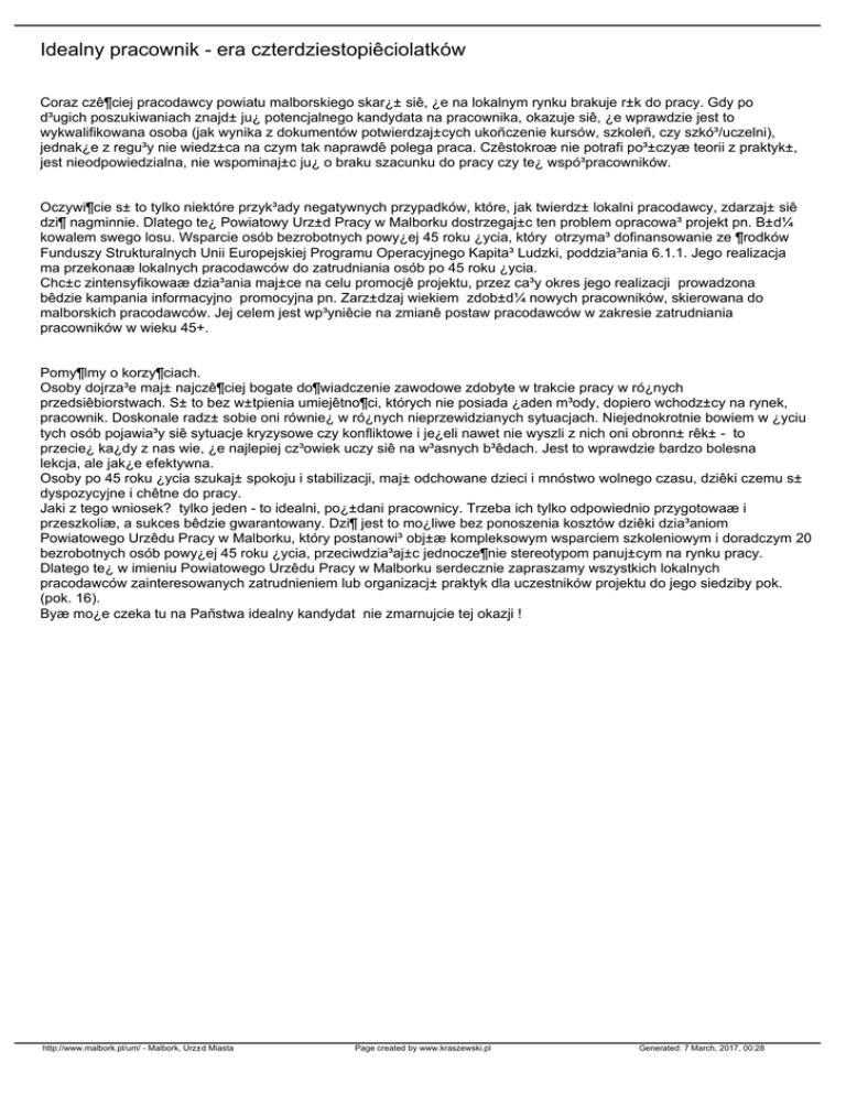 Idealny pracownik - era czterdziestopiêciolatków Coraz czê¶ciej pracodawcy powiatu malborskiego skar¿± siê, ¿e na lokalnym rynku brakuje r±k do pracy. Gdy po d³ugich poszukiwaniach znajd± ju¿ potencjalnego kandydata na pracownika, okazuje siê, ¿e wprawdzie jest to wykwalifikowana osoba (jak wynika z dokumentów potwierdzaj±cych ukoñczenie kursów, szkoleñ, czy szkó³/uczelni), jednak¿e z regu³y nie wiedz±ca na czym tak naprawdê polega praca. Czêstokroæ nie potrafi po³±czyæ teorii z praktyk±, jest nieodpowiedzialna, nie wspominaj±c ju¿ o braku szacunku do pracy czy te¿ wspó³pracowników. Oczywi¶cie s± to tylko niektóre przyk³ady negatywnych przypadków, które, jak twierdz± lokalni pracodawcy, zdarzaj± siê dzi¶ nagminnie. Dlatego te¿ Powiatowy Urz±d Pracy w Malborku dostrzegaj±c ten problem opracowa³ projekt pn. B±d¼ kowalem swego losu. Wsparcie osób bezrobotnych powy¿ej 45 roku ¿ycia, który otrzyma³ dofinansowanie ze ¶rodków Funduszy Strukturalnych Unii Europejskiej Programu Operacyjnego Kapita³ Ludzki, poddzia³ania 6.1.1. Jego realizacja ma przekonaæ lokalnych pracodawców do zatrudniania osób po 45 roku ¿ycia. Chc±c zintensyfikowaæ dzia³ania maj±ce na celu promocjê projektu, przez ca³y okres jego realizacji prowadzona bêdzie kampania informacyjno promocyjna pn. Zarz±dzaj wiekiem zdob±d¼ nowych pracowników, skierowana do malborskich pracodawców. Jej celem jest wp³yniêcie na zmianê postaw pracodawców w zakresie zatrudniania pracowników w wieku 45+. Pomy¶lmy o korzy¶ciach. Osoby dojrza³e maj± najczê¶ciej bogate do¶wiadczenie zawodowe zdobyte w trakcie pracy w ró¿nych przedsiêbiorstwach. S± to bez w±tpienia umiejêtno¶ci, których nie posiada ¿aden m³ody, dopiero wchodz±cy na rynek, pracownik. Doskonale radz± sobie oni równie¿ w ró¿nych nieprzewidzianych sytuacjach. Niejednokrotnie bowiem w ¿yciu tych osób pojawia³y siê sytuacje kryzysowe czy konfliktowe i je¿eli nawet nie wyszli z nich oni obronn± rêk± - to przecie¿ ka¿dy z nas wie, ¿e najlepiej cz³owiek uczy siê na w³asnych b³êdach. Jest to wprawdzie bardzo bolesna lekcja, ale jak¿e efektywna. Osoby po 45 roku ¿ycia szukaj± spokoju i stabilizacji, maj± odchowane dzieci i mnóstwo wolnego czasu, dziêki czemu s± dyspozycyjne i chêtne do pracy. Jaki z tego wniosek? tylko jeden - to idealni, po¿±dani pracownicy. Trzeba ich tylko odpowiednio przygotowaæ i przeszkoliæ, a sukces bêdzie gwarantowany. Dzi¶ jest to mo¿liwe bez ponoszenia kosztów dziêki dzia³aniom Powiatowego Urzêdu Pracy w Malborku, który postanowi³ obj±æ kompleksowym wsparciem szkoleniowym i doradczym 20 bezrobotnych osób powy¿ej 45 roku ¿ycia, przeciwdzia³aj±c jednocze¶nie stereotypom panuj±cym na rynku pracy. Dlatego te¿ w imieniu Powiatowego Urzêdu Pracy w Malborku serdecznie zapraszamy wszystkich lokalnych pracodawców zainteresowanych zatrudnieniem lub organizacj± praktyk dla uczestników projektu do jego siedziby pok. (pok. 16). Byæ mo¿e czeka tu na Pañstwa idealny kandydat nie zmarnujcie tej okazji ! http://www.malbork.pl/um/ - Malbork, Urz±d Miasta Page created by www.kraszewski.pl Generated: 7 March, 2017, 00:28