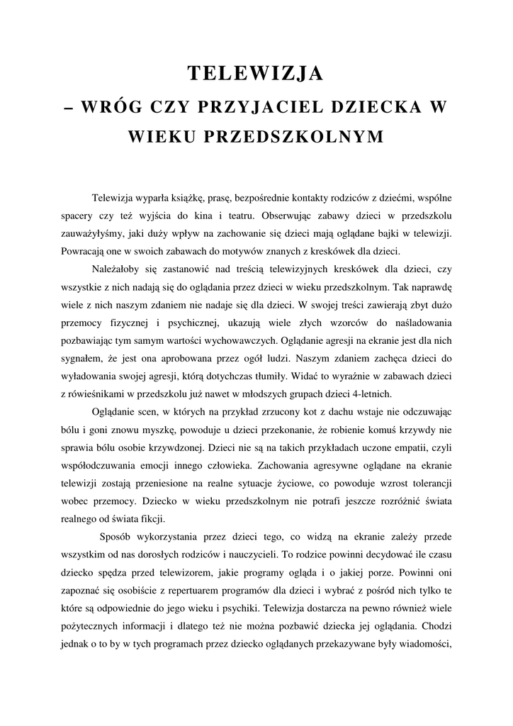 TELEWIZJA – WRÓG CZY PR ZYJAC IEL D ZIECKA W W I EKU PRZED S ZK OLNYM Telewizja wyparła książkę, prasę, bezpośrednie kontakty rodziców z dziećmi, wspólne spacery czy też wyjścia do kina i teatru. Obserwując zabawy dzieci w przedszkolu zauważyłyśmy, jaki duży wpływ na zachowanie się dzieci mają oglądane bajki w telewizji. Powracają one w swoich zabawach do motywów znanych z kreskówek dla dzieci. Należałoby się zastanowić nad treścią telewizyjnych kreskówek dla dzieci, czy wszystkie z nich nadają się do oglądania przez dzieci w wieku przedszkolnym. Tak naprawdę wiele z nich naszym zdaniem nie nadaje się dla dzieci. W swojej treści zawierają zbyt dużo przemocy fizycznej i psychicznej, ukazują wiele złych wzorców do naśladowania pozbawiając tym samym wartości wychowawczych. Oglądanie agresji na ekranie jest dla nich sygnałem, że jest ona aprobowana przez ogół ludzi. Naszym zdaniem zachęca dzieci do wyładowania swojej agresji, którą dotychczas tłumiły. Widać to wyraźnie w zabawach dzieci z rówieśnikami w przedszkolu już nawet w młodszych grupach dzieci 4-letnich. Oglądanie scen, w których na przykład zrzucony kot z dachu wstaje nie odczuwając bólu i goni znowu myszkę, powoduje u dzieci przekonanie, że robienie komuś krzywdy nie sprawia bólu osobie krzywdzonej. Dzieci nie są na takich przykładach uczone empatii, czyli współodczuwania emocji innego człowieka. Zachowania agresywne oglądane na ekranie telewizji zostają przeniesione na realne sytuacje życiowe, co powoduje wzrost tolerancji wobec przemocy. Dziecko w wieku przedszkolnym nie potrafi jeszcze rozróżnić świata realnego od świata fikcji. Sposób wykorzystania przez dzieci tego, co widzą na ekranie zależy przede wszystkim od nas dorosłych rodziców i nauczycieli. To rodzice powinni decydować ile czasu dziecko spędza przed telewizorem, jakie programy ogląda i o jakiej porze. Powinni oni zapoznać się osobiście z repertuarem programów dla dzieci i wybrać z pośród nich tylko te które są odpowiednie do jego wieku i psychiki. Telewizja dostarcza na pewno również wiele pożytecznych informacji i dlatego też nie można pozbawić dziecka jej oglądania. Chodzi jednak o to by w tych programach przez dziecko oglądanych przekazywane były wiadomości, które stwarzają pozytywne emocje, atmosferę dobrej zabawy i radości. A w ten sposób równocześnie zapewniamy dziecku w wieku przedszkolnym kształtowanie wielu pozytywnych nastawień i pokazanie wartościowych społecznie pożądanych postaw. Dlatego dużą rolę widzimy w tym, aby zachęcać dzieci i ich rodziców do oglądania tylko tych programów, które będą pozytywnie oddziaływały na dzieci. W naszej pracy wychowawczo-dydaktycznej chcemy także zachęcać dzieci do korzystania z innych form spędzania wolnego czasu. Zwrócimy także uwagę na zainteresowanie dzieci naszą piękną literaturą dziecięcą. Mamy nadzieję, że każdy, komu leży dobro dziecka na sercu, po przeczytaniu tego referatu, będzie zwracał od tej pory uwagę na to, co jego dziecko ogląda w telewizji i ile czasu spędza przed ekranem. Proponujemy również, wspólnie spędzać z dzieckiem ten czas przed telewizorem i po wspólnie obejrzanej bajce, poświęcić chwilę czasu na jej objaśnienie, skomentowanie i zaznaczenie pozytywnych postaw. Duże znaczenie dla dziecka będzie miało także organizowanie w inny sposób jego wolnego czasu, które na pewno pogłębi naszą więź emocjonalną z dzieckiem, czy to przez wspólny spacer, czy też przez wspólne czytanie literatury dziecięcej, czy też na przykład przez zorganizowanie wyjścia do kina, lub muzeum. Dziekujemy