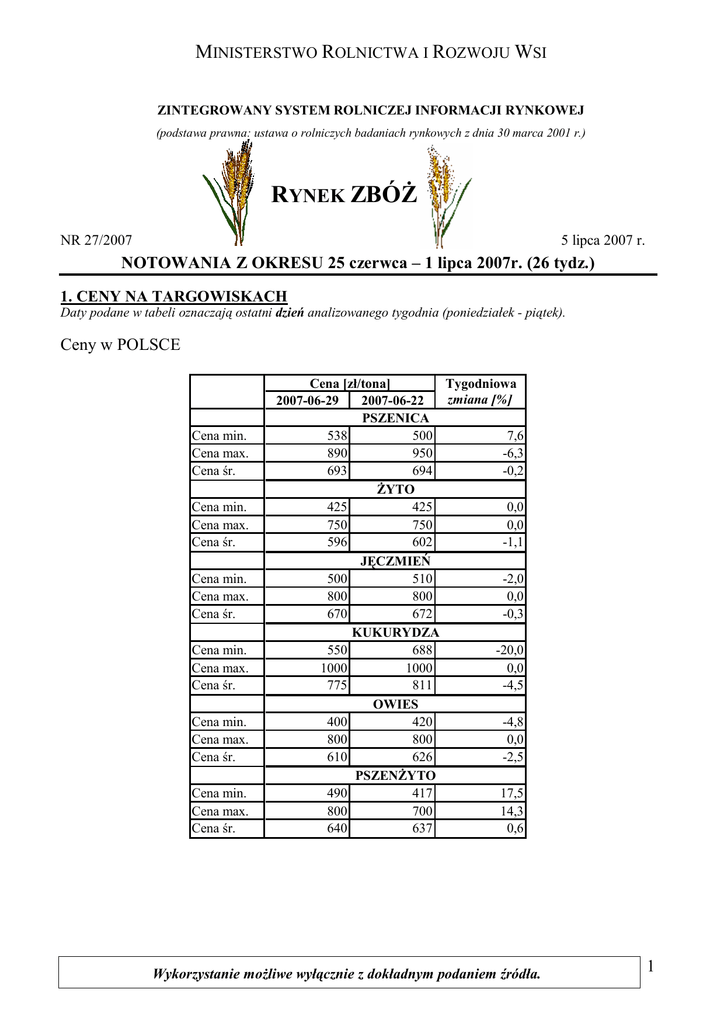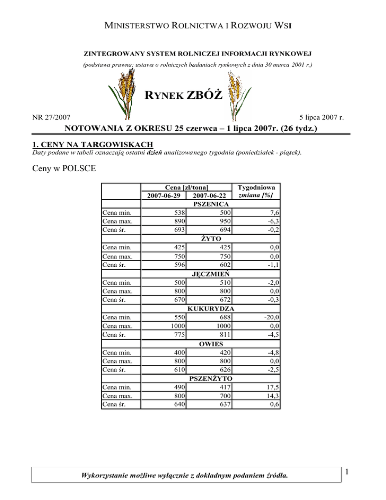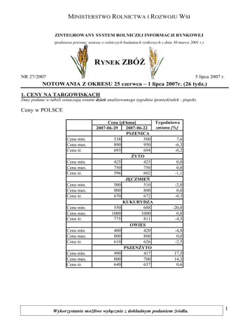 MINISTERSTWO ROLNICTWA I ROZWOJU WSI ZINTEGROWANY SYSTEM ROLNICZEJ INFORMACJI RYNKOWEJ (podstawa prawna: ustawa o rolniczych badaniach rynkowych z dnia 30 marca 2001 r.) RYNEK ZBÓŻ NR 27/2007 5 lipca 2007 r. NOTOWANIA Z OKRESU 25 czerwca – 1 lipca 2007r. (26 tydz.) 1. CENY NA TARGOWISKACH Daty podane w tabeli oznaczają ostatni dzień analizowanego tygodnia (poniedziałek - piątek). Ceny w POLSCE Cena min. Cena max. Cena śr. Cena min. Cena max. Cena śr. Cena min. Cena max. Cena śr. Cena min. Cena max. Cena śr. Cena min. Cena max. Cena śr. Cena min. Cena max. Cena śr. Cena [zł/tona] Tygodniowa zmiana [%] 2007-06-29 2007-06-22 PSZENICA 538 500 7,6 890 950 -6,3 693 694 -0,2 ŻYTO 425 425 0,0 750 750 0,0 596 602 -1,1 JĘCZMIEŃ 500 510 -2,0 800 800 0,0 670 672 -0,3 KUKURYDZA 550 688 -20,0 1000 1000 0,0 775 811 -4,5 OWIES 400 420 -4,8 800 800 0,0 610 626 -2,5 PSZENŻYTO 490 417 17,5 800 700 14,3 640 637 0,6 Wykorzystanie możliwe wyłącznie z dokładnym podaniem źródła. 1 Średnie ceny na targowiskach wg WOJEWÓDZTW. WOJEWÓDZTWO Dolnośląskie Kujawsko-Pomorskie Lubelskie Lubuskie Łódzkie Małopolskie Mazowieckie Podkarpackie Podlaskie Pomorskie Śląskie Świętokrzyskie Warmińsko-Mazurskie Wielkopolskie Zachodniopomorskie PSZENICA Cena [zł/tona] Tygodniowa 2007-06- 2007-06- zmiana ceny 29 22 [%] 605 605 0,0 680 643 5,7 656 651 0,8 700 700 0,0 713 703 1,4 693 673 2,8 697 719 -3,1 733 731 0,3 675 708 -4,7 700 667 5,0 781 796 -1,9 660 663 -0,4 625 600 4,2 694 687 1,1 618 590 4,7 ŻYTO JĘCZMIEŃ Cena [zł/tona] Tygodniowa Cena [zł/tona] Tygodniowa 2007-06- 2007-06- zmiana ceny 2007-06- 2007-06- zmiana ceny 29 22 29 22 [%] [%] 540 540 0,0 620 620 0,0 600 600 0,0 667 640 4,2 580 625 -7,2 630 658 -4,4 ---550 600 -8,3 583 622 -6,2 680 681 -0,2 750 650 15,4 698 666 4,7 587 612 -4,1 693 718 -3,5 580 605 -4,1 650 654 -0,6 579 583 -0,6 663 680 -2,6 -500 -630 600 5,0 -600 -728 704 3,4 617 605 1,9 641 646 -0,9 ---700 700 0,0 678 631 7,3 700 663 5,5 425 425 0,0 530 530 -- KUKURYDZA OWIES PSZENŻYTO Tygodniowa Cena [zł/tona] Tygodniowa Cena [zł/tona] Tygodniowa Cena [zł/tona] 2007-06- 2007-06- zmiana ceny 2007-06- 2007-06- zmiana ceny 2007-06- 2007-06- zmiana ceny 29 22 29 22 29 22 [%] [%] [%] Dolnośląskie 700 710 -1,4 600 600 0,0 620 610 1,6 Kujawsko-Pomorskie ---635 700 -9,3 670 640 4,7 Lubelskie 800 --578 600 -3,6 647 665 -2,7 Lubuskie ---500 500 0,0 550 600 -8,3 Łódzkie 800 800 0,0 628 633 -0,8 677 663 2,2 Małopolskie 700 700 0,0 705 675 4,4 740 --Mazowieckie 794 875 -9,2 630 680 -7,3 642 664 -3,2 Podkarpackie 725 815 -11,0 580 563 3,1 580 620 -6,5 Podlaskie ---588 600 -1,9 616 608 1,4 Pomorskie ---550 550 0,0 600 600 0,0 Śląskie 817 821 -0,5 700 751 -6,8 715 700 2,1 Świętokrzyskie 678 688 -1,4 589 558 5,7 665 559 19,1 Warmińsko-Mazurskie ---500 420 19,0 550 500 10,0 Wielkopolskie 800 800 0,0 650 650 0,0 661 648 2,0 Zachodniopomorskie ---410 420 -490 490 -WOJEWÓDZTWO Uwaga! Dane szczegółowe z poszczególnych targowisk znajdują się w pliku excela. zł/tona Średnie ceny zbóż na targowiskach 850 800 750 700 650 600 550 07-05- 07-0511 18 07-05- 07-0625 01 pszenica kukurydza 07-06- 07-06- 07-06- 07-0608 15 22 29 żyto owies jęczmień pszenżyto Wykorzystanie możliwe wyłącznie z dokładnym podaniem źródła. 2 2. Średnie ceny (bez VAT) w przedsiębiorstwach prowadzących: ZAKUPY ZBÓŻ Daty podane w tabeli oznaczają ostatni dzień analizowanego tygodnia (poniedziałek - niedziela). POLSKA TOWAR Rodzaj ZIARNA Tygodn. zmiana ceny [%] Cena [zł/tona] 2007-07-01 2007-06-24 Pszenica Żyto Jęczmień Kukurydza Owies Pszenżyto konsumpcyjne paszowe konsumpcyjne paszowe konsumpcyjne paszowe browarniane paszowe konsumpcyjne paszowe paszowe 597 555 565 520 492 548 607 577 548 nld 542 597 572 568 547 504 557 622 586 551 625 -564 Strukt. obrot. [%] 2007-07-01 2007-06-24 -0,1 -2,9 -0,5 -5,0 -2,5 -1,6 -2,4 -1,6 -0,5 -4,0 30,8 27,7 1,5 0,3 0,5 5,0 6,0 27,7 0,2 0,1 0,3 44,4 18,0 1,6 0,8 0,2 5,3 1,5 27,4 0,1 0,1 0,6 Średnie ceny zbóż KONSUMPCYJNYCH w przedsiębiorstwach zł/tona 725 675 625 575 525 475 3 0 7 3 0 7 4 1 5-1 5-2 5-2 6-0 6-1 6-1 6-2 7-0 0 0 0 0 0 0 0 0 07 07 07 07 07 07 07 07 20 20 20 20 20 20 20 20 Pszenica Jęczmień Żyto Jęczmień brow arny Wykorzystanie możliwe wyłącznie z dokładnym podaniem źródła. 3 Średnie ceny zbóż PASZOWYCH w przedsiębiorstwach zł/tona 625 600 575 550 525 500 -13 -20 - 27 -03 -10 -17 -24 - 01 -05 -05 -05 -06 -06 -06 -06 -07 7 7 7 7 7 7 7 7 0 0 0 0 0 0 0 0 20 20 20 20 20 20 20 20 Żyto Pszenżyto Pszenica Kukurydza TOWAR 2007-07-01 2007-06-24 Pszenica Żyto Jęczmień Kukurydza Owies Pszenżyto konsumpcyjne paszowe konsumpcyjne paszowe konsumpcyjne paszowe browarniane paszowe konsumpcyjne paszowe paszowe MAKROREGION Południowy Tygodn. Cena [zł/tona] zmiana ceny [%] Centralno-Wschodni Tygodn. Cena [zł/tona] zmiana ceny [%] Rodzaj ZIARNA 572 577 558 nld nld 535 nld --588 nld 574 nld -nld 2007-07-01 2007-06-24 595 587 586 -nld -3,9 -1,8 -4,8 nld ---9,1 -- -600 -nld nld Jęczmień nld -nld 2007-07-01 2007-06-24 599 543 nld --nld 581 556 -4,3 ---- 598 549 -0,1 1,1 601 549 569 521 492 550 606 nld 583 ----600 554 nld --- Północno-Zachodni Tygodn. Cena [zł/tona] zmiana ceny [%] -3,2 0,3 ---- nld nld nld 546 596 571 537 547 509 549 -584 488 --566 0,7 -3,8 6,0 -4,7 -3,2 0,1 -0,2 -3,6 nld - niewystarczająca liczba danych do prezentacji. Zestawienie średnich cen ziarna importowanego z krajów Unii Europejskiej: pszenica konsumpcyjna pszenica paszowa kukurydza paszowa 598,6 zł/tona; 557,4 zł/tona; 519,8 zł/tona; MAKROREGIONY Nazwa makroregionu Województwa wchodzące w skład makroregionu centralno-wschodni lubelskie, łódzkie, mazowieckie, podlaskie, warmińsko-mazurskie. południowy dolnośląskie, małopolskie, opolskie, podkarpackie, śląskie, świętokrzyskie. północno-zachodni kujawsko-pomorskie, lubuskie, pomorskie, wielkopolskie, zachodnio-pomorskie. Wykorzystanie możliwe wyłącznie z dokładnym podaniem źr