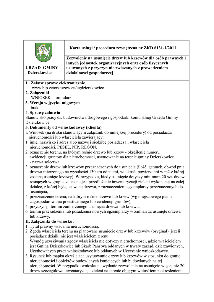 Karta usługi / procedura zewnętrzna nr ZKD 6131-1/2011 URZAD GMINY Dzierzkowice Zezwolenie na usunięcie drzew lub krzewów dla osób prawnych i innych jednostek organizacyjnych oraz osób fizycznych usuwanych z przyczyn nie związanych z prowadzeniem działalności gospodarczej 1 . Załatw sprawę elektronicznie www.bip.zetorzeszow.eu/ugdzierzkowice 2. Załączniki WNIOSEK - formularz 3. Wersja w języku migowym brak 4. Sprawę załatwia Stanowisko pracy ds. budownictwa drogowego i gospodarki komunalnej Urzędu Gminy Dzierzkowice 5. Dokumenty od wnioskodawcy (klienta) I. Wniosek (na druku stanowiącym załącznik do niniejszej procedury) od posiadacza nieruchomości lub właściciela zawierający: 1. imię, nazwisko i adres albo nazwę i siedzibę posiadacza i właściciela nieruchomości, PESEL, NIP, REGON, 2. oznaczenie terenu, na którym rośnie drzewo lub krzew - określenie numeru ewidencji gruntów dla nieruchomości, usytuowanie na terenie gminy Dzierzkowice - nazwa sołectwa 3. oznaczenie drzew lub krzewów przeznaczonych do usunięcia (ilość, gatunek, obwód pnia drzewa mierzonego na wysokości 130 cm od ziemi, wielkość powierzchni w m2 z której zostaną usunięte krzewy). W przypadku, kiedy usunięcie dotyczy minimum 20 szt. drzew rosnących w grupie, zalecane jest przedłoŜenie inwentaryzacji zieleni wykonanej na całej działce, z której będą usuwane drzewa, z zaznaczeniem egzemplarzy przeznaczonych do usunięcia, 4. przeznaczenie terenu, na którym rośnie drzewo lub krzew (wg miejscowego planu zagospodarowania przestrzennego lub ewidencji gruntów), 5. przyczynę i termin zamierzonego usunięcia drzewa lub krzewu, 6. termin przesadzenia lub posadzenia nowych egzemplarzy w zamian za usunięte drzewa lub krzewy. II. Załączniki do wniosku: 1. Tytuł prawny władania nieruchomością. 2. Zgoda właściciela terenu na planowane usunięcie drzew lub krzewów (oryginał) jeŜeli posiadacz działki nie jest właścicielem terenu.. Wymóg uzyskiwania zgody właściciela nie dotyczy nieruchomości, gdzie właścicielem jest Gmina Dzierzkowice lub Skarb Państwa oddanych w trwały zarząd, dzierŜawionych, UŜytkowanych przez wnioskodawcę lub oddanych w UŜyczenie wnioskodawcy. 3. Rysunek lub mapka określająca usytuowanie drzew lub krzewów w stosunku do granic nieruchomości i obiektów budowlanych istniejących lub budowlanych na tej nieruchomości. W przypadku wniosku na wydanie zezwolenia na usunięcie więcej niŜ 20 drzew szczegółowa inwentaryzacja zieleni na terenie objętym wnioskiem z określeniem: 1). gatunków drzew i krzewów, 2). obwodu pnia na wysokości 130 cm od ziemi, 3). wysokości i zasięgu korony drzew, 4). powierzchni pokrytej krzewami w m2, 5). stanu zdrowotnego zieleni w ocenie wnioskodawcy oraz zaznaczeniem drzew i krzewów przeznaczonych do usunięcia. 4. Dokument zawierający podpisy wszystkich współwłaścicieli terenu lub pełnomocnictwo do ich reprezentowania (oryginał lub kserokopia) w przypadku, gdy teren stanowi współwłasność. 5. Od zarządcy cieku wodnego oświadczenie o zamiarze wykonania modernizacji cieku wodnego oraz zgodę właścicieli działek (oryginał) na usunięcie drzew lub krzewów z ich terenu w przypadku, gdy działka, z której są usuwane drzewa i krzewy nie jest własnością zarządcy cieku. 6. W przypadku działania przez przedstawiciela naleŜy dołączyć pełnomocnictwo do reprezentowania wnioskodawcy. III. Dokumenty wymagane w postępowaniu w przypadku prowadzenia inwestycji przez osoby fizyczne na cele niezwiązane z prowadzeniem działalności gospodarczej naleŜy przedłoŜyć: 1. Kserokopia ostatecznej decyzji pozwolenia na budowę, a w przypadku robót, dla których decyzja pozwolenia na budowę nie jest wymagana oświadczenie o zamiarze wykonania robót budowlanych na podstawie zgłoszenia. 2. Szczegółową inwentaryzację zieleni na terenie objętym inwestycją wykonaną na kopii aktualnej mapy zasadniczej obejmującej projekt zagospodarowania terenu objętego inwestycją (a w szczególności układ istniejących i projektowanych obiektów budowlanych i sieci uzbrojenia terenu) ze wskazaniem zaistniałych kolizji drzew lub krzewów z tą inwestycją, wraz z częścią opisową. 3. Projekt zieleni dla terenu objętego inwestycją sporządzony na kopii mapy zasadniczej. 6. Opłaty 1. Opłata skarbowa od złoŜenia dokumentu stwierdzającego udzielenie pełnomocnictwa lub prokury albo jego odpisu, wypisu lub kopii wynosi 17 zł (z wyłączeniem pełnomocnictwa udzielanego małŜonkowi, wstępnemu, zstępnemu lub rodzeństwu, lub gdy mocodawcą jest podmiot zwolniony z opłaty skarbowej). Wpłat z tytułu opłaty skarbowej moŜna dokonywać na rachunek bankowy Urzędu Gminy Dzierzkowice (np. na poczcie, przelewem bankowym) lub bez ponoszenia dodatkowych opłat w kasie Urzędu Gminy Dzierzkowice . Dowód zapłaty naleŜnej opłaty skarbowej naleŜy załączyć do pełnomocnictwa z informacją jakiej dotyczy sprawy. NUMER KONTA Opłata skarbowa – 72 8717 1019 2004 4000 0039 0003 7. Forma załatwienia Zezwolenie lub odmowa wydania zezwolenia (w formie decyzji administracyjnej) na usunięcie drzew lub krzewów. 8. Termin załatwienia W ciągu miesiąca, a w sprawie szczególnie skomplikowanej w ciągu dwóch miesięcy od dnia złoŜenia kompletnego wniosku. 9. Dokumenty uzyskiwane w postępowaniu 1. Protokół z oględzin w terenie lub rozprawy administracyjnej w terenie z udziałem stron. 2. Zgoda właściciela - Gminy Dzierzkowice lub Skarb Państwa w przypadku nieruchomości będących własnością Gminy Dzierzkowice lub Skarb Państwa oddanych w trwały zarząd, dzierŜawionych, UŜytkowanych przez wnioskodawcę lub oddanych w UŜyczenie wnioskodawcy. 3. Zgoda regionalnego dyrektora ochrony środowiska w przypadku wydawania zezwolenia na usunięcie drzew lub krzewów na obszarach objętych ochroną krajobrazową w granicach rezerwatu przyrody. 4. Uzgodnienie z regionalnym dyrektorem ochrony śr