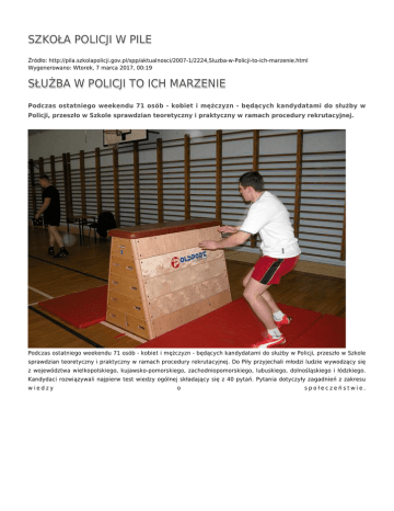 SZKOŁA POLICJI W PILE Źródło: http://pila.szkolapolicji.gov.pl/spp/aktualnosci/2007-1/2224,Sluzba-w-Policji-to-ich-marzenie.html Wygenerowano: Wtorek, 7 marca 2017, 00:19 SŁUŻBA W POLICJI TO ICH MARZENIE Podczas ostatniego weekendu 71 osób - kobiet i mężczyzn - będących kandydatami do służby w Policji, przeszło w Szkole sprawdzian teoretyczny i praktyczny w ramach procedury rekrutacyjnej. Podczas ostatniego weekendu 71 osób - kobiet i mężczyzn - będących kandydatami do służby w Policji, przeszło w Szkole sprawdzian teoretyczny i praktyczny w ramach procedury rekrutacyjnej. Do Piły przyjechali młodzi ludzie wywodzący się z województwa wielkopolskiego, kujawsko-pomorskiego, zachodniopomorskiego, lubuskiego, dolnośląskiego i łódzkiego. Kandydaci rozwiązywali najpierw test wiedzy ogólnej składający się z 40 pytań. Pytania dotyczyły zagadnień z zakresu wiedzy o społeczeństwie. Uzyskanie minimum 25 punktów uprawniało do wzięcia udziału następnym etapie - teście sprawności fizycznej. Test ten polegał na pokonaniu toru przeszkód. Przebiegnięcie toru w czasie maksymalnie 1 minuty i 45 sekund, gwarantowało zaliczenie tej części procedury doborowej. Organizację i przebieg sprawdzianów obserwował przedstawiciel Biura Kadr i Szkolenia KGP. Informacje na temat wymogów formalnych, zakresu i przebiegu rekrutacji można uzyskać na www.policja.pl/rekrutacja. (20.01.07) Ocena: 0/5 (0) Tweetnij