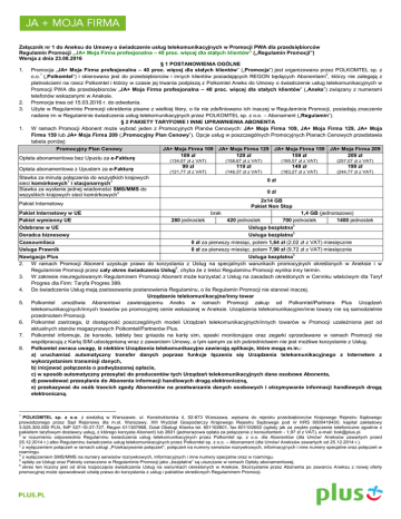 Załącznik nr 1 do Aneksu do Umowy o świadczenie usług telekomunikacyjnych w Promocji PWA dla przedsiębiorców Regulamin Promocji „JA+ Moja Firma profesjonalna – 40 proc. więcej dla stałych klientów” („Regulamin Promocji”) Wersja z dnia 23.08.2016 § 1 POSTANOWIENIA OGÓLNE 1. Promocja „JA+ Moja Firma profesjonalna – 40 proc. więcej dla stałych klientów” („Promocja”) jest organizowana przez POLKOMTEL sp. z o.o.1 („Polkomtel”) i skierowana jest do przedsiębiorców i innych klientów posiadających REGON będących Abonentami2, którzy nie zalegają z płatnościami na rzecz Polkomtel i którzy w czasie jej trwania podpiszą z Polkomtel Aneks do Umowy o świadczenie usług telekomunikacyjnych w Promocji PWA dla przedsiębiorców „JA+ Moja Firma profesjonalna – 40 proc. więcej dla stałych klientów” („Aneks”) związany z numerami telefonów wskazanymi w Aneksie. 2. Promocja trwa od 15.03.2016 r. do odwołania. 3. Użyte w Regulaminie Promocji określenia pisane z wielkiej litery, o ile nie zdefiniowano ich inaczej w Regulaminie Promocji, posiadają znaczenie nadane im w Regulaminie świadczenia usług telekomunikacyjnych przez POLKOMTEL sp. z o.o. – Abonament („Regulamin”). § 2 PAKIETY TARYFOWE I INNE UPRAWNIENIA ABONENTA 1. W ramach Promocji Abonent może wybrać jeden z Promocyjnych Planów Cenowych: JA+ Moja Firma 109, JA+ Moja Firma 129, JA+ Moja Firma 159 lub JA+ Moja Firma 209 („Promocyjny Plan Cenowy”). Opcje usług w poszczególnych Promocyjnych Planach Cenowych przedstawia tabela poniżej: Promocyjny Plan Cenowy JA+ Moja Firma 109 JA+ Moja Firma 129 JA+ Moja Firma 159 JA+ Moja Firma 209 109 zł 129 zł 159 zł 209 zł Opłata abonamentowa bez Upustu za e-Fakturę Opłata abonamentowa z Upustem za e-Fakturę Stawka za minutę połączenia do wszystkich krajowych sieci komórkowych3 i stacjonarnych3 Stawka za wysłanie jednej wiadomości SMS/MMS do wszystkich krajowych sieci komórkowych4 Pakiet Internetowy (134,07 zł z VAT) (158,67 zł z VAT) (195,57 zł z VAT) 99 zł 119 zł 149 zł (257,07 zł z VAT) 199 zł (121,77 zł z VAT) (146,37 zł z VAT) (183,27 zł z VAT) (244,77 zł z VAT) 0 zł 0 zł 2x14 GB Pakiet Non Stop Pakiet Internetowy w UE 1,4 GB (jednorazowo) brak Pakiet wymienny UE 280 jednostek 420 jednostek 700 jednostek 1400 jednostek Odebrane w UE Usługa bezpłatna5 Doradca biznesowy Usługa bezpłatna5 Czasoumilacz 0 zł za pierwszy miesiąc, potem 1,64 zł (2,02 zł z VAT) miesięcznie Usługa Prawnik 0 zł za pierwszy miesiąc, potem 7,90 zł (9,72 zł z VAT) miesięcznie Nawigacja Plus Usługa bezpłatna5 2. W ramach Promocji Abonent uzyskuje prawo do korzystania z Usług na specjalnych warunkach promocyjnych określonych w Aneksie i w Regulaminie Promocji przez cały okres świadczenia Usług6, chyba że z treści Regulaminu Promocji wynika inny termin. 3. W zakresie nieuregulowanym Regulaminem Promocji Abonent może korzystać z Usług na zasadach określonych w Cenniku właściwym dla Taryf Progres dla Firm: Taryfa Progres 399. 4. Do świadczenia Usług mają zastosowanie postanowienia Regulaminu, o ile Regulamin Promocji nie stanowi inaczej. Urządzenie telekomunikacyjne/inny towar 5. Polkomtel umożliwia Abonentowi zawierającemu Aneks w ramach Promocji zakup od Polkomtel/Partnera Plus Urządzeń telekomunikacyjnych/innych towarów po promocyjnej cenie wskazanej w Aneksie. Urządzenia telekomunikacyjne/inne towary nie są samodzielnie przedmiotem Promocji. 6. Polkomtel zastrzega, iż dostępność poszczególnych modeli Urządzeń telekomunikacyjnych/innych towarów w Promocji uzależniona jest od aktualnych stanów magazynowych Polkomtel/Partnerów Plus. 7. Polkomtel informuje, że konsole, tablety bez gniazda na kartę sim, opaski monitorujące oraz zegarki sprzedawane w ramach Promocji nie współpracują z Kartą SIM udostępnianą wraz z zawarciem Umowy, a tym samym za ich pośrednictwem nie jest możliwe korzystanie z Usług. 8. Polkomtel zwraca uwagę, iż niektóre Urządzenia telekomunikacyjne zawierają aplikacje, które mogą m.in.: a) uruchamiać automatyczny transfer danych poprzez funkcje łączenia się Urządzenia telekomunikacyjnego z Internetem z wykorzystaniem transmisji danych, b) inicjować połączenia o podwyższonej opłacie, c) w sposób automatyczny przesyłać do producentów tych Urządzeń telekomunikacyjnych dane osobowe Abonenta, d) powodować przesyłanie do Abonenta informacji handlowych drogą elektroniczną, e) przekazywać do osób trzecich zgody Abonentów na przetwarzanie danych osobowych i otrzymywanie informacji handlowych drogą elektroniczną. 1 POLKOMTEL sp. z o.o. z siedzibą w Warszawie, ul. Konstruktorska 4, 02-673 Warszawa, wpisana do rejestru przedsiębiorców Krajowego Rejestru Sądowego prowadzonego przez Sąd Rejonowy dla m.st. Warszawy, XIII Wydział Gospodarczy Krajowego Rejestru Sądowego pod nr KRS 0000419430, kapitał zakładowy 3.525.300.000 PLN, NIP 527-10-37-727, Regon 011307968, Dział Obsługi Klienta tel. 601102601, fax 601102602 (opłaty jak za zwykłe połączenie telefoniczne zgodnie z pakietem taryfowym dostawcy usług, z którego korzysta Abonent) lub 2601 (jednorazowa opłata za połączenie z konsultantem - 1,97 zł z VAT), e-mail: [email protected]. 2 w rozumieniu odpowiednio Regulaminu świadczenia usług telekomunikacyjnych przez Polkomtel sp. z o.o. dla Abonentów (dla Umów/ Aneksów zawartych przed 25.12.2014 r.) albo Regulaminu świadczenia usług telekomunikacyjnych przez Polkomtel sp. z o.o. – Abonament (dla Umów/ Aneksów zawartych od 25.12.2014 r.). 3 z wyłączeniem połączeń w ramach usługi „Przekazywanie połączeń”, połączeń na numery serwisów rozrywkowych, informacyjnych i inne numery specjalne oraz połączeń w roamingu. 4 z wyłączeniem SMS/MMS na numery serwisów rozrywkowych, informacyjnych i inne numery specjalne oraz w roamingu. 5 opłaty za Usługi oraz Pakiety oznaczone w Regulaminie Promocji jako