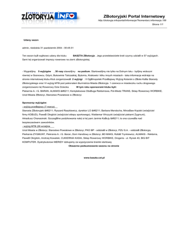 ZBotoryjski Portal Internetowy http://zlotoryja.info/portal/informacje/?komentarz.informacja.199 Strona 1/1 Udany sezon admin, niedziela 31 pazdziernik 2004 - 00:45:31 Ten sezon byB wyjtkowo udany dla klubu BASZTA ZBotoryja . Jego przedstawiciele brali czynny udziaB w 57 wy[cigach. Sami te| organizowali imprezy rowerowe na ziemi zBotoryjskiej. - Wygrali[my 5 wy[cigów , 30 razy stawali[my na podium. Startowali[my nie tylko na Dolnym lsku - byli[my widoczni równie| w Sosnowcu, Gdyni, Bukowinie Tatrzaskiej, Bytomiu, Krakowie i kilku innych miastach - taka informacja widnieje na stronie internetowej klubu.Klub zorganizowaB 2 wy[cigi : II OgBlnopolski PrzeBajowy Wy[cig Kolarski o ZBote KoBa Starosty ZBotoryjskiego oraz VI wy[cig MTB pod patronatem Burmistrza Miasta ZBotoryja. 1 czerwca w miasteczku ruchu drogowego zorganizowano te| Rowerowy Dzie Dziecka. W tym roku sponsorami klubu byli: Piekarnia A. i G. BARAN, ALMAKS – Kompleksowa ObsBuga Reklamowa, Pol-Miedz TRANS, Sklep Rowerowy WORBIKE, Urzd Miasta ZBotoryi, Starostwo Powiatowe w ZBotoryi. Sponsorzy wy[cigów: - wy[cig przeBajowy (7 marca) Starosta ZBotoryjski – Ryszard Raszkiewicz, dyrektor LO – Barbara Mendocha, MirosBaw Kopiski (wóa[ciciel firmy KOBUD), PaweB Okrglicki (wóa[ciciel sklepu sportowego), Waldemar Wrczycki (wóa[ciciel piekarni Zygmunt), Arkadiusz Chanasinski. SzczegBlne podzikowania nale| si te| pani Janinie KaBu|y – to ona czuwaBa nad bezpieczestwem zawodników. - wy[cig MTB (26 wrze[nia Urzd Miasta w ZBotoryi, Starostwo Powiatowe w ZBotoryi, PKO BP - oddziaB w ZBotoryi, PZU S.A. - oddziaB ZBotoryja, Pierkania ZYGMUNT, Piekrania A. i G. Baran, Dom Handlowy w ZBotoryi, BD MAKS, RafaB Trynkiewicz, ALMAKS - Reklama, PaweB Okrglicki, Andrzej Kowalski, CUKIERNIA KASIA, Sklep Rowerowy WORBIKE, Drogeria - ul. Rynek 40, BIG BIT KOMPUTER. Dystrybutorowi MERIDY dzikujemy za wypo|yczenie bramki startowej. Obszerne podsumowanie sezonu na stronie www.baszta.cxt.pl