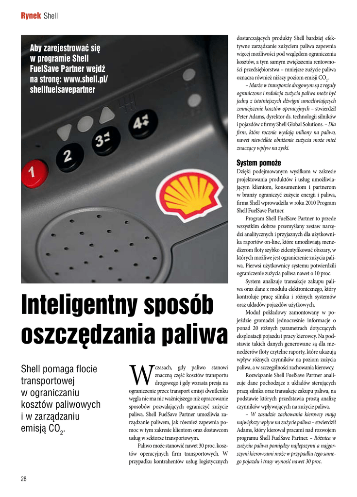 Rynek Shell dostarczających produkty Shell bardziej efektywne zarządzanie zużyciem paliwa zapewnia więcej możliwości pod względem ograniczenia kosztów, a tym samym zwiększenia rentowności przedsiębiorstwa – mniejsze zużycie paliwa oznacza również niższy poziom emisji CO2. – Marże w transporcie drogowym są z reguły ograniczone i redukcja zużycia paliwa może być jedną z istotniejszych dźwigni umożliwiających zmniejszenie kosztów operacyjnych – stwierdził Peter Adams, dyrektor ds. technologii silników i pojazdów z firmy Shell Global Solutions. – Dla firm, które rocznie wydają miliony na paliwo, nawet niewielkie obniżenie zużycia może mieć znaczący wpływ na zyski. Aby zarejestrować się w programie Shell FuelSave Partner wejdź na stronę: www.shell.pl/ shellfuelsavepartner System pomoże Inteligentny sposób oszczędzania paliwa Shell pomaga flocie transportowej w ograniczaniu kosztów paliwowych i w zarządzaniu emisją CO2. 28 W czasach, gdy paliwo stanowi znaczną część kosztów transportu drogowego i gdy wzrasta presja na ograniczenie przez transport emisji dwutlenku węgla nie ma nic ważniejszego niż opracowanie sposobów pozwalających ograniczyć zużycie paliwa. Shell FuelSave Partner umożliwia zarządzanie paliwem, jak również zapewnia pomoc w tym zakresie klientom oraz dostawcom usług w sektorze transportowym. Paliwo może stanowić nawet 30 proc. kosztów operacyjnych firm transportowych. W przypadku kontrahentów usług logistycznych Dzięki podejmowanym wysiłkom w zakresie projektowania produktów i usług umożliwiającym klientom, konsumentom i partnerom w branży ograniczyć zużycie energii i paliwa, firma Shell wprowadziła w roku 2010 Program Shell FuelSave Partner. Program Shell FuelSave Partner to przede wszystkim dobrze przemyślany zestaw narzędzi analitycznych i przyjaznych dla użytkownika raportów on-line, które umożliwiają menedżerom floty szybko zidentyfikować obszary, w których możliwe jest ograniczenie zużycia paliwa. Pierwsi użytkownicy systemu potwierdzili ograniczenie zużycia paliwa nawet o 10 proc. System analizuje transakcje zakupu paliwa oraz dane z modułu elektronicznego, który kontroluje pracę silnika i różnych systemów oraz układów pojazdów użytkowych. Moduł pokładowy zamontowany w pojeździe gromadzi jednocześnie informacje o ponad 20 różnych parametrach dotyczących eksploatacji pojazdu i pracy kierowcy. Na podstawie takich danych generowane są dla menedżerów floty czytelne raporty, które ukazują wpływ różnych czynników na poziom zużycia paliwa, a w szczególności zachowania kierowcy. Rozwiązanie Shell FuelSave Partner analizuje dane pochodzące z układów sterujących pracą silnika oraz transakcje zakupu paliwa, na podstawie których przedstawia prostą analizę czynników wpływających na zużycie paliwa. – W zasadzie zachowania kierowcy mają największy wpływ na zużycie paliwa – stwierdził Adams, który kierował pracami nad rozwojem programu Shell FuelSave Partner. – Różnica w zużyciu paliwa pomiędzy najlepszymi a najgorszymi kierowcami może w przypadku tego samego pojazdu i trasy wynosić nawet 30 proc. Potwierdzają to ostatnie badania przeprowadzone na polecenie CEFIC, Europejskiego organu nadzorującego przemysł chemiczny. Celem badań jest ograniczenie emisji dwutlenku węgla w zakresie przewozów substancji chemicznych. Badania potwierdziły także, że zachowania kierowcy są jednym z głównych czynników mających wpływ na zużycie paliwa, a jednocześnie emisję dwutlenku węgla. Zintegrowane funkcje W pełni zintegrowane funkcje zbierania i analizowania danych zapewniane przez Shell FuelSave Partner umożliwiają zastąpienie wielu różnych systemów monitorujących, eliminując w ten sposób złożone metody zarządzania procesami mającymi na celu ograniczenie zużycia paliwa. Identyfikacja kierowców w systemie wykonywana jest za pomocą cyfrowej łączności z tachografem pojazdu a wszystkie informacje – wraz z wszystkimi zebranymi danymi roboczymi – są przesyłane za pomocą interfejsu GPRS do centralnego serwera, wraz z danymi o lokalizacji GPS. – System zapewnia menedżerom floty pełne i czytelne dane na temat poziomu zużycia paliwa, dostarczając szczegółowe analizy stylów jazdy, w tym również wszelkich zdarzeń dotyczących przekraczania dozwolonej prędkości, gwałtownego hamowania lub przyspieszania, czasu pracy silnika na biegu jałowym, jazdy na luzie, stosowania tempomatu oraz czasu pracy silnika w optymalnym zakresie prędkości z uwzględnieniem warunków drogowych i ładunku – powiedział Adams. – Za pomocą prostych raportów o kierowcy i sygnalizacji drogowej mogą oni monitorować zużycie paliwa, na które bezpośredni wpływ ma zachowanie kierowcy, umożliwiając określenie potencjalnych usprawnień. Informacje te mogą pomóc zapewnić odpowiednie szkolenia dla kierowców oraz mogą być wykorzystane w programach uznaniowych. Oprócz analiz zużycia paliwa, danych o pojeździe i kierowcy, system Shell FuelSave Partner automatycznie generuje również dane o emisji dwutlenku węgla na podstawie zużycia paliwa w formie tonokilometra, ułatwiając obliczanie i zarządzanie poziomem emisji. Na podstawie analizy informacji roboczych system Shell FuelSave Partner pozwala udoskonalić planowanie dostaw, tras przejazdu oraz ilość ładunku, a monitorowanie transakcji zakupu paliwa, poziomu paliwa w zbiorniku i danych o zużyciu paliwa pozwala także zidentyfikować wszelkie nieuczciwe praktyki lub oszustwa. System dla każdego System Shell FuelSave Partner można w łatwy sposób zainstalować w większości pojazdów ciężarowych wyprodukowanych w ciągu ostatnich 10 lat, a moduł sterowania znajduje się w kabinie w pobliżu kierowcy. System nie generuje kosztów początkowych oraz nie wymaga żadnej inwestycji, ponieważ moduł jest dostarczany przez firmę Shell na zasadzie miesi