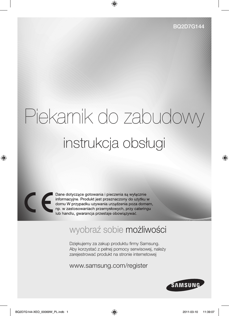 BQ2D7G144 Piekarnik do zabudowy instrukcja obsługi wyobraź sobie możliwości Dziękujemy za zakup produktu firmy Samsung. Aby korzystać z pełnej pomocy serwisowej, należy zarejestrować produkt na stronie internetowej www.samsung.com/register BQ2D7G144-XEO_00069W_PL.indb 1 2011-03-10 11:39:07 korzystanie z instrukcji Dziękujemy za wybór piekarnika do zabudowy firmy SAMSUNG. Niniejsza instrukcja obsługi zawiera ważne informacje dotyczące bezpieczeństwa oraz zalecenia mające na celu pomoc w obsłudze i konserwacji urządzenia. Prosimy o znalezienie czasu na przeczytanie niniejszej instrukcji obsługi przed rozpoczęciem korzystania z piekarnika oraz zachowanie jej na przyszłość. W tekście instrukcji obsługi stosowane są następujące symbole. Ostrzeżenie lub Przestroga Ważne Uwaga instrukcje dotyczące bezpieczeństwa Montaż piekarnika może być wykonywany tylko przez uprawnionego elektryka. Instalator odpowiedzialny jest za podłączenie urządzenia do sieci zgodnie z odpowiednimi zaleceniami dotyczącymi bezpieczeństwa. Bezpieczeństwo elektryczne Jeżeli piekarnik został uszkodzony w czasie transportu, nie wolno go podłączać. • • • • • • • • • Urządzenie może zostać podłączone do sieci zasilającej jedynie przez elektryka posiadającego odpowiednie uprawnienia. W przypadku usterki lub uszkodzenia urządzenia nie wolno go uruchamiać. Naprawy powinny być wykonywane jedynie przez uprawnionego technika. Nieprawidłowo wykonana naprawa może stanowić poważne zagrożenie dla Ciebie oraz innych. Jeżeli piekarnik wymaga naprawy należy skontaktować się z centrum serwisowym SAMSUNG lub sprzedawcą. Ze względów bezpieczeństwa uszkodzony przewód zasilający musi zostać wymieniony na specjalny przewód lub zestaw dostępny u producenta lub w autoryzowanym serwisie. Przewody i kable elektryczne nie mogą dotykać piekarnika. Piekarnik powinien być podłączony do sieci zasilającej za pomocą atestowanego rozłącznika lub bezpiecznika. Nigdy nie wolno korzystać z rozgałęźników ani przedłużaczy. Tabliczka znamionowa znajduje się z prawej strony drzwiczek. Na czas czyszczenia lub naprawy urządzenia należy je odłączyć od zasilania elektrycznego. Zachować ostrożność podczas podłączania urządzeń elektrycznych w pobliżu piekarnika. • Osoby o ograniczonej sprawności fizycznej, sensorycznej lub umysłowej, bądź o niedostatecznym doświadczeniu i wiedzy (np. dzieci) nie powinny korzystać z urządzenia bez nadzoru lub przeszkolenia w zakresie obsługi przez inną osobę odpowiedzialną za ich bezpieczeństwo. OSTRZEŻENIE: Podczas pracy urządzenia łatwo dostępne części mogą się nagrzewać. Aby uniknąć poparzenia, dzieci nie powinny zbliżać się do urządzenia. OSTRZEŻENIE: W celu uniknięcia możliwości porażenia prądem elektrycznym, przed wymianą żarówki, należy wyłączyć zasilanie urządzenia. Podczas pracy piekarnika wewnętrzne powierzchnie silnie się nagrzewają. 2_ korzystanie z instrukcji BQ2D7G144-XEO_00069W_PL.indb 2 2011-03-10 11:39:08 Bezpieczeństwo podczas pracy • • • • • • • • • • • • • • • • • • • Piekarnik zaprojektowany jest jedynie do gotowania żywności stosowanej w gospodarstwie domowym. Podczas pracy wewnętrzne powierzchnie piekarnika rozgrzewają się na tyle, aby spowodować oparzenia. Nie wolno dotykać elementów grzejnych lub wewnętrznych powierzchni piekarnika do czasu ich ostygnięcia. Nie wolno przechowywać materiałów łatwopalnych w piekarniku. Powierzchnie kuchenki nagrzewają się podczas dłuższej pracy urządzenia przy wysokiej temperaturze. Podczas gotowania, w czasie otwierania drzwiczek należy zachować ostrożność, ponieważ może dojść do gwałtownego wydostania się gorącego powietrza i pary. Podczas gotowania potraw zawierających alkohol, może dojść do jego odparowania z powodu wysokiej temperatury i zapalenia się oparów alkoholu w przypadku zetknięcia się oparów z gorącymi częściami piekarnika. Dla własnego bezpieczeństwa nie wolno stosować myjek wysokociśnieniowych ani urządzeń do czyszczenia strumieniem pary. Podczas korzystania z piekarnika należy dopilnować, aby dzieci trzymały się od niego w bezpiecznej odległości. Żywność mrożona taka jak pizza, powinna być pieczona na grillu drucianym. W przypadku korzystania z blach do pieczenia może dojść do ich odkształcenia z powodu różnic temperatury. Nie wolno nalewać wody na dno piekarnika, gdy jest ono gorące. Może to spowodować uszkodzenie powierzchni emaliowanej. W czasie gotowania drzwiczki piekarnika muszą być zamknięte. Zachować ostrożność w przypadku otwierania drzwiczek przed końcem procedury czyszczenia parowego; woda na dnie jest gorąca. Nie wolno wykładać dna piekarnika folią aluminiową i nie wolno na nim umieszczać żadnych blach do pieczenia ani puszek. Folia aluminiowa blokuje przepływ ciepła, co może prowadzić do uszkodzenia emaliowanych powierzchni i spowodować pogorszenie wyników gotowania. Soki owocowe mogą pozostawiać zacieki, które mogą stać się nieusuwalne z emaliowanych powierzchni piekarnika. W przypadku pieczenia bardzo wilgotnych ciast należy użyć głębokiej blachy. Nie wolno stawiać naczyń do pieczenia na otwartych drzwiczkach piekarnika. Niniejsze urządzenie nie jest przeznaczone do używania przez małe dzieci lub osoby niepełnosprawne bez odpowiedniego nadzoru osoby odpowiedzialnej, zapewniającej bezpieczne użytkowanie urządzenia. Należy pilnować, aby małe dzieci nie bawiły się urządzeniem. W przypadku rozlania się większych ilości płynów należy usunąć pozostałości przed samoczyszczeniem, w czasie samoczyszczenia pirolitycznego w piekarniku nie mogą znajdować się żadne przybory kuchenne. Podczas samoczyszczenia powierzchnie rozgrzewają się bardziej niż zwykle i dlatego dzieci powinny znajdować się w bezpiecznej odległości. instr