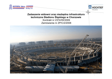Zadaszenie widowni oraz niezbędna infrastruktura techniczna Stadionu Śląskiego w Chorzowie Kontrakt nr 2374/IW/2009 Zamówienie nr ZP/C/2/2008 Zasypy murów oporowych 9 9 Wykonano (do 15.02.2011r.) ~ 33 000m3 P Pozostało t ł ~ 12 000 000m3 3 Wyciągnięcie grodzic stalowych 9 Średnia długość grodzicy – 12mb 9 Łączna długość ścian z grodzic ~ 200 mb Płyta promenady 9Łączna powierzchnia promenady - 13 500m2 9Wykonano ( do 15 15.02.2011) 02 2011) ~ 11 000m2 Wywóz pozostałego urobku z makroniwelacji 9 9 Łączna ilość urobku – 100 000m3 Wywieziono ~ 90 000m3 Naprawa dylatacji nad częścią Administracyjną TW 9 9 Łączna długość dylatacji ~ 3750 mb Wykonano ( do 15.02.2011) ~ 750mb Instalacje mechaniczne, elektryczne, teletechniczne Trybuna Wschodnia - Zachodnia Roboty y pozostałe do wykonania y 9 Montaż krzesełek + uzupełnienie konstrukcji ~ 55 000szt 9 Bariery między sektorami oraz balustrady 9 Posadzki na Trybunie Zachodniej – • Posadzki przemysłowe ~ 15 000m2 • P Posadzki d ki jjastrychowe t h ~ 3 500 500m2 2 9 Roboty wykończeniowe na Trybunie Wschodniej • Sucha zabudowa • T k Tynkowanie i • Malowanie • Sufity podwieszane • Ślusarka drzwiowa i okienna 9 Drogi, elementy zewnętrzne • 9 Ciągi komunikacyjne z betonu asfaltowego ~ 24 000m2 Instalacje teletechniczne • SAP, DSO, SSWiN, KD, CCTV, LAN, IT, Nagłośnienie, TV, BMS 9 Instalacje mechaniczne 9 Instalacje elektryczne Dziękujemy za uwagę
