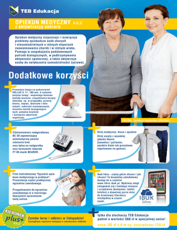 OPIEKUN MEDYCZNY z aktywizacją seniora KKZ Opiekun medyczny rozpoznaje i rozwiązuje problemy opiekuńcze osób chorych i niesamodzielnych o różnych stopniach zaawansowania chorób i w różnym wieku. Pomaga w zaspokajaniu podstawowych potrzeb biologicznych, w podtrzymywaniu aktywności społecznej, a także aktywizuje osoby do zwiększania samodzielności życiowej. Dodatkowe korzyści Przenośna lampa na podczerwień SOLLUX IL 11, 100 wat, 4 ruchome pozycje lampy - wspomaga domowe metody leczenia, uzupełnienia terapię lekarską, np. w przypadku: przeziębienia, napięć, skurczów i bólu mięśni, schorzeń reumatycznych, leczenia chorób laryngologicznych; pobudza krążenie i wzmacnia odporność organizmu. IWONA, Opiekun medyczny (Olsztyn) Ciśnieniomierz nadgarstkowy BC 30 zapewniający automatyczny pomiar ciśnienia krwi oraz tętna na nadgarstku oraz termometr lekarski FT 09 marki BEURER . Film instruktażowy "Egzamin opiekuna medycznego w praktyce". Prezentacja części praktycznej egzaminu zawodowego. Przygotowanie do egzaminu zawodowego w e-learningu. Specjalnie opracowane testy online. KIER UNE plus K KKZ Zamów teraz i odbierz w listopadzie! Szczegółowy regulamin dostępny w sekretariacie oddziału. Strój medyczny: bluza i spodnie a Strój uszyty z wysokiej jakości tkanin (bawełna i poliester, spodnie białe lub granatowe regulowane na gumce). Ibuk libra - czytaj gdzie chcesz i jak chcesz! To bezpłatny całodobowy dostęp do e-czytelni www.libra.ibuk.pl. Będziesz mógł zalogować się z każdego miejsca i urządzenia (komputer, tablet, telefon) o dowolnej porze dnia do branżowej literatury niezbędnej w czasie nauki. tylko dla słuchaczy TEB Edukacja pakiet o wartości 560 zł w specjalnej cenie! cena: 48 zł x 9 m-cy, oszczędzasz 128 zł