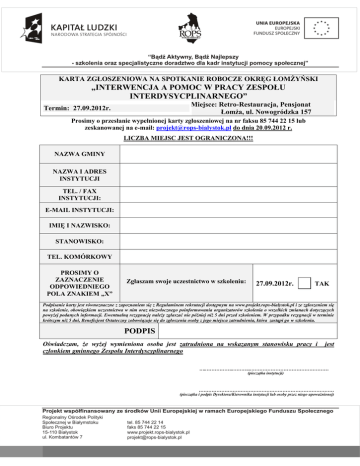 KARTA ZGŁOSZENIOWA NA SPOTKANIE ROBOCZE OKRĘG ŁOMŻYŃSKI „INTERWENCJA A POMOC W PRACY ZESPOŁU INTERDYSYCPLINARNEGO” Miejsce: Retro-Restauracja, Pensjonat Łomża, ul. Nowogródzka 157 Termin: 27.09.2012r. Prosimy o przesłanie wypełnionej karty zgłoszeniowej na nr faksu 85 744 22 15 lub zeskanowanej na e-mail: [email protected] do dnia 20.09.2012 r. LICZBA MIEJSC JEST OGRANICZONA!!! NAZWA GMINY NAZWA I ADRES INSTYTUCJI TEL. / FAX INSTYTUCJI: E-MAIL INSTYTUCJI: IMIĘ I NAZWISKO: STANOWISKO: TEL. KOMÓRKOWY PROSIMY O ZAZNACZENIE ODPOWIEDNIEGO POLA ZNAKIEM „X” Zgłaszam swoje uczestnictwo w szkoleniu: 27.09.2012r. TAK Podpisanie karty jest równoznaczne z zapoznaniem się z Regulaminem rekrutacji dostępnym na www.projekt.rops-bialystok.pl i ze zgłoszeniem się na szkolenie, obowiązkiem uczestnictwa w nim oraz niezwłocznego poinformowania organizatorów szkolenia o wszelkich zmianach dotyczących powyżej podanych informacji. Ewentualną rezygnację należy zgłaszać nie później niż 5 dni przed szkoleniem. W przypadku rezygnacji w terminie krótszym niż 5 dni, Beneficjent Ostateczny zobowiązuje się do zgłoszenia osoby z jego miejsca zatrudnienia, która zastąpi go w szkoleniu. PODPIS Oświadczam, że wyżej wymieniona osoba jest zatrudniona na wskazanym stanowisku pracy i członkiem gminnego Zespołu Interdyscyplinarnego jest …..……………..………...………………………………………… (pieczątka instytucji) ………………………………………………………………………… (pieczątka i podpis Dyrektora/Kierownika instytucji lub osoby przez niego upoważnionej)