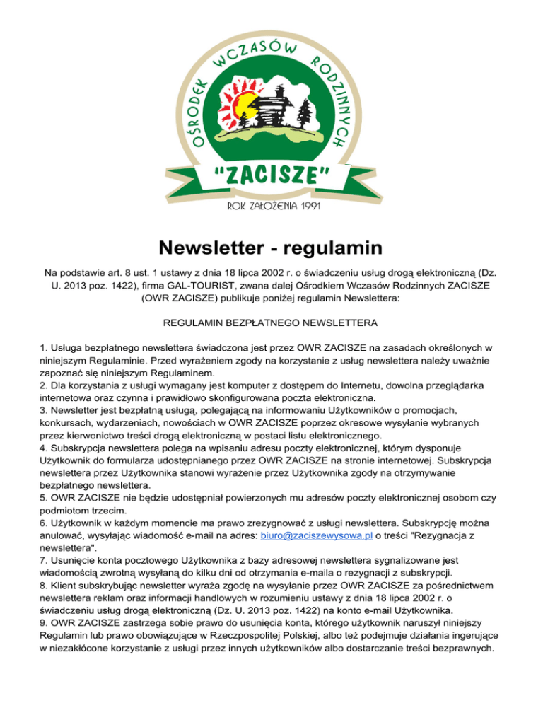 Newsletter regulamin - Ośrodek wczasów rodzinnych"ZACISZE"