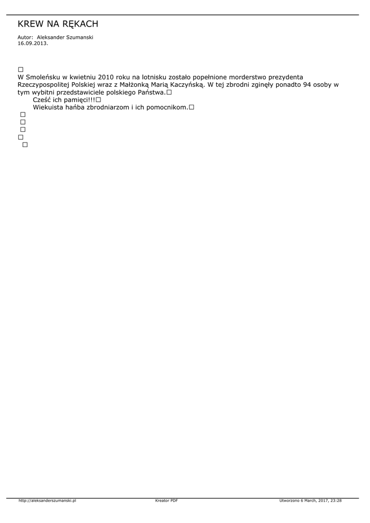 KREW NA RĘKACH Autor: Aleksander Szumanski 16.09.2013. W Smoleńsku w kwietniu 2010 roku na lotnisku zostało popełnione morderstwo prezydenta Rzeczypospolitej Polskiej wraz z Małżonką Marią Kaczyńską. W tej zbrodni zginęły ponadto 94 osoby w tym wybitni przedstawiciele polskiego Państwa. Cześć ich pamięci!!! Wiekuista hańba zbrodniarzom i ich pomocnikom. http://aleksanderszumanski.pl Kreator PDF Utworzono 6 March, 2017, 23:28