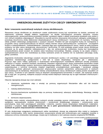 UNIESZKODLIWIANIE ZUŻYTYCH CIECZY OBRÓBKOWYCH