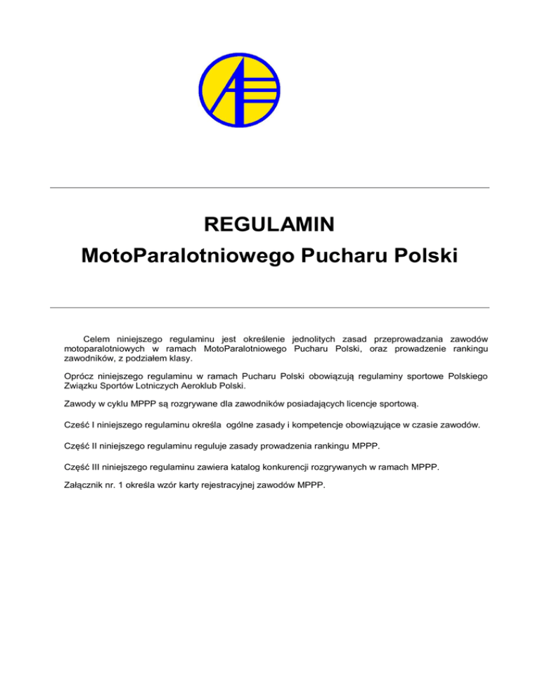 REGULAMIN MotoParalotniowego Pucharu Polski Celem niniejszego regulaminu jest określenie jednolitych zasad przeprowadzania zawodów motoparalotniowych w ramach MotoParalotniowego Pucharu Polski, oraz prowadzenie rankingu zawodników, z podziałem klasy. Oprócz niniejszego regulaminu w ramach Pucharu Polski obowiązują regulaminy sportowe Polskiego Związku Sportów Lotniczych Aeroklub Polski. Zawody w cyklu MPPP są rozgrywane dla zawodników posiadających licencje sportową. Cześć I niniejszego regulaminu określa ogólne zasady i kompetencje obowiązujące w czasie zawodów. Część II niniejszego regulaminu reguluje zasady prowadzenia rankingu MPPP. Część III niniejszego regulaminu zawiera katalog konkurencji rozgrywanych w ramach MPPP. Załącznik nr. 1 określa wzór karty rejestracyjnej zawodów MPPP. Regulamin MPPP 2017 r. Definicje: MPPP: MotoParalotniowy Puchar Polski – cykl zawodów umożliwiający rywalizację licencjonowanym zawodnikom, wyłonienie zwycięzców poszczególnych edycji, oraz klasyfikacji generalnej w poszczególnych klasach. Edycja: zawody przeprowadzone przez organizatora edycji i podmioty współuczestniczące, w tym samym miejscu i czasie, licząc od pierwszej do ostatniej konkurencji. Klasyfikacja generalna (łączna) MPPP: ranking pilotów, zawierający zsumowane wyniki zawodników uczestniczących w poszczególnych edycjach. Organizartor rankingu MPPP: Komisja Mikrolotowa Aeroklubu Polskiego, wraz z osobami i/lub podmiotami współuczestniczącymi w przygotowaniu przeprowadzenia poszczególnych edycji i prowadzenia rankingu MPPP. Organizator edycji MPPP: podmiot zrzeszony w Związku Sportów Lotniczych Aeroklub Polski i posiadający aktualną licencję Klubu Sportowego w Sporcie Mikrolotowym, odpowiedzialny za organizację edycji w czasie której rozgrywane będą zawody zaliczane do cyklu MPPP, współpracujący z Organizatorem rankingu MPPP Zawodnik: pilot posiadający niezbędne uprawnienia wymagane przepisami do samodzielnego pilotowania paralotni z napędem lub motoparalotni, z uwzględnieniem uprawnień dodatkowych lub członek załogi dwuosobowej biorący udział w lotach, wszyscy posiadający aktualną Licencje sportową. Karta rejestracyjna: dokument zawierający dane pilota lub członka załogi wraz z pisemnym potwierdzeniem zapoznania się z postanowieniami Regulaminu. Katalog konkurencji: część regulaminu określająca przykładowe konkurencje możliwe do rozegrania w ramach MPPP w celu uzyskania punktów do rankingu MPPP. Dyrektor Zawodów osoba wyznaczona przez organizatora edycji MPPP, odpowiedzialna za organizację edycji w czasie której rozgrywane będą zawody zaliczane do cyklu MPPP, zgodnie z opisem kompeterncji. Dyrektor sportowy: osoba wyznaczona przez organizatora rankingu MPPP do przeprowadzenia zawodów, odpowiedzialna za wybór konkurencji, wyznaczenie czasu i miejsca ich rozgrywania, a także czuwająca nad ich przebiegiem w czasie ich trwania, zgodnie z opisem kompetencji. Sędzia Główny i sędziowie: osoba(y) wyznaczone przez organizatora edycji MPPP i Dyrektora Sportowego edycji do przeprowadzania konkurencji zgodnie z regulaminem i katalogiem konkurencji, podawania wyników cząstkowych i końcowych, zgodnie z opisem kompetencji. Klasa: podział uwzględniający liczebność załogi oraz technikę startu z rozróżnieniem na start z nóg i start na podwoziu. o PF1 – klasa, gdzie załoga pilotująca paralotnię jest jednoosobowa, a start odbywa się z nóg. o PF1f – klasa kobiet, gdzie załoga pilotująca paralotnię jest jednoosobowa, a start odbywa się z nóg o PF2 – klasa, gdzie załoga pilotująca paralotnię jest dwuosobowa, a start odbywa się z nóg o PL1 – klasa, gdzie załoga pilotująca paralotnię jest jednoosobowa, a start odbywa się z podwozia o PL2 – klasa, gdzie załoga pilotująca paralotnię jest dwuosobowa, a start odbywa się z podwozia o PF1e – klasa napędów elektrycznych o PL1e – klasa napędów elektrycznych 2 Regulamin MPPP 2017 r. Część I 1. Postanowienia ogólne Regulaminu. 1.1. Zawody MPPP zostaną przeprowadzone zgodnie z niniejszym regulaminem oraz ustaleniami szczegółowymi przekazywanymi zawodnikom przez Dyrektora Sportowego na odprawach. 1.2. Począwszy od startu do pierwszej konkurencji, obowiązujące reguły nie mogą być zmieniane, chyba że wynika to z przyczyny uzasadnionej względami racjonalnymi i sprawiedliwej oceny przebiegu konkurencji lub bezpieczeństwa lotów. 1.3. W wyniku rozegranych konkurencji zostaną wyłonieni zwycięzcy zawodów w poszczególnych klasach: dopuszcza się łączenie klas w wypadku małej frekwencji w poszczególnych klasach, z tym że możliwe jest łączenie klas PF1, PF1f i PL1 oraz PF2 i PL2. 1.4. Wszystkie czynności związane z udziałem w zawodach, w tym loty, są wykonywane na własną odpowiedzialność pilota i członka załogi i zgodnie z przepisami prawa lotniczego. 2. Obowiązki organizatora edycji, Kierownictwo i kontrola zawodów. 2.1. Organizator edycji jest odpowiedzialny za uzyskanie wymaganych przepisami zezwoleń na organizację zawodów, ich prawidłowe zabezpieczenie, wyznaczenie obszaru i przestrzeni wydzielonych dla prowadzenia zawodów w tym dla potrzeb startów, lądowań, a także konkurencji sprawnościowych, jak również zapewnienie właściwej separacji od publiczności. 2.2. Organizator edycji jest odpowiedzialny za zgłoszenie zawodów służbom informacji lotniczej, uzyskanie zezwoleń na wykorzystanie przestrzeni, jeżeli są wymagane, a także przyjęcie i rejestrację zawodników, oraz przekazanie Dyrektorowi Sportowemu listy zawodników spełniających wymagania Organizatora i niniejszego regulaminu (najpóźniej w dniu pierwszej konkurencji przed jej rozpoczęciem) a. przekazanie wyników Organizatorowi rankingu MPPP wraz z pełną dokumentacją zawodów, b. Organizator edycji zawodów ma obowiązek weryfikacji licencji sportowych wszystkich zawodników z bazy Aeroklubu Polskiego (