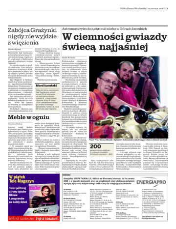 Polska Gazeta Wrocławska | 19 czerwca 2008 | 13 Wrocławski Sąd Apelacyjny utrzymał wczoraj w mocy wyrok dożywotniego więzienia dla Andrzeja S. z Wałbrzycha za gwałt i zabójstwo 7-letniej Grażynki. Do zbrodni doszło 31 grudnia 2006 roku. Ciało dziecka znaleziono w altance na działkach niedaleko jej domu. Jak się okazało, sprawcą zbrodni był sąsiad dziewczynki, który wskazał dziecko. Sąd Okręgowy w Świdnicy skazał go w lutym na dożywocie. Jego obrońca chciał złagodzenia kary. Przekonywał, że nie można w tej sprawie mówić o zabójstwie ze szczególnym okrucieństwem i twierdził, że nie ma dowodów na gwałt. Sąd Apelacyjny odrzucił te argumenty. Uznał, że każda zbrodnia popełniona na dziecku może być uznana za zbrodnię ze szczególnym okrucieństwem. Na dodatek – zdaniem sądu – dowody przedstawione w tej sprawie świadczą o tym, że sprawca bił i kopał dziecko. – Proszę o danie mi szansy i obniżenie wyroku – mówił Andrzej S. podczas rozprawy. Przez cały czas zasłaniał twarz rękami. – Zdenerwowany byłem i tyle – mówił dziennikarzom podczas przerwy, w oczekiwaniu na wyrok sądu. – Nie chciałem tego zrobić – dodał, wciąż zasłaniając twarz rękami. – Chcę dostać szansę – powtarzał. Wyrok jest prawomocny. Mord karateki Kilka dni temu wrocławski Sąd Apelacyjny uchylił wyrok 25 lat więzienia na instruktora karate Daniela K. z Boguszowa-Gorców, który w maju 2006 zamordował swojego ucznia 9-letniego Sebastiana. Uznał, że kara 25 lat jest zbyt łagodna. Meble w ogniu Ewelina Oleksy Fabryka mebli Bodzio w Goszczu pod Oleśnicą stanęła wczoraj w ogniu. Pożar wybuchł po godz. 13 w jednej z hal magazynowych i szybko objął dach. Doszczętnie spłonęła duża jego część, 20 ton płyt wiórowych i pianka do produkcji mebli. – Na szczęście ogień nie zdążył rozprzestrzenić się dalej. Gdyby przedostał się do hal produkcyjnych, byłaby tragedia – informuje Jacek Nowoczycki, komendant powiatowy Państwowej Straży Pożarnej w Oleśnicy. Fabryka ma własny wóz bojowy, więc robotnicy sami ruszyli do gaszenia pożaru. Dzięki temu płomienie nie miały szans dosięgnąć gotowych do sprzedaży łóżek, krzeseł i szaf. Sami jednak nie poradziliby sobie z opanowaniem pożaru. Dziewiętnastu zastępom strażaków z Wrocławia i Oleśnicy zajęło to godzinę. Kilku osobom na miejscu trzeba było podać tlen, a pięciu mężczyzn od razu trafiło do szpitala we Wrocławiu. – Wszyscy to pracownicy fabryki – tłumaczy komendant Nowoczycki. Jednego z nich, najciężej rannego mężczyznę, do szpitala we Wrocławiu zabrał śmigłowiec. Był mocno poparzony i zatruty ulatniającym się wewnątrz hali toksycznymi oparami. Trwa wyjaśnianie przyczyn wypadku. W ciemności gwiazdy świecą najjaśniej Rafał Święcki Profesjonalne obserwacje astronomiczne wymagają całkowitych ciemności. Tymczasem rozwój cywilizacji sprawia, że naukowcom coraz trudniej znaleźć w Polsce i w Europie miejsca, nad którymi nocne niebo nie jest zakłócone sztucznym światłem. – Na obszarach najbardziej zurbanizowanych jasność nocnego nieba jest tak duża, że widoczne są tylko najjaśniejsze gwiazdy. Z tych powodów nasze obserwatorium we Wrocławiu nie nadaje się już do profesjonalnych badań naukowych. Może służyć jedynie do popularyzacji astronomii – tłumaczy dr Sylwester Kołomański z Instytutu Astronomicznego Uniwersytetu Wrocławskiego. Naukowcy poszukują ciemności na zupełnym odludziu. Znaleźli je podczas obozu astronomicznego w Górach Izerskich. Test jasności nieba wykazał, że na Hali Izerskiej jest ponaddwudziestokrotnie ciemniej niż na terenach zamieszkanych. – To proste badanie. Im więcej uda się policzyć gwiazd, tym tło nieba jest ciemniejsze – tłumaczy dr Kołomański. Astronomowie z Uniwersytetu Wrocławskiego uważają, że warto chronić te wyjątkowe warunki do obserwacji. We współpracy z nadleśnictwem Świeradów, które jest gospodarzem tego terenu, chcą stworzyć pierwszą w Polsce strefę ochrony ciemności nocnej. Pomysł spodobał się leśnikom. – Zajmujemy się nie tylko pozyskiwaniem drewna. Podejmujemy się również działań edukacyjnych – tłumaczy nadleśniczy Wiesław Krzewina. Paweł Pres, Tomasz Mrożek i Sylwester Kołomański znaleźli czyste niebo w Górach Izerskich 200 gwiazd można dostrzec w naszych miastach. W Górach Izerskich – 800 Przy turystycznych szlakach na Hali Izerskiej staną wkrótce tablice informujące o dobrych warunkach do obserwacji gwiazd i skutkach za- nieczyszczania nieba światłem. Zostanie też zbudowany kamienny model układu słonecznego. – Aktywna ochrona tego obszaru polegałaby na wymianie zewnętrznego oświetlenia schronisk Orle i Chatki Górzystów na lampy kierujące snop światła tylko w jednym kierunku – dodaje Sylwester Kołomański z Uniwersytetu Wrocławskiego. Obecnie rezerwaty ciemnego nieba istnieją w Kanadzie i USA. Planuje się również utworzenie podobnych na Nowej Zelandii i na Węgrzech. Polskie prawo nie chroni w żaden sposób ciemności. Można jedynie tak jak wrocławscy astronomowie postarać się o ograniczenie źródeł sztucznego światła. Ciemności ustawowo chronią na przykład Czesi. D127191 KOMUNIKAT EnergiaPro GRUPA TAURON S.A. Oddział we Wrocławiu informuje, że 24 czerwca 2008 r. z powodu planowych prac na urządzeniach sieci elektroenergetycznej wystąpią wyłączenia dopływu energii elektrycznej dla następujących odbiorców: RD Wrocław Godz. od 8.00 do 15.00 Miejsce: Wrocław: Łyżwiarzy 6-8, Braci Wardzyńskich, Desantowa. RD Oborniki Śląskie Od 17.06.2008 do 27.06.2008 Godziny: 8.00-15.00 Miejsce: KANCLERZOWICE, GM. ŻMIGRÓD, od nr. 10 do nr. 17a i 34a. Od 23.06.2008 do 25.06.2008 Godziny: 8.00-15.00 Miejsce: STRZESZÓW, GMINA WISZNIA MAŁA. RD Oleśnica Godziny: 9.00-15.00 Miejsce: Kiełczów ul. Cyprysowa, dz. 370, 371, 372 od ul. Cyprysowej 