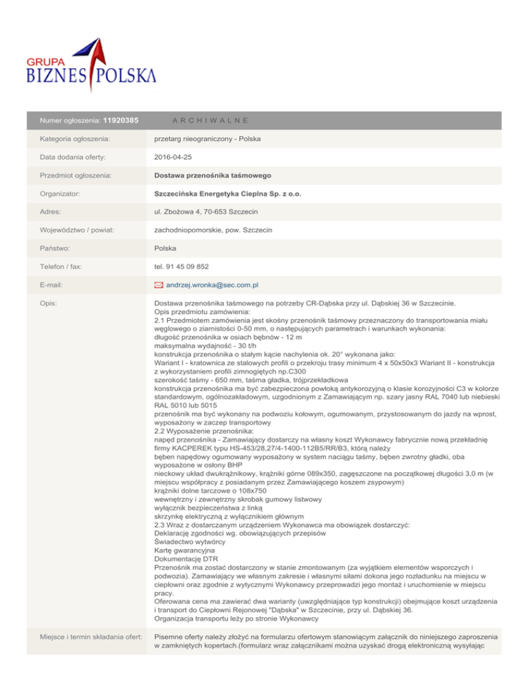 Numer ogłoszenia: 11920385 A RCHI WA L N E Kategoria ogłoszenia: przetarg nieograniczony - Polska Data dodania oferty: 2016-04-25 Przedmiot ogłoszenia: Dostawa przenośnika taśmowego Organizator: Szczecińska Energetyka Cieplna Sp. z o.o. Adres: ul. Zbożowa 4, 70-653 Szczecin Województwo / powiat: zachodniopomorskie, pow. Szczecin Państwo: Polska Telefon / fax: tel. 91 45 09 852 E-mail: [email protected] Opis: Dostawa przenośnika taśmowego na potrzeby CR-Dąbska przy ul. Dąbskiej 36 w Szczecinie. Opis przedmiotu zamówienia: 2.1 Przedmiotem zamówienia jest skośny przenośnik taśmowy przeznaczony do transportowania miału węglowego o ziarnistości 0-50 mm, o następujących parametrach i warunkach wykonania: długość przenośnika w osiach bębnów - 12 m maksymalna wydajność - 30 t/h konstrukcja przenośnika o stałym kącie nachylenia ok. 20° wykonana jako: Wariant I - kratownica ze stalowych profili o przekroju trasy minimum 4 x 50x50x3 Wariant II - konstrukcja z wykorzystaniem profili zimnogiętych np.C300 szerokość taśmy - 650 mm, taśma gładka, trójprzekładkowa konstrukcja przenośnika ma być zabezpieczona powłoką antykorozyjną o klasie korozyjności C3 w kolorze standardowym, ogólnozakładowym, uzgodnionym z Zamawiającym np. szary jasny RAL 7040 lub niebieski RAL 5010 lub 5015 przenośnik ma być wykonany na podwoziu kołowym, ogumowanym, przystosowanym do jazdy na wprost, wyposażony w zaczep transportowy 2.2 Wyposażenie przenośnika: napęd przenośnika - Zamawiający dostarczy na własny koszt Wykonawcy fabrycznie nową przekładnię firmy KACPEREK typu HS-453/28,27/4-1400-112B5/RR/B3, którą należy bęben napędowy ogumowany wyposażony w system naciągu taśmy, bęben zwrotny gładki, oba wyposażone w osłony BHP nieckowy układ dwukrążnikowy, krążniki górne 089x350, zagęszczone na początkowej długości 3,0 m (w miejscu współpracy z posiadanym przez Zamawiającego koszem zsypowym) krążniki dolne tarczowe o 108x750 wewnętrzny i zewnętrzny skrobak gumowy listwowy wyłącznik bezpieczeństwa z linką skrzynkę elektryczną z wyłącznikiem głównym 2.3 Wraz z dostarczanym urządzeniem Wykonawca ma obowiązek dostarczyć: Deklarację zgodności wg. obowiązujących przepisów Świadectwo wytwórcy Kartę gwarancyjna Dokumentację DTR Przenośnik ma zostać dostarczony w stanie zmontowanym (za wyjątkiem elementów wsporczych i podwozia). Zamawiający we własnym zakresie i własnymi siłami dokona jego rozładunku na miejscu w ciepłowni oraz zgodnie z wytycznymi Wykonawcy przeprowadzi jego montaż i uruchomienie w miejscu pracy. Oferowana cena ma zawierać dwa warianty (uwzględniające typ konstrukcji) obejmujące koszt urządzenia i transport do Ciepłowni Rejonowej "Dąbska" w Szczecinie, przy ul. Dąbskiej 36. Organizacja transportu leży po stronie Wykonawcy Miejsce i termin składania ofert: Pisemne oferty należy złożyć na formularzu ofertowym stanowiącym załącznik do niniejszego zaproszenia w zamkniętych kopertach.(formularz wraz załącznikami można uzyskać drogą elektroniczną wysyłając prośbę na adres [email protected]) Koperta powinna być zaadresowana i opisana w sposób następujący: "SEC Sp. z o.o. przenośnik taśmowy CR-Dąbska" i złożona do dnia 04.05.2016 r. do godz.11.00 w kancelarii (parter) SEC Spółka z o.o. Szczecin, ul. Zbożowa 4 , 70-653 Szczecin. Otwarcie ofert: Otwarcie ofert nastąpi w dniu 04.05.2016 r. o godz. 1115 w sali konferencyjnej (V piętro) SEC Sp. z o.o. ul. Zbożowa 4 w Szczecinie. Termin składania: 2016-05-04 Miejsce i termin realizacji: Termin dostawy do dnia 29.07.2016 r. Wymagania: dostępne w oryginalnej treści ogłoszenia i/lub w załącznikach Kontakt: Osoby do kontaktów z Zamawiającym: w sprawach merytorycznych - Andrzej Wronka tel. 91 45 09 852 w sprawach technicznych - Tomasz Ziółkowski tel. 609 517 491 Numer dokumentu: FG/AW/493/2016 Źródło: Internet i własne Załączniki: ZIP załącznik