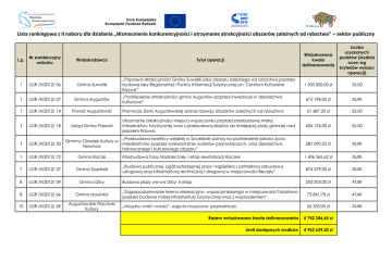 Unia Europejska Europejski Fundusz Rybacki Lista rankingowa z II naboru dla działania „Wzmocnienie konkurencyjności i utrzymanie atrakcyjności obszarów zależnych od rybactwa” – sektor publiczny Wnioskowana kwota dofinansowania Liczba uzyskanych punktów (średnia ocen wg kryteriów wyboru operacji) 1 500 000,00 zł 55,00 „Podniesienie atrakcyjności gminy Augustów poprzez inwestycje w dziedzictwo kulturowe” 675 198,00 zł 55,00 Powiat Augustowski Promocja Ziemi Augustowskiej szansą rozwoju obszarów zależnych od rybactwa 61 687,20 zł 55,00 Urząd Gminy Przerośl Utrzymanie atrakcyjności miejsca wypoczynku poprzez przebudowę małej infrastruktury turystycznej wraz z przebudową dojścia do istniejącej plaży gminnej nad jeziorem Krzywe. 604 125,00 zł 55,00 287 090,05 zł 55,00 1 406 365,62 zł 55,00 „Budowa publicznej, ogólnodostępnej plaży i kąpieliska z potrzebną zabudową usługową oraz infrastrukturą techniczną i drogową w miejscowości Becejły” 874 279,00 zł 50,00 Budowa plaży we wsi Giby- II etap 203 305,00 zł 47,00 „Zagospodarowanie terenu rekreacyjno- wypoczynkowego w miejscowości Tobołowo poprzez budowę małej infrastruktury turystycznej wraz z wyposażeniem” 73 841,78 zł 47,00 „Muzyka, wiatr i woda”- zajęcia muzyczno- przyrodnicze. 56 355,00 zł 25,00 L.p. Nr ewidencyjny wniosku Wnioskodawca 1 LGR /II/2012/ 06 Gmina Suwałki 1 LGR /II/2012/ 07 Gmina Augustów 1 LGR /II/2012/ 14 1 LGR /II/2012/ 18 1 LGR /II/2012/ 53 1 LGR /II/2012/ 72 Gmina Raczki 7 LGR /II/2012/ 37 Gmina Szypliszki 8 LGR /II/2012/ 59 Gmina Giby 8 LGR /II/2012/ 66 Gmina Nowinka 10 LGR /II/2012/ 69 Augustowskie Placówki Kultury Tytuł operacji „Poprawa atrakcyjności Gminy Suwałki jako obszaru zależnego od rybactwa poprzez budowę Izby Regionalnej i Punktu Informacji Turystycznej pn. Centrum Kulturalne Krzywe” „Przebudowa świetlicy wiejskiej w Szczebrze szansą na podniesienie jakości życia Gminny Ośrodek Kultury w mieszkańców poprzez wykorzystanie walorów przyrodniczych, oraz dziedzictwa Nowince historycznego i kulturowego obszaru” Przebudowa Trasy Nadrzecznej- I etap rewitalizacji Raczek Razem wnioskowana kwota dofinansowania 5 742 246,65 zł Limit dostępnych środków 4 952 639,20 zł Unia Europejska Europejski Fundusz Rybacki Lista rankingowa z II naboru dla działania „Wzmocnienie konkurencyjności i utrzymanie atrakcyjności obszarów zależnych od rybactwa” – sektor społeczno-gospodarczy L.p. Nr ewidencyjny wniosku Wnioskodawca 1 LGR /II/2012/ 12 Wojciech Dyczewski 1 LGR /II/2012/ 19 Stowarzyszenie „Lokalna Grupa Działania- Kanał Augustowski i Rospuda” 1 LGR /II/2012/ 30 Piotr Malczewski 1 LGR /II/2012/ 51 Polskie Towarzystwo TurystycznoKrajoznawcze Oddział w Suwałkach 1 LGR /II/2012/ 62 Stowarzyszenie „Sięgać za horyzont” 1 LGR /II/2012/ 75 Suwalska Izba Rolniczo- Turystyczna 7 LGR /II/2012/ 35 Hubert Falkowski 8 LGR /II/2012/ 74 Forum Rozwoju Regionalnego Polska Wschodnia 9 LGR /II/2012/ 01 Parafia Rzymsko-Katolicka Najświętszego Serca Pana Jezusa 10 LGR /II/2012/ 65 Wigierski Ośrodek TurystycznoWypoczynkowy Głowicki, Hajko Spółka Jawna 11 LGR /II/2012/ 64 Szymon Skowina 12 LGR /II/2012/ 40 Magdalena Justyna Tyburek Wnioskowana kwota dofinansowania Liczba uzyskanych punktów (średnia ocen wg kryteriów wyboru operacji) Eko-Przystań BIAŁA PERŁA 499 622,42 zł 55,00 „Podniesienie atrakcyjności i promocja obszaru LGD- Kanał Augustowski i Rospuda” 32 300,00 zł 55,00 Czarna Hańcza. Rzeka bobrów i ludzi 476 828,80 zł 55,00 Wzmocnienie konkurencyjności i atrakcyjności obszaru Lokalnej Grupy Rybackiej „Pojezierze Suwalsko- Augustowskie” poprzez budowę i remont małej infrastruktury turystyki wodnej w Centrum Turystyki WIGRY w Starym Folwarku 419 897,11 zł 55,00 1 000 000,00 zł 55,00 „Interaktywna Wioska Młodego Rybaka jako nowa forma edukacji w ramach kół zainteresowań” 134 343,35 zł 55,00 „Wędkarstwo- nasza pasja. Pierwszy lokalny wędkarski serwis internetowy” 631 210,00 zł 53,00 Wirtualny spacer po Pojezierzu Suwalsko- Augustowskim 248 199,15 zł 42,00 Renowacja Parafii Rzymsko-Katolickiej Najświętszego Serca Pana Jezusa w Jeleniewie – cennego zabytku barokowego 857 171,44 zł 40,00 Wzrost atrakcyjności turystycznej miejscowości Gawrych Ruda poprzez zagospodarowanie ogólnie dostępnej plaży- budowę drewnianego pomostu na jeziorze Wigry 197 546,03 zł 39,00 Budowa punktu wędkarskiego. 123 576,57 zł 30,00 Centrum Budowy Formy „MOC PUSZCZY” 58 565,00 zł 20,00 Tytuł operacji „Pracownia przygód” Unia Europejska Europejski Fundusz Rybacki 13 LGR /II/2012/ 38 Paulina Anna Banaszewska Rozwój turystyki wiejskiej w miejscowości Gulbieniszki poprzez Stworzenie Turystycznego Klubu Przedszkolaka i Starszaka poprzez 1. stworzenie pokoju zabaw w domu 2. stworzenie dodatkowych atrakcji dla dzieci na świeżym powietrzu- plac zabaw, trampolina, basen 3. stworzenie atrakcji zarówno dla dzieci jak i dorosłych- bania japońska, quad, możliwość wędkowania 74 349,50 zł Razem wnioskowana kwota dofinansowania 4 753 609,37 zł Limit dostępnych środków 1 285 347,98 zł 19,00 Unia Europejska Europejski Fundusz Rybacki Lista rankingowa z II naboru dla działania „Restrukturyzacja lub reorientacja działalności gospodarczej lub dywersyfikacja zatrudnienia osób mających pracę związaną z sektorem rybactwa, w drodze tworzenia dodatkowych miejsc pracy poza tym sektorem” – sektor społeczno-gospodarczy Nr ewidencyjny L.p. wniosku Wnioskodawca Wnioskowana kwota dofinansowania Liczba uzyskanych punktów (średnia ocen wg kryteriów wyboru operacji) „Restrukturyzacja i reorientacja działalności poprzez rozszerzenie usług w zakresie turystyki Gospodarstwa Rybackiego BUSZNICA” 450 000,00 zł 60,00 Tytuł operacji 1 LGR /II/2012/ 13 Mirosław Zyskowski 2 LGR /II/2012/ 34 Hubert Falkowski Restrukturyzacja i reorientacja działalności gospodarczej w Gospodarstwie 