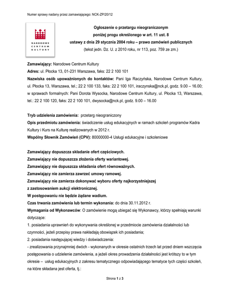 Numer sprawy nadany przez zamawiającego: NCK-ZP/20/12 Ogłoszenie o przetargu nieograniczonym poniżej progu określonego w art. 11 ust. 8 ustawy z dnia 29 stycznia 2004 roku – prawo zamówień publicznych (tekst jedn. Dz. U. z 2010 roku, nr 113, poz. 759 ze zm.) Zamawiający: Narodowe Centrum Kultury Adres: ul. Płocka 13, 01-231 Warszawa, faks: 22 2 100 101 Nazwiska osób upoważnionych do kontaktów: Pani Iga Raczyńska, Narodowe Centrum Kultury, ul. Płocka 13, Warszawa, tel.; 22 2 100 133, faks: 22 2 100 101, [email protected], godz. 9.00 – 16.00; w sprawach formalnych: Pani Dorota Wysocka, Narodowe Centrum Kultury, ul. Płocka 13, Warszawa, tel.: 22 2 100 120, faks: 22 2 100 101, [email protected], godz. 9.00 – 16.00 Tryb udzielenia zamówienia: przetarg nieograniczony Opis przedmiotu zamówienia: świadczenie usług edukacyjnych w ramach szkoleń programów Kadra Kultury i Kurs na Kulturę realizowanych w 2012 r. Wspólny Słownik Zamówień (CPV): 80000000-4 Usługi edukacyjne i szkoleniowe Zamawiający dopuszcza składanie ofert częściowych. Zamawiający nie dopuszcza złożenia oferty wariantowej. Zamawiający nie dopuszcza składania ofert równoważnych. Zamawiający nie zamierza zawrzeć umowy ramowej. Zamawiający nie zamierza dokonywać wyboru oferty najkorzystniejszej z zastosowaniem aukcji elektronicznej. W postępowaniu nie będzie żądane wadium. Czas trwania zamówienia lub termin wykonania: do dnia 30.11.2012 r. Wymagania od Wykonawców: O zamówienie mogą ubiegać się Wykonawcy, którzy spełniają warunki dotyczące: 1. posiadania uprawnień do wykonywania określonej w przedmiocie zamówienia działalności lub czynności, jeżeli przepisy prawa nakładają obowiązek ich posiadania; 2. posiadania następującej wiedzy i doświadczenia: - zrealizowania przynajmniej dwóch - wykonanych w okresie ostatnich trzech lat przed dniem wszczęcia postępowania o udzielenie zamówienia, a jeżeli okres prowadzenia działalności jest krótszy to w tym okresie – usług edukacyjnych z zakresu tematycznego odpowiadającego tematyce tych części szkoleń, na które składana jest oferta, tj.: Strona 1 z 3 Numer sprawy nadany przez zamawiającego: NCK-ZP/20/12 • dla części 1 – z zakresu integracji i/lub budowania zespołu • dla części 2, 3, 4, 11 – z zakresu zarządzania kulturą i/lub zarządzania projektem • dla części 5 i 15 – z zakresu komunikacji i/lub promocji w kulturze • dla części 6 – z zakresu ustawy o organizowaniu i prowadzeniu działalności kulturalnej • dla części 7 – z zakresu prawa autorskiego • dla części 8 – z zakresu Creative Commons • dla części 9 – z zakresu prawa zamówień publicznych • dla części 10 – z zakresu kontroli zarządczej • dla części 12 – z zakresu zarządzania zespołem • dla części 13 – z zakresu źródeł finansowania projektów kulturalnych • dla części 14 – z zakresu metodologii prowadzenia szkoleń i/lub kształcenia umiejętności trenerskich 3. dysponowania odpowiednim potencjałem technicznym oraz osobami zdolnymi do wykonania zamówienia, tj. co najmniej 1 wykwalifikowanym trenerem, mogącym się wylegitymować: - dla części 1, 12 i 14 – wykształcenie wyższe kierunkowe (psychologia, zarządzanie zasobami ludzkimi, pedagogika) na poziomie magisterskim, specjalista w danej dziedzinie - dla części 2 – wykształcenie wyższe na poziomie magisterskim, specjalista w danej dziedzinie - dla części 3 - wykształcenie wyższe na poziomie magisterskim, posiadanie praktycznych doświadczeń we współpracy z podmiotami gospodarczymi sektora kultury, specjalista w danej dziedzinie - dla części 4 - wykształcenie wyższe na poziomie magisterskim, posiadanie praktycznych doświadczeń we współpracy z ngo w sektorze kultury, specjalista w danej dziedzinie - dla części 5 i 15 – wykształcenie wyższe, posiadanie praktycznych doświadczeń we współpracy z sektorem kultury, specjalista w danej dziedzinie - dla części 6, 7 i 9 - wykształcenie wyższe kierunkowe (prawo) na poziomie magisterskim, specjalista w danej dziedzinie - dla części 8 - wykształcenie wyższe na poziomie magisterskim, specjalista w danej dziedzinie - dla części 10 - wykształcenie wyższe na poziomie magisterskim, specjalista w danej dziedzinie - dla części 11 i 13 - wykształcenie wyższe na poziomie magisterskim, posiadanie praktycznych doświadczeń we współpracy z sektorem kultury, specjalista w danej dziedzinie W celu potwierdzenia ww. doświadczenia Wykonawca przedstawi Zamawiającemu CV trenera/trenerów wraz z informacją, którą część/części zamówienia mu powierzy. 4. sytuacji ekonomicznej i finansowej 5. nie podlegania wykluczeniu z postępowania na podstawie art. 24 ust. 1 upzp Strona 2 z 3 Numer sprawy nadany przez zamawiającego: NCK-ZP/20/12 Opis sposobu dokonania oceny spełniania warunków udziału w postępowaniu: Ocena spełniania warunków udziału w postępowaniu zostanie dokonana na podstawie dokumentów złożonych przez Wykonawcę oraz Oświadczenia stanowiącego załącznik nr 2 do SIWZ. Ocena spełniania warunków udziału w postępowaniu zostanie dokonana metodą: spełnia – nie spełnia. Kryteria oceny ofert: Kryterium Liczba punktów 1. Cena brutto (z podatkiem VAT) 30 2. Ocena koncepcji programowej szkolenia, w tym: 70 2.1. program 35 2.2. metodologia 25 2.3. materiały szkoleniowe 10 Razem 100 Termin składania ofert: 20.02.2012 r. do godziny 13.00 w Narodowym Centrum Kultury, ul. Płocka 13, 01–231 Warszawa, w recepcji. Termin związania z ofertą: 30 dni, licząc od upływu terminu składania ofert. Określenie sposobu uzyskania specyfikacji istotnych warunków zamówienia oraz adres strony internetowej, na której została zamieszczona Specyfikacja Istotnych Warunków Zamówienia: Specyfikacja istotnych warunków zamówienia jest dostępna w siedzibie Zamawiającego w Narodowym Centrum Kultury, ul. Płocka 13, 01 – 231 Warsz