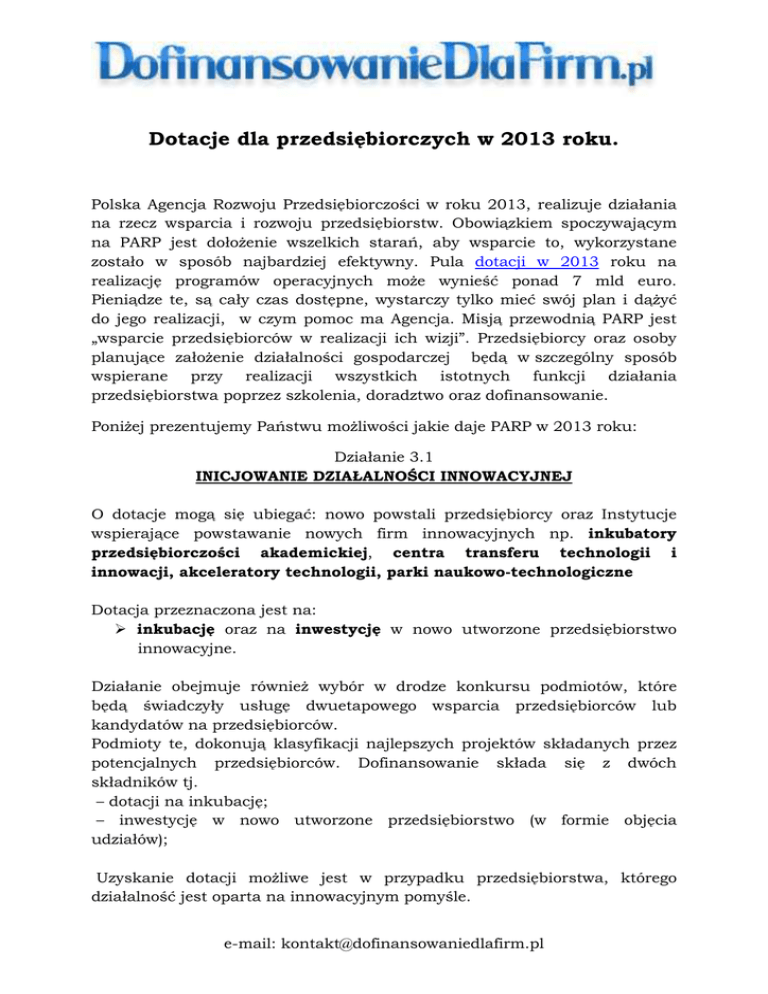 Dotacje dla przedsiębiorczych w 2013 roku. Polska Agencja Rozwoju Przedsiębiorczości w roku 2013, realizuje działania na rzecz wsparcia i rozwoju przedsiębiorstw. Obowiązkiem spoczywającym na PARP jest dołoŜenie wszelkich starań, aby wsparcie to, wykorzystane zostało w sposób najbardziej efektywny. Pula dotacji w 2013 roku na realizację programów operacyjnych moŜe wynieść ponad 7 mld euro. Pieniądze te, są cały czas dostępne, wystarczy tylko mieć swój plan i dąŜyć do jego realizacji, w czym pomoc ma Agencja. Misją przewodnią PARP jest „wsparcie przedsiębiorców w realizacji ich wizji”. Przedsiębiorcy oraz osoby planujące załoŜenie działalności gospodarczej będą w szczególny sposób wspierane przy realizacji wszystkich istotnych funkcji działania przedsiębiorstwa poprzez szkolenia, doradztwo oraz dofinansowanie. PoniŜej prezentujemy Państwu moŜliwości jakie daje PARP w 2013 roku: Działanie 3.1 INICJOWANIE DZIAŁALNOŚCI INNOWACYJNEJ O dotacje mogą się ubiegać: nowo powstali przedsiębiorcy oraz Instytucje wspierające powstawanie nowych firm innowacyjnych np. inkubatory przedsiębiorczości akademickiej, centra transferu technologii i innowacji, akceleratory technologii, parki naukowo-technologiczne Dotacja przeznaczona jest na: inkubację oraz na inwestycję w nowo utworzone przedsiębiorstwo innowacyjne. Działanie obejmuje równieŜ wybór w drodze konkursu podmiotów, które będą świadczyły usługę dwuetapowego wsparcia przedsiębiorców lub kandydatów na przedsiębiorców. Podmioty te, dokonują klasyfikacji najlepszych projektów składanych przez potencjalnych przedsiębiorców. Dofinansowanie składa się z dwóch składników tj. – dotacji na inkubację; – inwestycję w nowo utworzone przedsiębiorstwo (w formie objęcia udziałów); Uzyskanie dotacji moŜliwe jest w przypadku przedsiębiorstwa, którego działalność jest oparta na innowacyjnym pomyśle. e-mail: [email protected] Działanie 4. 4 NOWE INWESTYCJE O WYSOKIM POTENCJALE INNOWACYJNYM O dotacje mogą się ubiegać: przedsiębiorcy z sektora MSP. Działanie skierowane jest na: projekty inwestycyjne związane z zastosowaniem nowych rozwiązań technologicznych produktowych, usługowych lub organizacyjnych (rozwiązania technologiczne i organizacyjne stosowane na świecie nie dłuŜej niŜ 3 lata); tworzenie nowych miejsc pracy związanych z nowymi inwestycjami; projekty szkoleniowe oraz doradcze niezbędne dla realizacji projektów inwestycyjnych. Zgodność projektów zgłoszonych do dofinansowania będzie weryfikowana z regulacjami unijnymi na etapie oceny wniosków. W przypadku wątpliwości będzie moŜliwe uzupełnienie dokumentacji przez wnioskodawców. Działanie 5. 1 WSPIERANIE POWIĄZAŃ KOOPERACYJNYCH O ZNACZENIU PONADREGIONALNYM O dotacje mogą się ubiegać: grupy przedsiębiorców oraz instytucje otoczenia biznesu. Działanie skierowane jest na: wspólne przedsięwzięcia grup przedsiębiorców projektów doradczych, szkoleniowych i inwestycyjnych w zakresie: • tworzenia oraz zarządzania strukturą organizacyjną powiązania kooperacyjnego, • przygotowania wspólnych planów rozwoju powiązań kooperacyjnych, • wspólnych inwestycji grup przedsiębiorców, • inwestycji realizowanych przez kooperujących przedsiębiorców niezbędnych dla funkcjonowania i rozwoju powiązania działań marketingowych powiązań kooperacyjnych. Działanie 5. 2 WSPIERANIE INSTYTUCJI OTOCZENIA BIZNESU ŚWIADCZĄCYCH USŁUGI PROINNOWACYJNE ORAZ ICH SIECI O ZNACZENIU PONADREGIONALNYM e-mail: [email protected] W ramach działania, o dotacje mogą ubiegać się: instytucje otoczenia biznesu/sieci instytucji otoczenia biznesu. Działanie skierowane jest na: wzmocnienie instytucji otoczenia biznesu (IOB)/sieci instytucji otoczenia biznesu (IOB) poprzez: • promowanie współpracy w ramach sieci, • wymiany doświadczeń, • wspólnej obsługi klientów, • rozwój oferty usług o charakterze proinnowacyjnym. W ramach działania udzielane będzie wsparcie z przeznaczeniem na dofinansowanie przygotowania i rozwoju pakietu usług o charakterze proinnowacyjnym (składającego się z usług doradczych, szkoleniowych, informacyjnych oraz sieciowe/poszukiwania partnera) słuŜących podniesieniu innowacyjności przedsiębiorstw działających na terenie Polski, dofinansowanie kosztów świadczenia wybranych usług dla przedsiębiorców oraz wspólnych przedsięwzięć podejmowanych przez instytucje skupione w sieciach, a takŜe dofinansowanie funkcjonowania jednostki koordynującej działalność sieci (o charakterze sekretariatu sieci). Poddziałanie 5. 4. 1 WSPARCIE NA UZYSKANIE/REALIZACJĘ OCHRONY WŁASNOŚĆI PRZEMYSOWEJ W ramach poddziałania, dotacje mogą ubiegać się: mikro, mali i średni przedsiębiorcy. Poddziałanie skierowane jest na projekty mające na celu: wykorzystywanie moŜliwości ochrony przedmiotów własności przemysłowej (wynalazków, wzorów uŜytkowych oraz wzorów przemysłowych), szczególnie poza granicami kraju. Refundacja wydatków poniesionych na przygotowanie dokumentacji zgłoszeniowej oraz prowadzenie postępowań przed właściwymi organami ochrony własności przemysłowej, związanych z uzyskaniem praw własności przemysłowej. Działanie 6. 1 PASZPORT DO EKSPORTU W ramach działania, o dotacje mogą ubiegać się: mikro, mali i średni przedsiębiorcy. e-mail: [email protected] Działanie skierowane jest na projekty mające na celu: wejście na nowe rynki i wzmocnienie pozycji konkurencyjnej przedsiębiorstwa na rynkach zagranicznych, projekty przyczyniające się do zwiększenia udziału sprzedaŜy na rynki zagraniczne w ogólnej sprzedaŜy przedsiębiorstwa oraz projekty promujące polską markę na rynkach zagranicznych. Działanie 8. 1 WSPIERANIE DZIAŁALNOŚCI GOSPODARCZEJ W DZIEDZINIE GOSPODARKI ELEKTRONIICZNEJ O dotacje mogą ubiegać się: mikro i mali przedsiębiorczy. Działanie skierowane jest na projekty mające n