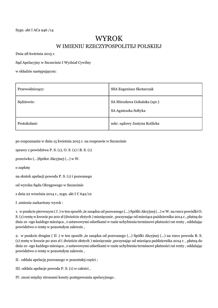 wyroku z 22 września 2014 roku zasądził od pozwanego na rzecz O. S. (1) oraz B. S. (1) rentę odpowiednio