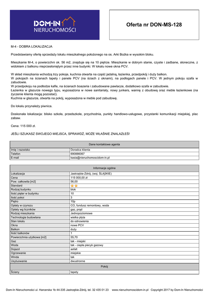 Oferta nr DON-MS-128 M-4 - DOBRA LOKALIZACJA Przedstawiamy ofertę sprzedaży lokalu mieszkalnego położonego na os. Arki Bożka w wysokim bloku. Mieszkanie M-4, o powierzchni ok. 56 m2, znajduje się na 10 piętrze. Mieszkanie w dobrym stanie, czyste i zadbane, słoneczne, z widokiem z balkonu nieprzesłoniętym przez inne budynki. W lokalu nowe okna PCV. W skład mieszkania wchodzą trzy pokoje, kuchnia otwarta na część jadalną, łazienka, przedpokój i duży balkon. W pokojach na ścianach tapety i panele PCV (na ściach z oknami), na podłogach panele i PCV. W jednym pokoju szafa w zabudowie. W przedpokoju na podłodze kafle, na ścianach boazeria i zabudowane pawlacze, dodatkowo szafa w zabudowie. Łazienka w glazurze nowego typu, wyposażona w nowe sanitariaty, nowy junkers, wannę z obudową oraz meble łazienkowe (na życzenie klienta mogą pozostać). Kuchnia w glazurze, otwarta na pokój, wyposażona w meble pod zabudowę. Do lokalu przynależy piwnica. Doskonała lokalizacja: blisko szkoła, przedszkole, przychodnia, punkty handlowo-usługowe, przystanki komunikacji miejskiej, plac zabaw. Cena: 115 000 zł. JEŚLI SZUKASZ SWOJEGO MIEJSCA, SPRAWDŹ, MOŻE WŁAŚNIE ZNALAZŁEŚ! Dane kontaktowe agenta Imię i nazwisko Telefon E-mail Doradca klienta 690886067 [email protected] Informacje ogólne Lokalizacja Cena Pow. całkowita [m2] Standard Rodzaj budynku Ilość pięter w budynku Ilość pokoi Piętro Opłaty w czynszu Opłaty wg liczników Rodzaj mieszkania Technologia budowlana Stan lokalu Okna Balkon Ilość balkonów Powierzchnia użytkowa [m2] Gaz Woda Dojazd Ogrzewanie Winda Usytuowanie Jastrzębie-Zdrój, (woj. ŚLĄSKIE) 115 000,00 zł 56,00 blok 10 3 10p CO, fundusz remontowy, woda gaz, prąd Jednopoziomowe wielka płyta do odnowienia nowe PCV duży 1 55,70 tak - miejski tak - ciepła piecyk gazowy asfalt miejskie tak dwustronne Pokój Ściany tapety Dom-In Nieruchomości ul. Harcerska 1b 44-335 Jastrzębie-Zdrój, tel. 32 435 01 23 www.nieruchomoscidom-in.pl Copyright 2017 by Dom-In Nieruchomości Oferta nr DON-MS-128 Podłogi panele Kuchnia Typ pomieszczenia Rodzaj kuchni Ściany Podłogi aneks kuchenny - połączony z jadalnią bez zabudowy glazura terakota Łazienka Typ pomieszczenia Ściany Podłogi razem z wc glazura terakota Przedpokój Ściany Podłogi boazeria terakota Dom-In Nieruchomości ul. Harcerska 1b 44-335 Jastrzębie-Zdrój, tel. 32 435 01 23 www.nieruchomoscidom-in.pl Copyright 2017 by Dom-In Nieruchomości