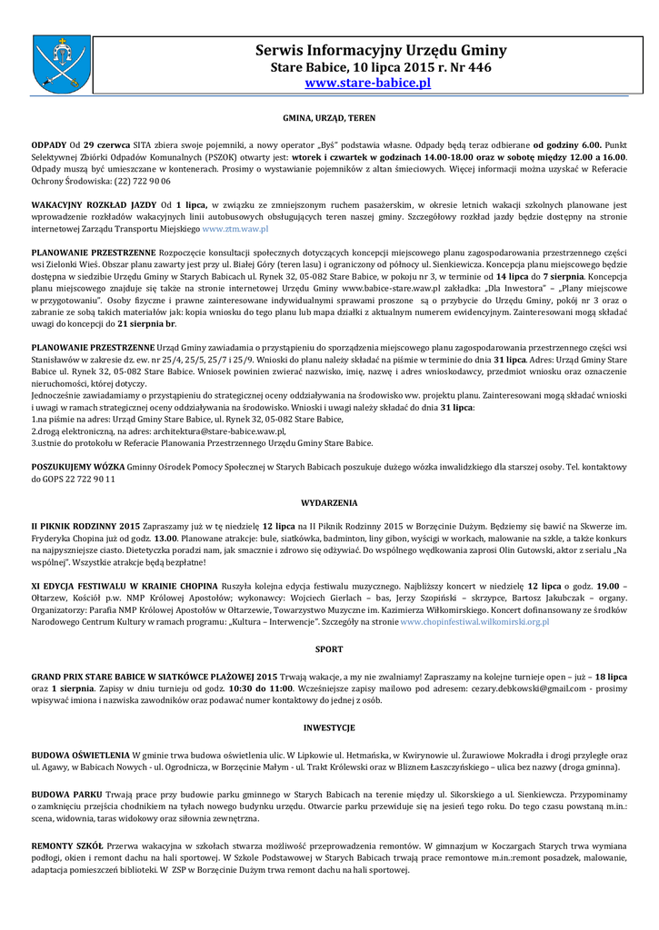 Serwis Informacyjny Urzędu Gminy Stare Babice, 10 lipca 2015 r. Nr 446 www.stare-babice.pl GMINA, URZĄD, TEREN ODPADY Od 29 czerwca SITA zbiera swoje pojemniki, a nowy operator „Byś” podstawia własne. Odpady będą teraz odbierane od godziny 6.00. Punkt Selektywnej Zbiórki Odpadów Komunalnych (PSZOK) otwarty jest: wtorek i czwartek w godzinach 14.00-18.00 oraz w sobotę między 12.00 a 16.00. Odpady muszą być umieszczane w kontenerach. Prosimy o wystawianie pojemników z altan śmieciowych. Więcej informacji można uzyskać w Referacie Ochrony Środowiska: (22) 722 90 06 WAKACYJNY ROZKŁAD JAZDY Od 1 lipca, w związku ze zmniejszonym ruchem pasażerskim, w okresie letnich wakacji szkolnych planowane jest wprowadzenie rozkładów wakacyjnych linii autobusowych obsługujących teren naszej gminy. Szczegółowy rozkład jazdy będzie dostępny na stronie internetowej Zarządu Transportu Miejskiego www.ztm.waw.pl PLANOWANIE PRZESTRZENNE Rozpoczęcie konsultacji społecznych dotyczących koncepcji miejscowego planu zagospodarowania przestrzennego części wsi Zielonki Wieś. Obszar planu zawarty jest przy ul. Białej Góry (teren lasu) i ograniczony od północy ul. Sienkiewicza. Koncepcja planu miejscowego będzie dostępna w siedzibie Urzędu Gminy w Starych Babicach ul. Rynek 32, 05-082 Stare Babice, w pokoju nr 3, w terminie od 14 lipca do 7 sierpnia. Koncepcja planu miejscowego znajduje się także na stronie internetowej Urzędu Gminy www.babice-stare.waw.pl zakładka: „Dla Inwestora” – „Plany miejscowe w przygotowaniu”. Osoby fizyczne i prawne zainteresowane indywidualnymi sprawami proszone są o przybycie do Urzędu Gminy, pokój nr 3 oraz o zabranie ze sobą takich materiałów jak: kopia wniosku do tego planu lub mapa działki z aktualnym numerem ewidencyjnym. Zainteresowani mogą składać uwagi do koncepcji do 21 sierpnia br. PLANOWANIE PRZESTRZENNE Urząd Gminy zawiadamia o przystąpieniu do sporządzenia miejscowego planu zagospodarowania przestrzennego części wsi Stanisławów w zakresie dz. ew. nr 25/4, 25/5, 25/7 i 25/9. Wnioski do planu należy składać na piśmie w terminie do dnia 31 lipca. Adres: Urząd Gminy Stare Babice ul. Rynek 32, 05-082 Stare Babice. Wniosek powinien zwierać nazwisko, imię, nazwę i adres wnioskodawcy, przedmiot wniosku oraz oznaczenie nieruchomości, której dotyczy. Jednocześnie zawiadamiamy o przystąpieniu do strategicznej oceny oddziaływania na środowisko ww. projektu planu. Zainteresowani mogą składać wnioski i uwagi w ramach strategicznej oceny oddziaływania na środowisko. Wnioski i uwagi należy składać do dnia 31 lipca: 1.na piśmie na adres: Urząd Gminy Stare Babice, ul. Rynek 32, 05-082 Stare Babice, 2.drogą elektroniczną, na adres: [email protected], 3.ustnie do protokołu w Referacie Planowania Przestrzennego Urzędu Gminy Stare Babice. POSZUKUJEMY WÓZKA Gminny Ośrodek Pomocy Społecznej w Starych Babicach poszukuje dużego wózka inwalidzkiego dla starszej osoby. Tel. kontaktowy do GOPS 22 722 90 11 WYDARZENIA II PIKNIK RODZINNY 2015 Zapraszamy już w tę niedzielę 12 lipca na II Piknik Rodzinny 2015 w Borzęcinie Dużym. Będziemy się bawić na Skwerze im. Fryderyka Chopina już od godz. 13.00. Planowane atrakcje: bule, siatkówka, badminton, liny gibon, wyścigi w workach, malowanie na szkle, a także konkurs na najpyszniejsze ciasto. Dietetyczka poradzi nam, jak smacznie i zdrowo się odżywiać. Do wspólnego wędkowania zaprosi Olin Gutowski, aktor z serialu „Na wspólnej”. Wszystkie atrakcje będą bezpłatne! XI EDYCJA FESTIWALU W KRAINIE CHOPINA Ruszyła kolejna edycja festiwalu muzycznego. Najbliższy koncert w niedzielę 12 lipca o godz. 19.00 – Ołtarzew, Kościół p.w. NMP Królowej Apostołów; wykonawcy: Wojciech Gierlach – bas, Jerzy Szopiński – skrzypce, Bartosz Jakubczak – organy. Organizatorzy: Parafia NMP Królowej Apostołów w Ołtarzewie, Towarzystwo Muzyczne im. Kazimierza Wiłkomirskiego. Koncert dofinansowany ze środków Narodowego Centrum Kultury w ramach programu: „Kultura – Interwencje”. Szczegóły na stronie www.chopinfestiwal.wilkomirski.org.pl SPORT GRAND PRIX STARE BABICE W SIATKÓWCE PLAŻOWEJ 2015 Trwają wakacje, a my nie zwalniamy! Zapraszamy na kolejne turnieje open – już – 18 lipca oraz 1 sierpnia. Zapisy w dniu turnieju od godz. 10:30 do 11:00. Wcześniejsze zapisy mailowo pod adresem: [email protected] - prosimy wpisywać imiona i nazwiska zawodników oraz podawać numer kontaktowy do jednej z osób. INWESTYCJE BUDOWA OŚWIETLENIA W gminie trwa budowa oświetlenia ulic. W Lipkowie ul. Hetmańska, w Kwirynowie ul. Żurawiowe Mokradła i drogi przyległe oraz ul. Agawy, w Babicach Nowych - ul. Ogrodnicza, w Borzęcinie Małym - ul. Trakt Królewski oraz w Bliznem Łaszczyńskiego – ulica bez nazwy (droga gminna). BUDOWA PARKU Trwają prace przy budowie parku gminnego w Starych Babicach na terenie między ul. Sikorskiego a ul. Sienkiewcza. Przypominamy o zamknięciu przejścia chodnikiem na tyłach nowego budynku urzędu. Otwarcie parku przewiduje się na jesień tego roku. Do tego czasu powstaną m.in.: scena, widownia, taras widokowy oraz siłownia zewnętrzna. REMONTY SZKÓŁ Przerwa wakacyjna w szkołach stwarza możliwość przeprowadzenia remontów. W gimnazjum w Koczargach Starych trwa wymiana podłogi, okien i remont dachu na hali sportowej. W Szkole Podstawowej w Starych Babicach trwają prace remontowe m.in.:remont posadzek, malowanie, adaptacja pomieszczeń biblioteki. W ZSP w Borzęcinie Dużym trwa remont dachu na hali sportowej.
