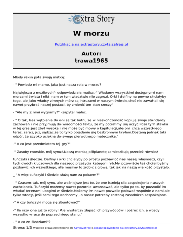 W morzu Publikacja na extrastory.czytajzafree.pl Autor: trawa1965 Młody rekin pyta swoją matkę: - " Powiedz mi mamo, jaka jest nasza rola w morzu? Największa z możliwych"- odpowiedziała matka.-" Władamy wszystkimi dostępnymi nam morzami świata i nikt nam w tym władztwie nie zagrozi. Orki i delfiny na pewno chciałyby tego, ale jako władcy zimnych mórz są intruzami w naszym świecie,choć nie zawahali się nawet przybrać naszej postaci, by zmienić ten stan rzeczy" - "Ale my z nimi wygramy?" -zapytał malec. - " O tak, bez wątpienia.Bo oni są tak butni, że w nieskończoność kopiują swoje standardy zachowań i nie przyjmują do wiadomości faktu, że my potrafimy się uczyć.Poza tym stawka w tej grze jest zbyt wysoka i nie może być mowy o kapitulacji,ale oni chcą wszystkiego teraz, zaraz, już, sądząc,że to tylko objadanie się bezbronnym krylem.Dostaną jednak taki odpór, że szybko uciekną do swego pierwotnego matecznika." -" A co jest przedmiotem tej gry?" -" Zasoby morskie, mój synu!.Naszą morską półplanetę zamieszkują przecież również tuńczyki i śledzie. Delfiny i orki chciałyby po prostu pozbawicć nas naszej własności, czyli tych dwóch kluczowych dla naszego przeżycia kategorii ryb.My oczywiście też chcielibyśmy pozbawić ich wszystkiego, ale musimy to zrobić z głową, tak jak na naszą wielkość przystało. _ ' A więc tuńczyki i śledzie służą nam za pokarm?" - " Czasem tak, mój synu, ale ważniejsze jest to, że one istnieją dla zaspokojenia naszych zachcianek. Tuńczyki możemy nawet pozornie awansować, ale tylko po to, by pozwolić im władać terenami ubogimi w śledzie.Możemy im nawet pozwolic polować wspólnie z nami,ale tylko wtedy, jeśli sami tego zechcemy , a nasze potrzeby zostaną zasadniczo zaspokojone. -" A czy tuńczyki mogą się zbuntować?" -" Ile razy one już to robiły! Ale wystarczy złapać ich przywódców i pożreć ich, a wtedy wszystko wraca do poprzedniego stanu." - " A co ze śledziami"? Strona: 1/2 Wszelkie prawa zastrzeżone dla CzytajZaFree | Zobacz opowiadanie na extrastory.czytajzafree.pl - " To bezmózgie istoty, łatwe do manipulowania.Jedyne, co umieją, to instynktownie zbijać się w kule i liczyć na cud, że nasze szczęki nie obejmą ich wszystkich. Ale różnica między nami a podrybami polega przecież na tym,że my musimy myśleć za nie, by nie ulec pokusie pożarcia od razu całego ich śledziostanu.Trzeba przecież pozyskiwać je stale, a jednocześnie trzymać w ryzach. Dlatego właśnie nie wtrącamy się do ich procesów rozrodczych. -" Już to rozumiem! Mądrość polega na sprawowaniu kontroli nad głupimi. - " I na tym właśnie polega dyskretna dominacja". " Strona: 2/2 Wszelkie prawa zastrzeżone dla CzytajZaFree | Zobacz opowiadanie na extrastory.czytajzafree.pl