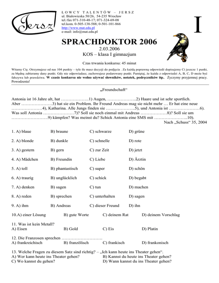 ŁOWCY TALENTÓW – JERSZ ul. Białowieska 50/26, 54-235 Wrocław tel./fax 071-310-48-17; 071-324-69-08 tel.kom. 0-505-138-588; 0-501-101-866 http://www.mat.edu.pl e-mail: [email protected] I SPRACHDOKTOR 2006 2.03.2006 KOS – klasa I gimnazjum Czas trwania konkursu: 45 minut Witamy Cię. Otrzymujesz od nas 104 punkty – tyle ile masz decyzji do podjęcia . Za każdą poprawną odpowiedź dopisujemy Ci jeszcze 1 punkt, za błędną zabieramy dany punkt. Gdy nie odpowiadasz, zachowujesz podarowany punkt. Pamiętaj, że każda z odpowiedzi A, B, C, D może być fałszywa lub prawdziwa. W czasie konkursu nie wolno używać słowników, notatek, podręczników itp.. Życzymy przyjemnej pracy. Powodzenia! „Freundschaft“ Antonia ist 16 Jahre alt, hat ……………….1) Augen, ………………..2) Haare und ist sehr sportlich. Aber …………………3) hat sie ein Problem. Ihr Freund Andreas mag sie nicht mehr … Er hat eine neue …………………4), Katharina. Alle Jungs finden sie ………………..5), und Antonia ist …………………6). Was soll Antonia …………………7)? Soll sie noch einmal mit Andreas ………………8)? Soll sie um …………………….9) kämpfen? Was meinst du? Schick Antonia eine SMS mit …………………..10). Nach „Schuss“ 35, 2004 1. A) blaue B) braune C) schwarze D) grüne 2. A) blonde B) dunkle C) schnelle D) rote 3. A) gestern B) gern C) zur Zeit D) jetzt 4. A) Mädchen B) Freundin C) Liebe D) Ärztin 5. A) toll B) phantastisch C) super D) schön 6. A) traurig B) unglücklich C) schick D) begabt 7. A) denken B) sagen C) tun D) machen 8. A) reden B) sprechen C) unterhalten D) sagen 9. A) ihm B) Andreas C) dieser Freund D) ihn 10.A) einer Lösung B) gute Worte C) deinem Rat D) deinem Vorschlag 11. Was ist kein Metall? A) Eisen B) Gold C) Eis D) Platin 12. Die Franzosen sprechen ………………………. A) frankreichisch B) franzölisch C) frankisch D) frankonisch 13. Welche Fragen zu diesem Satz sind richtig? – „Ich kann heute ins Theater gehen“. A) Wer kann heute ins Theater gehen? B) Kannst du heute ins Theater gehen? C) Wo kannst du gehen? D) Wann kannst du ins Theater gehen? 14. In welchen Reihen passt alles logisch zusammen? A) Kaffee, Tee, Spitzer, Saft B) Erbsen, Tomaten, Bohnen, Teller C) schwimmen, vielen, reiten, tanzen D) rot, braun, brav, bunt 15. Letzten Sommer …………………….ich in Italien. A) bin B) fahre C) war D) besuche 16. Was antwortest du auf die Frage? – „Wie findest du deine Ferien?“ A) Ich finde sie nicht. B) Ich finde sie toll. C) Nicht schlecht. D) Einfach prima. 17. Was sagt die Mutter am Morgen? A) Zieh dich an! B) Iss zu Mittag! C) Kämm dich! D) Putz dir die Zähne! 18. Ich ………………. dich etwas fragen. A) soll B) muss C) möchte D) will 19. Die Freunde sagen ………………… nichts. A) ihr B) Sie C) ihm D) ihnen 20. Frau Riese wohnt …………………………. A) in einem Dorf B) auf dem Lande C) in der Stadt D) ans Meer 21. ……………………………., aber ich habe jetzt keine Zeit. A) Es tut mir weh B) Leider nicht C) Es tut mir Leid D) Tut mir Leid 22. Helmut ……………………. einen Tisch im Restaurant. A) reserviert B) sucht C) findet D) braucht 23. Im Sommer ……………………. mein Bruder und ich an die Nordsee. A) fliegen B) fahren C) flogen D) reisten 24. In der Woche müssen wir ………………….. Schule gehen. A) nach B) zur C) in die D) in 25. ……………………… ist das? Ich weiß nicht. A) Wie B) Was C) Wer D) Wo 26. Ich habe Hunger. - ……………… du meinen Apfel? – Ja, gern. A) Willst B) Nimmst C) Gibst D) Isst Zapraszamy do: konkursu DEUTSCHFREUND 2006 w nowym roku szkolnym 2006/2007, udziału w obozie „Konie, matematyka i języki“ w Serpelicach w czasie wakacji 2006. Obóz przeznaczony jest dla ambitnych uczniów szkół podstawowych od klasy 3 i uczniów gimnazjów, którym nie przeszkadza „odrobina nauki“ na tym obozie. Szczegóły: www.mat.edu.pl © Copyright by Łowcy Talentów – JERSZ, Wrocław 2006