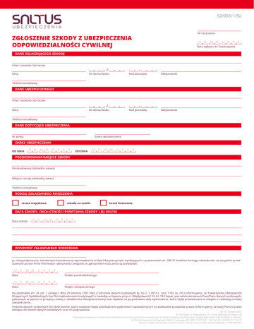 SZ/055/1/SU Nr roszczenia ZGŁOSZENIE SZKODY Z UBEZPIECZENIA ODPOWIEDZIALNOŚCI CYWILNEJ Data wpływu do Towarzystwa DANE ZGŁASZAJĄCEGO SZKODĘ Imię i nazwisko lub nazwa Ulica Nr domu/lokalu Kod pocztowy Miejscowość Nr domu/lokalu Kod pocztowy Miejscowość Telefon kontaktowy DANE UBEZPIECZONEGO Imię i nazwisko lub nazwa Ulica Telefon kontaktowy DANE DOTYCZĄCE UBEZPIECZENIA Nr polisy Suma ubezpieczenia OKRES UBEZPIECZENIA Od dnia do dnia POSZKODOWANY/MIEJSCE SZKODY Poszkodowany (dokładna nazwa) Miejsce szkody (dokładny adres) Telefon kontaktowy RODZAJ ZGŁASZANEGO ROSZCZENIA strata majątkowa szkoda na osobie strata finansowa DATA SZKODY, OKOLICZNOŚCI POWSTANIA SZKODY I JEJ SKUTKI Data szkody WYSOKOŚĆ ZGŁASZANEGO ROSZCZENIA Ja, niżej podpisany/a, świadomy/a konsekwencji wprowadzenia w błąd Ubezpieczyciela, wynikających z postanowień art. 286 §1 kodeksu karnego oświadczam, że wszystkie przedstawione przeze mnie informacje i dokumenty związane ze zgłoszeniem roszczenia są prawdziwe. Data Podpis poszkodowanego Data Podpis ubezpieczonego Na podstawie art. 24 ust. 1 ustawy z dnia 29 sierpnia 1997 roku o ochronie danych osobowych (tj. Dz.U. z 2014 r., poz. 1182 ze. zm.) informujemy, że Towarzystwo Ubezpieczeń Wzajemnych Spółdzielczych Kas Oszczędnościowo-Kredytowych z siedzibą w Sopocie przy ul. Władysława IV 22, 81-743 Sopot, jest administratorem Pani/Pana danych osobowych, pobranych w oparciu o przepisy ustawy o działalności ubezpieczeniowej oraz wydane na jej podstawie akty wykonawcze, które będą przetwarzane w związku z realizacją umowy ubezpieczenia. Podanie danych osobowych jest dobrowolne. Dane osobowe będą udostępniane podmiotom upoważnionym na podstawie przepisów prawa. Informujemy, że służy Panu/i prawo dostępu do swoich danych osobowych oraz ich poprawiania. SALTUS Ubezpieczenia 81-743 Sopot, ul. Władysława IV 22, e-mail: [email protected], www.s-u.pl Towarzystwo Ubezpieczeń Wzajemnych Spółdzielczych Kas Oszczędnościowo-Kredytowych z siedzibą w Sopocie zarejestrowane w Sądzie Rejonowym Gdańsk-Północ w Gdańsku, VIII Wydział Gospodarczy Krajowego Rejestru Sądowego, KRS 0000117377, NIP: 118-01-30-637, REGON: 011132747 Zarząd: Grzegorz Buczkowski, Krzysztof Kosznik, Katarzyna Bieranowska; kapitał zakładowy: 19 000 000,00 zł