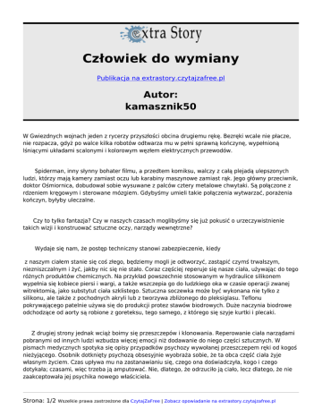 Człowiek do wymiany Publikacja na extrastory.czytajzafree.pl Autor: kamasznik50 W Gwiezdnych wojnach jeden z rycerzy przyszłości obcina drugiemu rękę. Bezręki wcale nie płacze, nie rozpacza, gdyż po walce kilka robotów odtwarza mu w pełni sprawną kończynę, wypełnioną lśniącymi układami scalonymi i kolorowym węzłem elektrycznych przewodów. Spiderman, inny słynny bohater filmu, a przedtem komiksu, walczy z całą plejadą ulepszonych ludzi, którzy mają kamery zamiast oczu lub karabiny maszynowe zamiast rąk. Jego główny przeciwnik, doktor Ośmiornica, dobudował sobie wysuwane z palców cztery metalowe chwytaki. Są połączone z rdzeniem kręgowym i sterowane mózgiem. Gdybyśmy umieli takie połączenia wytwarzać, porażenia kończyn, byłyby uleczalne. Czy to tylko fantazja? Czy w naszych czasach moglibyśmy się już pokusić o urzeczywistnienie takich wizji i konstruować sztuczne oczy, narządy wewnętrzne? Wydaje się nam, że postęp techniczny stanowi zabezpieczenie, kiedy z naszym ciałem stanie się coś złego, będziemy mogli je odtworzyć, zastąpić czymś trwalszym, niezniszczalnym i żyć, jakby nic się nie stało. Coraz częściej reperuje się nasze ciała, używając do tego różnych produktów chemicznych. Na przykład powszechnie stosowanym w hydraulice silikonem wypełnia się kobiece piersi i wargi, a także wszczepia go do ludzkiego oka w czasie operacji zwanej witrektomią, jako substytut ciała szklistego. Sztuczna soczewka może być wykonana nie tylko z silikonu, ale także z pochodnych akryli lub z tworzywa zbliżonego do pleksiglasu. Teflonu pokrywającego patelnie używa się do produkcji protez stawów biodrowych. Duże naczynia biodrowe odchodzące od aorty są robione z goreteksu, tego samego, z którego się szyje kurtki i plecaki. Z drugiej strony jednak wciąż boimy się przeszczepów i klonowania. Reperowanie ciała narządami pobranymi od innych ludzi wzbudza więcej emocji niż dodawanie do niego części sztucznych. W pismach medycznych spotyka się opisy przypadków psychozy wywołanej przeszczepem ręki od kogoś nieżyjącego. Osobnik dotknięty psychozą obsesyjnie wyobraża sobie, że ta obca część ciała żyje własnym życiem. Czas upływa mu na zastanawianiu się, czego ona doświadczyła, kogo i czego dotykała; czasami, więc trzeba ją amputować. Nie, dlatego, że odrzuciło ją ciało, lecz dlatego, że nie zaakceptowała jej psychika nowego właściciela. Strona: 1/2 Wszelkie prawa zastrzeżone dla CzytajZaFree | Zobacz opowiadanie na extrastory.czytajzafree.pl Z trudem akceptujemy protezy. Aparat słuchowy, nawet najmniejszy, kojarzy się wielu osobom z kalectwem i z tego powodu jest rzadko noszony. Ludzie raczej woleliby coś niewidzialnego lub idealnie przypominającego ludzkie ucho, żeby nie zwracać na siebie uwagi. Przeszczepy narządów życiowo ważnych, takich jak nerki czy serce, nasuwają pytania, czy ciało stanowi tylko wehikuł dla duszy, i czy wolno korzystać z niego, wymontowując potrzebne, komu innemu części. Kłopot sprawia również czas, w jakim należy podjąć decyzję, gdyż narządy można pobrać tylko w ciągu kilku godzin. Niedawno, pewien amerykański okulista stworzył okulary zastępujące ludzkie oczy. W świecie medycznym zawrzało. Jego pacjent Jerry ukazał się z pęczkiem kabli wchodzących do czaszki przez wywiercony w niej otwór. Do pasa miał przyczepiony dość duży akumulator, a na nosie ciemne masywne okulary z wbudowanymi w nie kamerami. Obrazy odbierane przez mikrokamery przewodziły impulsy bezpośrednio do mózgu, z pominięciem nerwu wzrokowego, dzięki czemu Jerry widział duże przedmioty i światło zapalonego papierosa w ciemnym pokoju. Na tym jednym wynalazku, niestety, skończyło się marzenie o sztucznym oku, gdyż potem nikomu już nie udało się skonstruować niczego lepszego. Życie tlące się w naszych ciałach, cudownej maszynerii uruchomionej przez Boga, przypadkiem, czy nieznaną siłą, wymyka się spod kontroli.Tkanki nie mają śrubek ani przycisków, ciągle nie wiadomo, ile mechanizmów funkcjonuje w ich głębi. I tu właśnie zaczyna się cud leczenia. Strona: 2/2 Wszelkie prawa zastrzeżone dla CzytajZaFree | Zobacz opowiadanie na extrastory.czytajzafree.pl