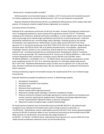 „Nowoczesny i energooszczędny zarządca” Dofinansowanie na termomodernizację ze środków z UE? A może premia termomodernizacyjna? Co trzeba przygotować by otrzymać dofinansowanie z UE? Czy nasz budynek ma potencjał? Niejedna Wspólnota Mieszkaniowa (W.M.) czy Spółdzielnia Mieszkaniowa (S.M.) zadaje sobie takie pytania. W niniejszym artykule znajdą Państwo odpowiedzi na te pytania. Zacznijmy jednak od budynku…. Budynek W.M. wybudowany pod koniec lat 60 tych XX wieku. Posiada 10 kondygnacji nadziemnych oraz 1 kondygnację podziemną. Łączna powierzchnia ogrzewana wynosi 2725 m2. W obiekcie znajdują się 42 mieszkania. Budynek jest bardzo zaniedbany, ze ścian odpada tynk a stare nieszczelne okna przyczyniają się do nadmiernego wychładzania pomieszczeń w okresie grzewczym. Centralne ogrzewanie realizowane jest z przestarzałego węzła cieplnego. Instalacja grzewcza nie posiada termostatów i jest zapowietrzona. Wskaźnikowe zużycie ciepła wynosi 0,64 GJ/m2/rok. Koszt ogrzania 1m2 w rok wynosi (przyjmując cenę 58,47 zł/GJ) 37,44 zł/m2/rok. Ogrzanie całego budynku wyniesie zatem 102 033,42 zł/rok. Nie są to jednak wszystkie koszty. W przypadku „ogrzewania miejskiego” płacimy również za moc zamówioną. Dobrze dobrana moc zamówiona powinna zapewnić nam normatywną temperaturę w pomieszczeniach mieszkalnych (+20,0 st. C) podczas trwania sezonu grzewczego. Dla rozpatrywanej W.M. wynosi ona 10 599,30 zł/MW/m-c. Jakie koszty poniesie Wspólnota? Moc zamówiona w budynku wynosi 200 kW czyli 0,20 MW, zatem: 10 599,30 zł/MW/m-c x 0,20 MW x 12 m-c = 25 438,33 zł/rok. Suma kosztów ponoszonych rocznie przez wspólnotę wynosi 127 471,75 zł, natomiast ogrzanie 1m2 (wliczając opłatę stałą) wynosi 46,77 zł/m2/rok. Wspólnota Mieszkaniowa uważa, że dana cena za ogrzanie 1m2 w roku jest zbyt duża. Rozważa możliwość termomodernizacji. Nie wie natomiast jakie są możliwości finansowania takich inwestycji. Poniżej przedstawię program termomodernizacyjny dla rozpatrywanej W.M. oraz możliwości jego finansowania. Budynek Wspólnoty przejdzie kompleksowy remont, w skład którego wejdzie: 1. 2. 3. 4. 5. 6. 7. Docieplenie stropodachu Docieplenie wszystkich ścian budynku Wymiana okien Wymiana drzwi wejściowych Montaż nawietrzaków higrosterowanych Wykonanie nowego węzła cieplnego z systemem zarządzania energią Płukanie chemiczne instalacji centralnego ogrzewania, montaż zaworów termostatycznych, montaż zaworów regulacyjnych podpionowych, likwidacja centralnego odpowietrzania i montaż indywidualnych odpowietrzników na pionach zasilających. 8. Wykonanie audytu energetycznego i projektu budowlanego W rozpatrywanym budynku koszt termomodernizacji wyniósł 681 824,50 zł. Jak wykazał audyt energetyczny po realizacji termomodernizacji zużycie energii wyniesie na potrzeby c.o. 715,48 GJ/rok. Wskaźnikowe zużycie ciepła będzie wynosić 0,26 GJ/m2/rok. Koszty ogrzania budynku wyniosą 41 833,94 zł natomiast opłata za moc zamówioną (wynoszącą po termomodernizacji 0,096 MW) wyniesie 12 210,40 zł/rok. Suma kosztów dla całego budynku to 41 833,94 + 12 210,40 = 54 044,34 zł/rok. Jednostkowy koszt ogrzania 1m2 wynosi 19,83 zł/m2/rok. Tabela poniżej przedstawia zależności przed i po termomodernizacji. Tabela nr 1 PRZED TERMOMODERNIZACJĄ Powierzchnia ogrzewana 2 725,39 Zużycie energii na c.o. 1 745,06 zużycie wskaźnikowe 0,64 koszt GJ 58,47 Roczne koszty ogrzewania 102 033,42 Wskaźnik ogrzewania 37,44 Moc zamówiona 0,20 Opłata za moc zamówioną 10 599,30 Roczna opłata za moc zam. 25 438,33 suma kosztów 127 471,75 Wskaźnik ogrzewania 46,77 2 m GJ/rok GJ/m2/rok zł/GJ zł/rok zł/m2/rok MW zł/MW/m-c zł/rok zł/rok zł/m2/rok PO TERMOMODERNZACJI Powierzchnia ogrzewana 2 725,39 Zużycie energii na c.o. 715,48 zużycie wskaźnikowe 0,26 koszt GJ 58,47 Roczne koszty ogrzewania 41 833,94 Wskaźnik ogrzewania 15,35 Moc zamówiona 0,10 Opłata za moc zamówioną 10 599,30 Roczna opłata za moc zam. 12 210,40 suma kosztów 54 044,34 Wskaźnik ogrzewania 19,83 Roczne oszczędności 73 427,42 m2 GJ/rok GJ/m2/rok zł/GJ zł/rok zł/m2/rok MW zł/MW/m-c zł/rok zł/rok zł/m2/rok zł/rok Dzięki tej inwestycji Wspólnota rocznie zaoszczędzi 73 427,42 zł/rok. Zastanówmy się jakie Wspólnota Mieszkaniowa ma możliwości finansowe na termomodernizacją? 1. Premia termomodernizacyjna. W myśl Ustawy z dnia 21 listopada z 2008 roku o wspieraniu termomodernizacji i remontów Wspólnota Mieszkaniowa może liczyć na premię termomodernizacyjną w wysokości 20% wykorzystania kwoty kredytu ( lecz nie więcej niż 16% kosztów poniesionych na realizację termomodernizacji lub nie więcej niż dwukrotność przewidywanych rocznych oszczędności) . Zabezpieczeniem kredytu będzie prawo do dysponowania środkami z funduszu remontowego. Wspólnota posiada środki własne w wysokości 170 tys. zł. W tabeli nr 2 przedstawiono rzeczywiste koszty poniesione przez wspólnotę Tabela nr 2 PREMIA TERMOMODERNIZACYJNA Premia: 109 091,92 Wkład własny 170 456,13 Pożyczka (na 15 lat) 402 276,46 % 6,00 Odsetki (liczone dla okresu 15 lat) 208 758,26 całkowite koszty poniesione: audyt energetyczny 2 500,00 projekt budowlany 15 000,00 odsetki 208 758,53 spłata pożyczki 402 276,46 suma 628 534,72 koszty całkowite 798 990,84 Roczne oszczędności kosztów 73 427,42 Czas zwrotu inwestycji 10,88 zł zł zł % zł zł zł zł zł zł zł zł/rok lat W tym przypadku premia termomodernizacyjna wyniesie 109 091,92 zł/rok a cała inwestycja zwróci się po niecałych 11 latach. 2. Wykorzystanie dofinansowania ze środków UE Jeżeli chodzi o dofinansowanie ze środków Unijnych mamy tutaj kilka możliwości, które są zależne od miejscowości, w której znajduje się Wspólnota Mieszkaniowa. W.M. będzie mogła skorzystać z programów: - Regionalny Program Operacyjny (RPO) - Program Operacyjny Infrastruktura i Środowisko (POIiŚ). Programy te różnią 
