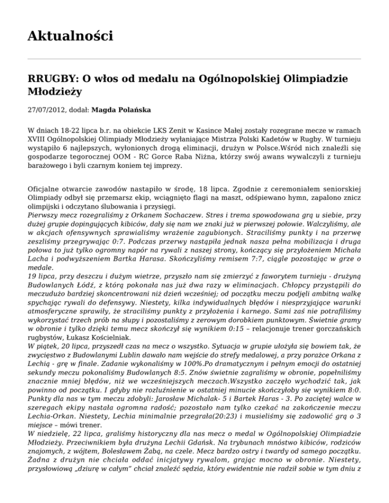 Aktualności RRUGBY: O włos od medalu na Ogólnopolskiej Olimpiadzie Młodzieży 27/07/2012, dodał: Magda Polańska W dniach 18-22 lipca b.r. na obiekcie LKS Zenit w Kasince Małej zostały rozegrane mecze w ramach XVIII Ogólnopolskiej Olimpiady Młodzieży wyłaniające Mistrza Polski Kadetów w Rugby. W turnieju wystąpiło 6 najlepszych, wyłonionych drogą eliminacji, drużyn w Polsce.Wśród nich znaleźli się gospodarze tegorocznej OOM - RC Gorce Raba Niżna, którzy swój awans wywalczyli z turnieju barażowego i byli czarnym koniem tej imprezy. Oficjalne otwarcie zawodów nastapiło w środę, 18 lipca. Zgodnie z ceremoniałem seniorskiej Olimpiady odbył się przemarsz ekip, wciągnięto flagi na maszt, odśpiewano hymn, zapalono znicz olimpijski i odczytano ślubowania i przysięgi. Pierwszy mecz rozegraliśmy z Orkanem Sochaczew. Stres i trema spowodowana grą u siebie, przy dużej grupie dopingujących kibiców, dały się nam we znaki już w pierwszej połowie. Walczyliśmy, ale w akcjach ofensywnych sprawialiśmy wrażenie zagubionych. Straciliśmy punkty i na przerwę zeszliśmy przegrywając 0:7. Podczas przerwy nastąpiła jednak nasza pełna mobilizacja i druga połowa to już tylko ogromny napór na rywali z naszej strony, kończący się przyłożeniem Michała Lacha i podwyższeniem Bartka Harasa. Skończyliśmy remisem 7:7, ciągle pozostając w grze o medale. 19 lipca, przy deszczu i dużym wietrze, przyszło nam się zmierzyć z faworytem turnieju - drużyną Budowlanych Łódź, z którą pokonała nas już dwa razy w eliminacjach. Chłopcy przystąpili do meczudużo bardziej skoncentrowani niż dzień wcześniej; od początku meczu podjęli ambitną walkę spychając rywali do defensywy. Niestety, kilka indywidualnych błędów i niesprzyjające warunki atmosferyczne sprawiły, że straciliśmy punkty z przyłożenia i karnego. Sami zaś nie potrafiliśmy wykorzystać trzech prób na słupy i pozostaliśmy z zerowym dorobkiem punktowym. Świetnie gramy w obronie i tylko dzięki temu mecz skończył się wynikiem 0:15 – relacjonuje trener gorczańskich rugbystów, Łukasz Kościelniak. W piątek, 20 lipca, przyszedł czas na mecz o wszystko. Sytuacja w grupie ułożyła się bowiem tak, że zwycięstwo z Budowlanymi Lublin dawało nam wejście do strefy medalowej, a przy porażce Orkana z Lechią - grę w finale. Zadanie wykonaliśmy w 100%.Po dramatycznym i pełnym emocji do ostatniej sekundy meczu pokonaliśmy Budowlanych 8:5. Znów świetnie zagraliśmy w obronie, popełniliśmy znacznie mniej błędów, niż we wcześniejszych meczach.Wszystko zaczęło wychodzić tak, jak powinno od początku. I gdyby nie rozluźnienie w ostatniej minucie skończyłoby się wynikiem 8:0. Punkty dla nas w tym meczu zdobyli: Jarosław Michalak- 5 i Bartek Haras - 3. Po zaciętej walce w szeregach ekipy nastała ogromna radość; pozostało nam tylko czekać na zakończenie meczu Lechia-Orkan. Niestety, Lechia minimalnie przegrała(20:23) i musieliśmy się zadowolić grą o 3 miejsce – mówi trener. W niedzielę, 22 lipca, graliśmy historyczny dla nas mecz o medal w Ogólnopolskiej Olimpiadzie Młodzieży. Przeciwnikiem była drużyna Lechii Gdańsk. Na trybunach mnóstwo kibiców, rodziców znajomych, z wójtem, Bolesławem Żabą, na czele. Mecz bardzo ostry i twardy od samego początku. Żadna z drużyn nie chciała oddać inicjatywy rywalom, grając mocno w obronie. Niestety, przysłowiową „dziurę w całym” chciał znaleźć sędzia, który ewidentnie nie radził sobie w tym dniu z bardzo szybkim i stojącym na wysokim poziomie meczem. Popełnił kilka karygodnych decyzji, prowadzących do zaostrzenia sytuacji na boisku. Nie uznał zdobytych przez nas punktów, gwizdał karne z kapelusza i pokazał 2 czerwone kartki naszym zawodnikom (Patryk Kowalczyk, Jarosław Michalak). Lechia kopnęła karnego; przegrywaliśmy 0:3. Do końca meczu podęliśmy walkę grając w osłabieniu, gdyż za kolejną kartkę boisko opuścił Bartek Haras. Niestety, nie udało się, sędzia skończył mecz… W Lechii wybuchła radość, u nas natomiast łzy przeplatały się z pretensjami do sędziów, gdyż wobec nich byliśmy niestety bezradni – nie kryje swojego rozczarowania Łukasz Kościelniak. Ogromne brawa należą się jednak całej drużynie oraz sztabowi trenerskiemu, gdyż IV miejsce w Polsce to ogromny sukces dla tak małego i nowego klubu. Cieszy fakt, że najlepszym defensorem turnieju uznany został nasz zawodnik - Mirosław Kuczaj.Dumą napawa nas również fakt, że pięciu naszych zawodników (na 23powołanych ogółem) zostało powołanych do Reprezentacji Polski na wrześniowy turniej Cross Border. Są to: -Michał Lach -Jarosław Michalak -Mirosław Kuczaj -Adam Kubisz -Mirosław Knowa W rezerwie pozostają natomiast: Jakub Jamróz, Patryk Kowalczyk i Marcin Olszewski. RC Gorce na Olimpiadzie wystąpiły w składzie: Nalepa Tomasz, Fornal Kazimierz, Kowalczyk Patryk, Kowalczyk Grzegorz, Kozak Bartłomiej, Haras Bartłomiej, Kuczaj Mirosław, Michalak Jarosław, Lach Michał, Knowa Mirosław, Kubisz Adam, Olszewski Marcin, Miśkowiec Marek, Gacek Piotr, Jamróz Jakub, Janik Dariusz, Kowal Stanisław, Kowalczyk Kamil, Niżnik Mariusz Trener: Łukasz Kościelniak Kierownik: Mateusz Kuczaj Masażysta: Oskar Noworyta Dla drużynyGorców sam fakt przyznania organizacji tak prestiżowej imprezy sportowej jest powodem do dumy. Gospodarze usłyszeli wiele pochwał od uczestników turnieju za świetną organizację zawodów i warunków zakwaterowania. Specjalne podziękowania należą się wspaniałej publiczności, która gorąco dopingowała naszych zawodników każdego dnia. Dzięki przychylności Wójta Gminy Mszana Dolna, Pana Bolesława Żaby, mogliśmy nagrodzić trzech najlepszych zawodników turnieju nagrodami rzeczowymi. Kompletne wyniki XVIII Ogólnopolskiej Olimpiady Młodzieży w sportach letnich w rugby Małopolska 2012 przedstawiają się następująco: