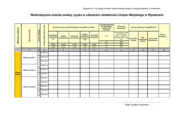 Załącznik nr 1 do Księgi Procedur Audytu Wewnętrznego w Urzędzie Miejskim w Wyszkowie 1 2 3 Tematy zadań audytowych Numer zadania Obszary ryzyka Obszary audytu Matematyczna metoda analizy ryzyka w obszarach działalności Urzędu Miejskiego w Wyszkowie 4 Kryteria oceny ryzyka (kategorie czynników ryzyka) Wpływ Istotność/ Czynniki Jakość Kontrola czynników materialn operacyjn zarządzania wewnętrzna zewnętrzn ość e ych Czas jaki upłynął od ostatniego audytu lub kontroli 30% 20% Priorytet Burmistrz Ocena ryzyka po uwzględnieniu Priorytet duży-waga 30%;Priorytet Ocena średni - waga 15%; końcowa daty Priorytet niski- waga kryteriów priorytetu ostatniego 0% ryzyka Burmistrza audytu 30% waga waga waga waga waga 10% 15% 0,25 0,15 0,25 0,15 0,2 0% 0% 5 6 7 8 9 10 11 12 13 14 Zadanie nr 1 1 Obszar ryzyka 1 Obszar ryzyka 2 Obszar audytu 1 Obszar ryzyka 3 2 Zadanie nr 2 3 Zadanie nr 3 4 Zadanie nr 1 5 Zadanie nr 2 6 Zadanie nr 3 7 Zadanie nr 1 8 Zadanie nr 2 9 Zadanie nr 3 10 Zadanie nr 4 11 Zadanie nr 5 …………………………………………… (data i podpis audytora) 15 Załącznik nr 1 do Księgi Procedur Audytu Wewnętrznego w Urzędzie Miejskim w Wyszkowie Załącznik nr 1 do Księgi Procedur Audytu Wewnętrznego w Urzędzie Miejskim w Wyszkowie Istotność 1. Brak implikacji finansowych 2. Małe implikacje finansowe 3. Kluczowy system finansowy Waga modelu ∑=1 0,25 Jakość zarządzania Kategorie ryzyka Kontrola wewnętrzna Wysoka Wysoka Wpływ czynników zewnętrznych Niski Operacyjne Średnia Zadawalająca Umiarkowany Średnia Niska Niska Wysoki DuŜa 0,15 0,25 0,15 0,20 Mała Opis wypełniania tabeli: – Kolumna 1: audytor wpisuje wszystkie obszary audytu zidentyfikowane w działalności/funkcjonowaniu urzędu i jego jednostek. – Kolumna 2: audytor wpisuje wszystkie obszary ryzyka zidentyfikowane w działalności/funkcjonowaniu urzędu i jego jednostek. – Kolumna 3: numer kolejny zadania audytowego. – Kolumna 4: audytor wpisuje zadania/zagadnienia wymagające przeprowadzenia audytu w określonych obszarach ryzyka. – Kolumny 5-9: w pozycji "waga", gdzie suma wag poszczególnych kategorii wynosi 1 – audytor, na podstawie informacji uzyskanych od kierownictwa urzędu lub teŜ na podstawie własnego osądu i doświadczenia, wpisuje poszczególnym rodzajom ryzyka punkty w przedziale od 1 do 3. Wagi poszczególnych kategorii ryzyka mają wpływ na wynik obliczeń wskazany w kolumnie 9. Im wyŜsze ryzyko tym większa waga oraz większa ilość punktów. – Kolumna 10: audytor wpisuje ryzyko % dla kryterium daty ostatniego audytu/kontroli lub ich braku. W zastosowanej metodzie przyznane dla czynnika - czas, jaki upłynął od ostatniego audytu wagi wynoszą: Lp. 1. 2. 3. 4. – Lp. 1. 2. 3. – – – Data ostatniego audytu w obszarze audytu nigdy dwa lata temu lub więcej w roku ubiegłym w bieŜącym roku Przyznana waga 0,30 0,20 0,10 0,00 Ryzyko % 30% 20% 10% 0% Kolumna 11: audytor wypełnia ryzyko % dla kryterium priorytet kierownictwa, po zasięgnięciu opinii kierownictwa, dysponując trzystopniową skalą (1 - niski, 1,5 - średni, 3 - wysoki). W przypadku, gdy oceny dokonują kierowniczy poszczególnych komórek organizacyjnych lub jednostek organizacyjnych, audytor wpisuje punkty w przedziale 1-3, będące sumą punktów przydzielonych przez ww. kierowników, wyliczone według wzoru: suma [(liczba wskazań x 3) + (liczba wskazań x 1,5) + (liczba wskazań x 1)] podzielona przez liczbę wskazań w danej kategorii ryzyka. W zastosowanej metodzie przyznane dla priorytetu kierownictwa wagi wynoszą: Priorytet kierownictwa Urzędu niski priorytet średni priorytet wysoki priorytet Przyznana waga 0,10 0,15 0,30 Ryzyko % 10% 15% 20% Kolumny 12: ryzyko waŜone w poszczególnych kategoriach. Kolumna 13: audytor wypełnia po zastosowaniu następującego algorytmu obliczeń: suma oceny ryzyka w Kolumnie 10 oraz w Kolumnie 12. Kolumna 14: suma wyniku z kolumny 13 i kolumny 11. Załącznik nr 1 do Księgi Procedur Audytu Wewnętrznego w Urzędzie Miejskim w Wyszkowie Kolumna 15: końcową ocenę ryzyka w obszarze audytor oblicza dzieląc wartość z kolumny 14 przez 160% (jest to wartość maksymalna, jaką moŜe uzyskać w analizie ryzyka dany obszar audytu). W końcowej ocenie Audytor przyporządkowuje ocenę – Lp. 1. 2. 3. Ocena ryzyka w obszarze: Wysokie ryzyko Średnie ryzyko Niskie ryzyko Oznaczenie W Ś N Kryteria oceny: powyŜej 75% od 50% do 75% poniŜej 50% Końcowa ocena obszarów audytu stanowi podstawę do dokonania wyboru obszarów w urzędzie, które będą ujęte w planie audytu.