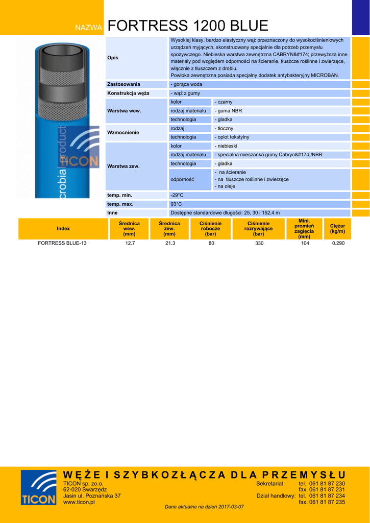NAZWA FORTRESS 1200 BLUE Opis Wysokiej klasy, bardzo elastyczny wąż przeznaczony do wysokociśnieniowych urządzeń myjących, skonstruowany specjalnie dla potrzeb przemysłu spożywczego. Niebieska warstwa zewnętrzna CABRYN® przewyższa inne materiały pod względem odporności na ścieranie, tłuszcze roślinne i zwierzęce, włącznie z tłuszczem z drobiu. Powłoka zewnętrzna posiada specjalny dodatek antybakteryjny MICROBAN. Zastosowania - gorąca woda Konstrukcja węża - wąż z gumy Warstwa wew. Wzmocnienie Warstwa zew. kolor - czarny rodzaj materiału - guma NBR technologia - gładka rodzaj - tłoczny technologia - oplot tekstylny kolor - niebieski rodzaj materiału - specialna mieszanka gumy Cabryn®/NBR technologia - gładka odporność - na ścieranie - na tłuszcze roślinne i zwierzęce - na oleje temp. min. -29°C temp. max. 93°C Inne Dostępne standardowe długości: 25, 30 i 152,4 m Index Index Średnica wew. (mm) Średnica zew. (mm) Ciśnienie robocze (bar) Ciśnienie rozrywające (bar) FORTRESS BLUE-13 12.7 21.3 80 330 Mini. Mini. promień promień zagięcia zagięcia (mm) (mm) 104 Ciężar Ciężar (kg/m) (kg/m) 0.290 WĘŻE I SZYBKOZŁĄCZA DLA PRZEMYSŁU TICON sp. zo.o. 62-020 Swarzędz Jasin ul. Poznańska 37 www.ticon.pl Sekretariat: Dane aktualne na dzień 2017-03-07 tel. 061 81 87 230 fax. 061 81 87 231 Dział handlowy: tel. 061 81 87 234 fax. 061 81 87 235