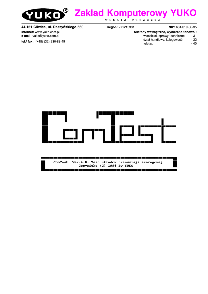 Zakład Komputerowy YUKO W i t o l d 44-151 Gliwice, ul. Daszyńskiego 560 internet: www.yuko.com.pl e-mail: [email protected] tel./ fax : (+48) (32) 230-89-49 ComTest J u r e c z k o Regon: 271215331 NIP: 631-010-66-35 telefony wewne˛trzne, wybierane tonowo : właściciel, sprawy techniczne - 31 dział handlowy, ksieþ gowość - 32 telefax - 40 Ver.4.0. Test układów transmisji szeregowej Copyright (C) 1996 By YUKO 2 ComTest 1 Przeznaczenie Program ComTest jest zestawem testów układów asynchronicznej transmisji szeregowej komputera IBM PC/XT/AT. Umozú liwia sprawdzenie oraz lokalizacjeþ uszkodzeń w standardowaych portach COM1 i COM2 oraz wielokanałowych układach transmisji asynchronicznej bazujaþ cych na standardzie COM. Mozú e być równiezú przydatny do testowania innych elemntów sieci komputerowych, np. modemów, linii teletransmisyjnych i.t.d. Program ComTest w szczególności przydatny jest do testowania nadajników i odbiorników układów interfejsu, które to elementy najczeþ ściej ulegajaþ uszkodzeniu. ComTesT nie mozú e być uzú ywany do testowania "inteligentnych" układów interfejsu szeregowego takich jak karta STALLION, SPECIALIX itp. 2 Zasada działania. W czasie działania programu do odpowiedniego złaþ cza interfejsu V.24 komputera właþ czony jest wtyk testowy, na którym wykonane saþ połaþ czenia sygnałów nadawczych z odbiorczymi. Działanie programu polega na wysyłaniu w wybranym układzie transmisji szeregowej sekwencji testujaþ cych na liniach danych i liniach sterujaþ cych interfejsu V.24 i kontroli poprawności otrzymywanych odpowiedzi. Wystaþ pienie błeþ du jest sygnalizowane na ekranie komputera. Na wtyku testowym wykonane saþ nasteþ pujaþ ce połaþ czenia: 2 (TxD) z 3 (RxD), 4 (RTS) z 5 (CTS) i z 22 (RI), 20 (DTR) z 6 (DSR) i z 8 (DCD). Styki 2, 4 i 20 saþ sygnałami wyjściowymi, pozostałe wejściowymi. W zalezú ności od rodzaju testu sprawdzana jest poprawność działania tylko linii danych TxD/RxD, linii danych i podstawowych linii sterujaþ cych tzn. TxD/RxD, RTS/CTS i DTR/DSR lub wszystkich linii interfejsu. Kontrola poprawności działania linii danych mozú e być wykonywana przy rózú nych szybkościach transmisji (300..115200 Bodów). W czasie działania testu pomieþ dzy złaþ cze interfejsu testowanego układu a wtyk testowy mozú e być dodatkowo właþ czony wskaźnik stanu linii (np. YUKO VT-23), co mozú e dodatkowo ułatwić lokalizacjeþ uszkodzeń. Specjalny tryp pracy programu: "Echo" umozú liwia wykorzystanie komputera do retransmisji danych odebranych w porcie. Zestaw dwóch komputerów z działajaþ cymi programami ComTest, z których jeden jest w trybie Echo, pozwala na dokładne testowanie bardziej złozú onych zestawów komunikacyjnych. 3 Uruchomienie i obsługa programu Program ComTest dostarczany jest na dyskietce dystrybucyjnej i mozú e zostać skopiowany na inny nośnik np. dysk twardy, skaþ d mozú e być nasteþ pnie uruchamiany. Dyskietka dystrybucyjna dostarczana przez producenta musi być założona w kieszeni A lub B w czasie uruchamiania programu. Program jest ładowany i urachamiany komendaþ systemu DOS: COMTEST bez parametrów. Przed uruchomieniem programu ComTest nalezú y do złaþ cza interfejsu V.24 testowanego portu załozú yć wtyk testowy dostarczony przez producenta wraz z programem. W przypadku trudności z lokalizacjaþ złaþ cza, np. gdy w komputerze zainstalowanych jest wiele układów transmisji szeregowej, mozú na w czasie działania programu podłaþ czać wtyk do rózú nych złaþ czy. Bardzo pomocnym w tym wypadku jest wskaźnik stanu linii interfejsu V.24. Program ComTest w czasie testowania steruje stanem linii interfejsu, co na wskaźniku objawiaja sieþ migotaniem niektórych diód świecaþ cych. Komputer standardowo posiada złaþ cza interfejsu V.24 zgodne z ELTRA 870 025 (25-cio stykowe złaþ cza meþ skie) lub ELTRA 871 09 (9-cio stykowe złaþ cza meþ skie). W tym drugim przypadku konieczny jest zestaw przejściowy złaþ czy 9-25-cio stykowych, poniewazú wtyk testowy wykonany jest jako zú eńskie złaþ cze 25-cio stykowe. Shemat zestawu przejściowego zamieszczony jest w dodatku. Zestaw taki produkowany przez YUKO ma symbol UA-9/25. Po uruchomieniu na ekranie wyświetlona jest wineta programu, w której m.in. podany jest numer wersji (aktualnie 3.0). Po naciśnieþ ciu dowolnego klawisza na ekranie pojawia sieþ menu programu. Poszaczególne pozycje menu saþ wybierane za pomocaþ klawiszy oznaczonych strzałkami poziomymi dla okien poziomych i pionowymi dla okien z elemntami ułozú onymi pionowo. Wybrana pozycja okna menu wyświetalana jest w inwersji i mozú e zostać uaktywniona poprzez naciśnieþ cie klawisza Enter. Wybranie i uaktywnienie dowolnej z oferowanych pozycji menu mozú e zostać równiezú wykonane przez naciśnieþ cie klawisza odpowiadajaþ cemu znakowi podświetlonemu w tekście poszczególnych pozycji menu (np. q dla "Quit"). W przypadku, gdy w komputerze zainstalowana jest mysz, mozú e być ona równiezú wykorzystana do sterowania pracaþ programu. Lewy przycisk myszy odpowiada klawiszowi Enter, prawy Esc, a środkowy F10. Nie należy testować portu COM, który jest użyty do podła˛czenia myszy, gdyż spowoduje to jej zablokowanie na czas działania programu. Uaktywnienie pozycji menu wiaþ zú e sieþ z wykonaniem akcji zwiaþ zanej z taþ pozycjaþ . Wycofanie sieþ z okna menu tzn. zaniechanie realizaji operacji (za wyjaþ tkiem menu głównego) nasteþ puje po naciśnieþ ciu Esc lub F10. W oknach menu, w których operator wpisuje tekst (np. adres układu interfejsu), zakończenie wpisywania sygnalizowane jest poprzez naciśnieþ cie Enter. W czasie wpisywania lub edycji tekstu działajaþ klawisze edycyjne tzn. strzałki poziome, Home, End, BS, Ins i Del. Ctrl BS kasuje cały tekst widoczny w takim oknie, Esc wprowadzone zmiany w tekście. Menu główne programu ma postać: Com Mode Speed Options Test Run