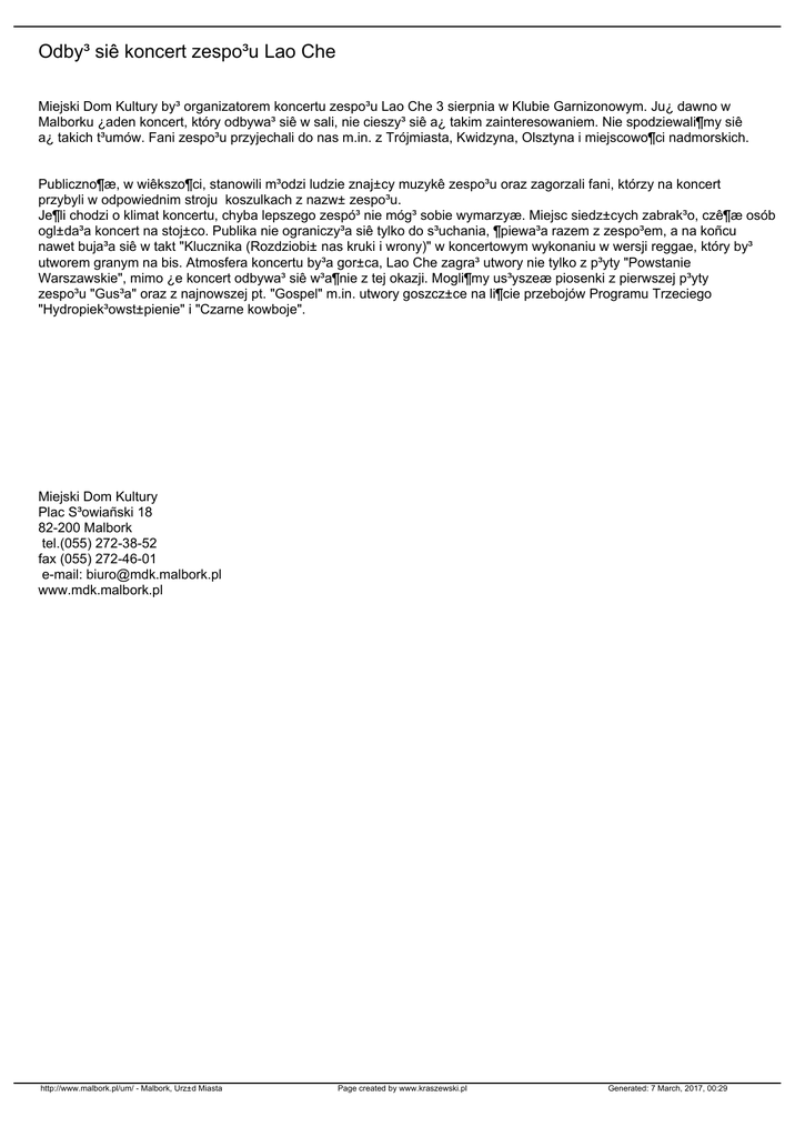Odby³ siê koncert zespo³u Lao Che Miejski Dom Kultury by³ organizatorem koncertu zespo³u Lao Che 3 sierpnia w Klubie Garnizonowym. Ju¿ dawno w Malborku ¿aden koncert, który odbywa³ siê w sali, nie cieszy³ siê a¿ takim zainteresowaniem. Nie spodziewali¶my siê a¿ takich t³umów. Fani zespo³u przyjechali do nas m.in. z Trójmiasta, Kwidzyna, Olsztyna i miejscowo¶ci nadmorskich. Publiczno¶æ, w wiêkszo¶ci, stanowili m³odzi ludzie znaj±cy muzykê zespo³u oraz zagorzali fani, którzy na koncert przybyli w odpowiednim stroju koszulkach z nazw± zespo³u. Je¶li chodzi o klimat koncertu, chyba lepszego zespó³ nie móg³ sobie wymarzyæ. Miejsc siedz±cych zabrak³o, czê¶æ osób ogl±da³a koncert na stoj±co. Publika nie ograniczy³a siê tylko do s³uchania, ¶piewa³a razem z zespo³em, a na koñcu nawet buja³a siê w takt "Klucznika (Rozdziobi± nas kruki i wrony)" w koncertowym wykonaniu w wersji reggae, który by³ utworem granym na bis. Atmosfera koncertu by³a gor±ca, Lao Che zagra³ utwory nie tylko z p³yty "Powstanie Warszawskie", mimo ¿e koncert odbywa³ siê w³a¶nie z tej okazji. Mogli¶my us³yszeæ piosenki z pierwszej p³yty zespo³u "Gus³a" oraz z najnowszej pt. "Gospel" m.in. utwory goszcz±ce na li¶cie przebojów Programu Trzeciego "Hydropiek³owst±pienie" i "Czarne kowboje". Miejski Dom Kultury Plac S³owiañski 18 82-200 Malbork tel.(055) 272-38-52 fax (055) 272-46-01 e-mail: [email protected] www.mdk.malbork.pl http://www.malbork.pl/um/ - Malbork, Urz±d Miasta Page created by www.kraszewski.pl Generated: 7 March, 2017, 00:29