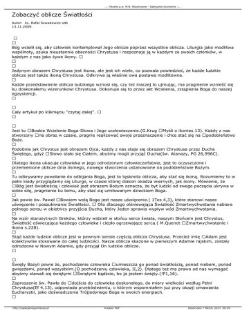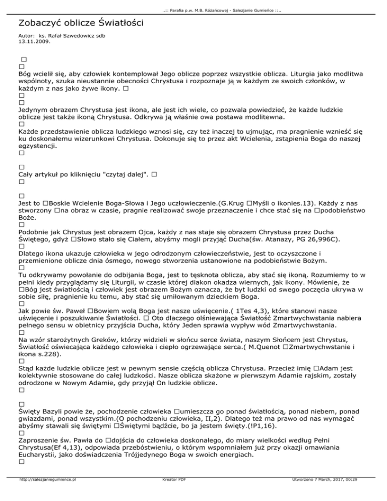 ..:: Parafia p.w. M.B. Różańcowej - Salezjanie Gumieńce ::.. Zobaczyć oblicze Światłości Autor: ks. Rafał Szwedowicz sdb 13.11.2009. Bóg wcielił się, aby człowiek kontemplował Jego oblicze poprzez wszystkie oblicza. Liturgia jako modlitwa wspólnoty, szuka nieustannie obecności Chrystusa i rozpoznaje ją w każdym ze swoich członków, w każdym z nas jako żywe ikony. Jedynym obrazem Chrystusa jest ikona, ale jest ich wiele, co pozwala powiedzieć, że każde ludzkie oblicze jest także ikoną Chrystusa. Odkrywa ją właśnie owa postawa modlitewna. Każde przedstawienie oblicza ludzkiego wznosi się, czy też inaczej to ujmując, ma pragnienie wznieść się ku doskonałemu wizerunkowi Chrystusa. Dokonuje się to przez akt Wcielenia, zstąpienia Boga do naszej egzystencji. Cały artykuł po kliknięciu "czytaj dalej". Jest to Boskie Wcielenie Boga-Słowa i Jego uczłowieczenie.(G.Krug Myśli o ikonies.13). Każdy z nas stworzony na obraz w czasie, pragnie realizować swoje przeznaczenie i chce stać się na podobieństwo Boże. Podobnie jak Chrystus jest obrazem Ojca, każdy z nas staje się obrazem Chrystusa przez Ducha Świętego, gdyż Słowo stało się Ciałem, abyśmy mogli przyjąć Ducha(św. Atanazy, PG 26,996C). Dlatego ikona ukazuje człowieka w jego odrodzonym człowieczeństwie, jest to oczyszczone i przemienione oblicze dnia ósmego, nowego stworzenia ustanowione na podobieństwie Bożym. Tu odkrywamy powołanie do odbijania Boga, jest to tęsknota oblicza, aby stać się ikoną. Rozumiemy to w pełni kiedy przyglądamy się Liturgii, w czasie której diakon okadza wiernych, jak ikony. Mówienie, że Bóg jest światłością i człowiek jest obrazem Bożym oznacza, że byt ludzki od swego poczęcia ukrywa w sobie siłę, pragnienie ku temu, aby stać się umiłowanym dzieckiem Boga. Jak powie św. Paweł Bowiem wolą Boga jest nasze uświęcenie.( 1Tes 4,3), które stanowi nasze uświęcenie i poszukiwanie Światłości. Oto dlaczego olśniewająca Światłość Zmartwychwstania nabiera pełnego sensu w obietnicy przyjścia Ducha, który Jeden sprawia wypływ wód Zmartwychwstania. Na wzór starożytnych Greków, którzy widzieli w słońcu serce świata, naszym Słońcem jest Chrystus, Światłość oświecająca każdego człowieka i ciepło ogrzewające serca.( M.Quenot Zmartwychwstanie i ikona s.228). Stąd każde ludzkie oblicze jest w pewnym sensie częścią oblicza Chrystusa. Przecież imię Adam jest kolektywnie stosowane do całej ludzkości. Nasze oblicza skażone w pierwszym Adamie rajskim, zostały odrodzone w Nowym Adamie, gdy przyjął On ludzkie oblicze. Święty Bazyli powie że, pochodzenie człowieka umieszcza go ponad światłością, ponad niebem, ponad gwiazdami, ponad wszystkim.(O pochodzeniu człowieka, II,2). Dlatego też ma prawo od nas wymagać abyśmy stawali się świętymi Świętymi bądźcie, bo ja jestem święty.(!P1,16). Zaproszenie św. Pawła do dojścia do człowieka doskonałego, do miary wielkości według Pełni Chrystusa(Ef 4,13), odpowiada przebóstwieniu, o którym wspomniałem już przy okazji omawiania Eucharystii, jako doświadczenia Trójjedynego Boga w swoich energiach. http://salezjaniegumience.pl Kreator PDF Utworzono 7 March, 2017, 00:29 ..:: Parafia p.w. M.B. Różańcowej - Salezjanie Gumieńce ::.. Odkrywanie tej pełni, ikoniczności w sobie i innych dokonuje się w pokorze i fascynacji. W Opowieściach pielgrzyma, małym arcydziele przekazującym z niezwykłą subtelnością doświadczenie duchowe i tradycję słowiańskiego Wschodu, anonimowy autor tegoż dziełka, wyznaje, że kiedy w drodze odmawiał modlitwę serca, doświadczył tego o czym pisał św. Paweł. Mówi, że wszystko, co mnie otaczało, widziałem w jakiejś zachwycającej postaci: drzewa, trawy, ptaki, ziemię, powietrze, światło. Wszystko to jakby mówiło mi, że istnieje właśnie dla ludzi, świadczy o Bożej miłości do człowiek, modli się i wyśpiewuje chwałę Boga.(Szczere opowieści pielgrzymas.43-44). Na ikonach jak zauważymy nic nie odróżnia Chrystusa od świętych, jedynie nimb (aureola) z wpisanym w niego krzyżem i niekiedy mandorla na tych przedstawieniach, gdy jest w chwale. Może dlatego wschodnie obrzędy pogrzebu eksponuje właśnie udział człowieka w takiej rzeczywistości, która opisuje Chrystusa. Pięknie to wyraża tekst modlitwy: Boże, daj odpoczynek Twoim sługom i umieść ich w raju, gdzie chóry świętych, Panie, i sprawiedliwi jaśnieją jak gwiazdy, daj odpoczynek zmarłym Twoim sługom, nie pomnąc wszystkich ich grzechów.( eulogitaria, ton 5). Tutaj światłość staje się celem i kierunkiem ku...rozprasza ciemności, wątpliwości zwyczajnie bez światłości człowiek nie znajdzie drogi, będzie się miotał to tu, a może tam. Będzie chodził jak ślepiec wyszukując drogi, potykając się do ściany do ściany, aż spotka Chrystusa- Światłość, Mandorlę. Kiedy spotka Pana będzie chciał wejść i zakosztować światłości jak ze źródła. To doświadczenie usunie lęk, i rozproszy to co, ciemne i niepewne. Wtedy dzięki Światłości, staniemy się światłością, bo będziemy szczęśliwcami którzy widzą to, co nawet przed Aniołami jest zakryte, którzy zobaczą Ikonę...strumień światła jak rzekę, Liturgię wiecznego teraz. Oświecenie naszego wnętrza, całego naszego człowieczeństwa, spowoduje iż nasze życie będzie głębią, a nasze serce czerpakiem na miłość Zbawiciela. Jak wyrazi to św. Grzegorz z Nyssy Bóg znajduje sobie mieszkanie w sercu oczyszczonym .poszukującym piękna. Gdy znajdzie takie serce, dusza która zbliża się do światłości sama staje się światłością.( Homilia V na Pieśń nad pieśniami, PG44,868). Ta światłość obecna w sercu każdego człowieka, zajaśnieje dopiero po przejściu bramy jaką jest śmierć, po przejściu na Liturgię Zmartwychwstania, kiedy Pan uczyni wszystko nowe. Wtedy całe stworzenie przeniknie wie