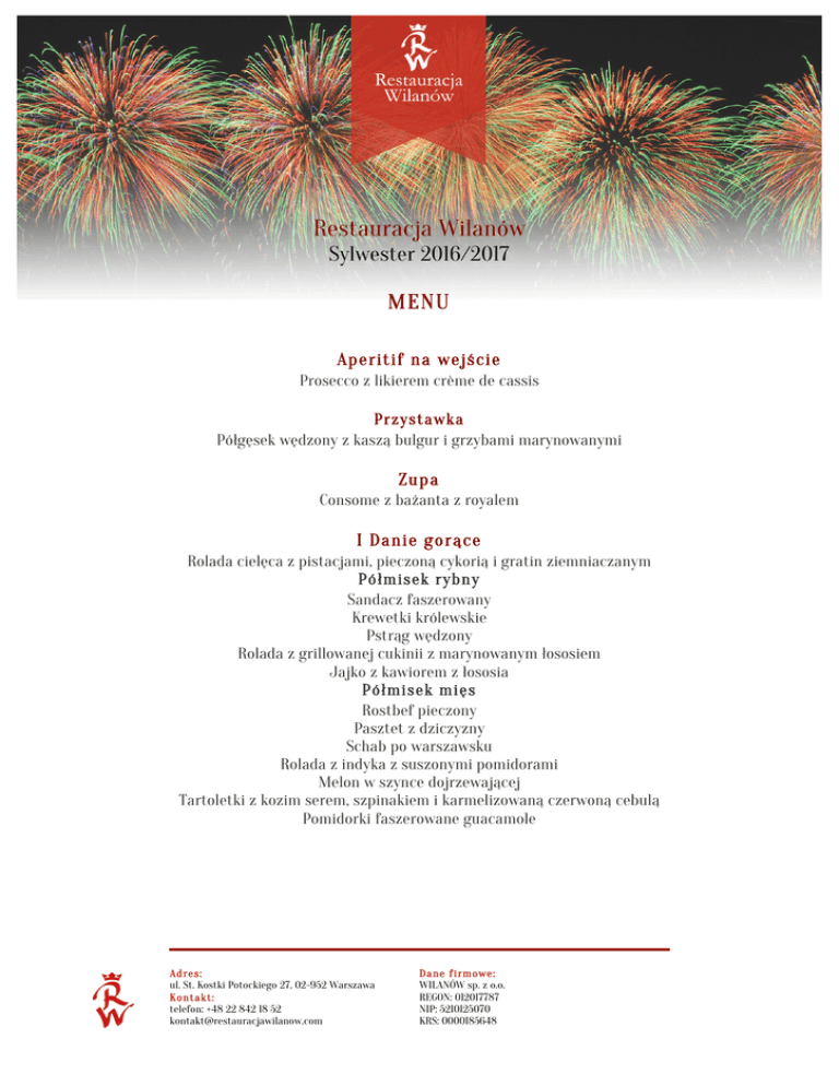 Restauracja Wilanów Sylwester 2016/2017 MENU Aperitif na wejście Prosecco z likierem crème de cassis Przystawka Półgęsek wędzony z kaszą bulgur i grzybami marynowanymi Zupa Consome z bażanta z royalem I Danie gorące Rolada cielęca z pistacjami, pieczoną cykorią i gratin ziemniaczanym Półmisek rybny Sandacz faszerowany Krewetki królewskie Pstrąg wędzony Rolada z grillowanej cukinii z marynowanym łososiem Jajko z kawiorem z łososia Półmisek mięs Rostbef pieczony Pasztet z dziczyzny Schab po warszawsku Rolada z indyka z suszonymi pomidorami Melon w szynce dojrzewającej Tartoletki z kozim serem, szpinakiem i karmelizowaną czerwoną cebulą Pomidorki faszerowane guacamole Adres: ul. St. Kostki Potockiego 27, 02-952 Warszawa Kontakt: telefon: +48 22 842 18 52 [email protected] Dane firmowe: WILANÓW sp. z o.o. REGON: 012017787 NIP: 5210125070 KRS: 0000185648 Dodatki Sosy: tatarski, chrzanowy, żurawinowy Pieczywo, masło II Danie gorące Pierś z kaczki na puree pietruszkowym z cytryną, sosem wiśniowym i polentą Deser Beza z lodami waniliowymi, sosem owocowym oraz miętą Kawa / herbata Zupa dla wytrwałych Patioka Alkohole Jedna butelka wina lub jedna butelka wódki na parę Wino musujące na toast noworoczny Napoje Soki owocowe, woda mineralna Kawa i herbata Koszt przyjęcia w przedstawionej propozycji zamknie się kwotą 250,00 zł / osoba. Adres: ul. St. Kostki Potockiego 27, 02-952 Warszawa Kontakt: telefon: +48 22 842 18 52 [email protected] Dane firmowe: WILANÓW sp. z o.o. REGON: 012017787 NIP: 5210125070 KRS: 0000185648