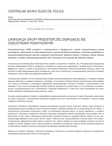 CENTRALNE BIURO ŚLEDCZE POLICJI Źródło: http://cbsp.policja.pl/cbs/aktualnosci/105004,Likwidacja-grupy-przestepczej-zajmujacej-sie-oszustwami-podatkowymi.html Wygenerowano: Wtorek, 7 marca 2017, 00:20 Strona znajduje się w archiwum. LIKWIDACJA GRUPY PRZESTĘPCZEJ ZAJMUJĄCEJ SIĘ OSZUSTWAMI PODATKOWYMI Funkcjonariusze CBŚP wspólnie z policjantami z Bydgoszczy rozbili zorganizowaną grupę przestępczą. Zatrzymali 21 osób podejrzanych o pranie brudnych pieniędzy i oszustwa podatkowe w wewnątrzwspólnotowym obrocie metalami szlachetnymi: głównie złotem i srebrem. Straty Skarbu Państwa w wyniku wyłudzonego podatku VAT szacowane są na ponad 36 milionów złotych. Funkcjonariusze Centralnego Biura Śledczego Policji wspólnie z policjantami z Wydziału dw. z Przestępczością Gospodarczą Komendy Wojewódzkiej Policji w Bydgoszczy prowadzili tę sprawę przy współudziale Urzędów Kontroli Skarbowej z Bydgoszczy i Katowic, a także w porozumieniu z Generalnym Inspektorem Informacji Finansowej. Policjanci ustalili, kto wchodził w skład zorganizowanej grupy przestępczej i jakie firmy uczestniczyły w przeprowadzaniu pozornych transakcji handlowych, których celem było wyłudzenie podatku VAT. Funkcjonariusze dowiedli, że firmy dokumentowały fikcyjny wewnątrzwspólnotowy obrót gospodarczy, a następnie składały stosowne deklaracje w urzędach skarbowych, wyłudzając w ten sposób od Skarbu Państwa wielomilionowe zwroty podatku VAT. Korzyści pochodzące z przestępstw legalizowano przeprowadzając transakcje handlowe z wykorzystaniem kont bankowych. Dla ukrycia przestępczego działania podmioty gospodarcze uczestniczące w tym procederze korzystały z pomocy wyspecjalizowanych biur rachunkowych i doradców podatkowych. Z kolei firmy, które wprowadzały do obrotu metale szlachetne, reprezentowane były przez tzw. „słupy”. W wyniku przeprowadzonych działań w województwie kujawsko-pomorskim zatrzymano 21 osób. Przeszukano także ponad 50 miejsc związanych z prowadzeniem działalności gospodarczej, biur rachunkowych oraz obiektów, w których mogły znajdować się dowody rzeczowe. Zatrzymani mieszkańcy województwa kujawsko-pomorskiego usłyszeli zarzuty dotyczące między innymi działania w zorganizowanej grupie przestępczej, prania brudnych pieniędzy i wyłudzenia podatku VAT na kwotę ponad 36 mln. złotych. 7 zatrzymanych tymczasowo aresztowano, wobec 14 zastosowano policyjne dozory. W wyniku współpracy z urzędami skarbowymi i Generalnym Inspektorem Informacji Finansowej zablokowano wypłaty nienależnego zwrotu podatku VAT na kwotę około 2,6 mln. złotych. Zablokowano także środki na kontach firmowych w wysokości 360 tys. złotych i 43 tys. euro. Ponadto zajęto gotówkę w kwocie około 750 tys. złotych i 1500 euro oraz wyroby jubilerskie o wartości około 2 mln. złotych. U podejrzanych zabezpieczono także mienie o wartości 5 mln. złotych. Działania te mają szczególne znaczenie nie tylko ze względu na wartość zajętego mienia i jego pochodzenie z działalności przestępczej. Dają one przede wszystkim gwarancję, że zgromadzony majątek nie posłuży w przyszłości do odbudowy przestępczego procederu. Sprawa ma charakter rozwojowy. Prokuratura Okręgowa w Gliwicach nie wyklucza dalszych zatrzymań. Za popełnione przestępstwa sprawcom grozi kara do 10 lat więzienia. CBŚP Zainstaluj wtyczkę Flash, aby zobaczyć odtwarzacz. KWP w Bydgoszczy pobierz film - 9.35 MB Zainstaluj wtyczkę Flash, aby zobaczyć odtwarzacz. CBŚP pobierz film - 8.38 MB Ocena: 4/5 (4) Tweetnij