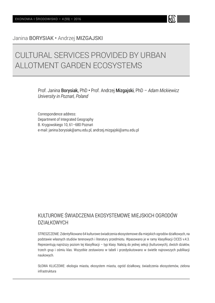 EKONOMIA I ŚRODOWISKO • 4 (59) • 2016 Janina BORYSIAK • Andrzej MIZGAJSKI CULTURAL SERVICES PROVIDED BY URBAN ALLOTMENT GARDEN ECOSYSTEMS Prof. Janina Borysiak, PhD • Prof. Andrzej Mizgajski, PhD – Adam Mickiewicz University in Poznań, Poland Correspondence address: Department of Integrated Geography B. Krygowskiego 10, 61–680 Poznań e-mail: [email protected], [email protected] KULTUROWE ŚWIADCZENIA EKOSYSTEMOWE MIEJSKICH OGRODÓW DZIAŁKOWYCH STRESZCZENIE: Zidentyfikowano 64 kulturowe świadczenia ekosystemowe dla miejskich ogrodów działkowych, na podstawie własnych studiów terenowych i literatury przedmiotu. Wpasowano je w ramy klasyfikacji CICES v.4.3. Reprezentują najniższy poziom tej klasyfikacji – typ klasy. Należą do jednej sekcji (kulturowych), dwóch działów, trzech grup i ośmiu klas. Wszystkie zestawiono w tabeli i przedyskutowano w świetle najnowszych publikacji naukowych. SŁOWA KLUCZOWE: ekologia miasta, ekosystem miasta, ogród działkowy, świadczenia ekosystemów, zielona infrastruktura EKONOMIA I ŚRODOWISKO 4 (59) • 2016 General environmental and social problems Introduction Among the quality of life factors in cities, the availability of the green infrastructure and possibility of the passive or active using it are of growing importance. Urban allotment gardens (UAGs) are a significant element of the green infrastructure. They are characterized by a high level of biodiversity, native species predominate in their spontaneous flora. The basic part of the biotic structure are cultivated plants1, thus in this respect, UAGs are similar to urban home gardens. The common features of these two types are green sites is the similar level of provisioning and regulating ecosystem services. UAGs are positive distinguished, however, by specific cultural ecosystem services (CES). This results, amongst other things, from their location outside the permanent residents of users. J. Breuste2 paid attention to the position of UAGs that indicated their intra-urban locations and the tradition of usage for growing fruits and vegetables. Recently, several papers use ecosystem services approach for consideration of benefits, which UAGs provide to their holders. J. Langemeyer et al.3 gave an overview of the services offered by allotment gardens in Europe. A. Speak et al.4 discussed the differences between the services provided by UAGs and parks in Manchester and Poznań. Camps-Calvet et al.5 reported on the perception of services delivered by UAGs in Barcelona from the allotment users’ point of view. An attempt at summarizing the position of allotment gardens in the social-ecological system is the monograph by S. Bell et al.6 It presents results of the multidisciplinary research carried out in the framework of the COST Action TU1201 Urban Allotment Gardens in European Cities – Future, Chal 1 2 3 4 5 6 J. Borysiak, A. Mizgajski, A. Speak, Floral biodiversity of allotment gardens and its con tribution to urban green infrastructure, “Urban Ecosystems” 2016, pp. 1–13. J. Breuste, Allotment gardens as part of urban green infrastructure: Actual trends and perspectives in Central Europe, in: N. Müller, P. Werner, J.G. Kelcey (eds), Urban Biodi versity and Design, 2010, pp. 463–476. J. Langemeyer, M.J. Latkowska, E.N. Gómez-Baggethun, Ecosystem services from urban gardens, in: S. Bell, R. Fox-Kämper, N. Keshavarz et al. (eds), Urban allotment gardens in Europe, London and New York 2016, pp. 115–141. A. Speak, A. Mizgajski, J. Borysiak, Allotment gardens and parks: Provision of ecosystem services with an emphasis on biodiversity, “Urban Forestry and Urban Greening” 2015 no. 14, pp. 772–781. M. Camps-Calvet, J. Langemeyer, L. Calvet-Mir, E. Gómez-Baggethun, Ecosystem ser vices provided by urban gardens in Barcelona, Spain: Insights for policy and planning, “Environmental Science and Policy” 2016 no. 62, pp. 14–23. S. Bell, R. Fox-Kämper, N. Keshavarz et al. (eds), Urban allotment gardens in Europe, London and New York 2016, p. 384. 293 294 General environmental and social problems EKONOMIA I ŚRODOWISKO 4 (59) • 2016 lenges and Lessons Learned. Polish experience in this area can be particularly valuable as this is a country with the highest number of allotments sites in Europe in relation to population7. The existing research findings make it possible to conclude that cultural benefits are of key importance for UAGs holders and this importance has been growing recently. Cultural benefits are inherent linked to their subjective perception by receivers, hence their different specification in publications. It would be of importance to adopt more or less uniform classification to increase the comparability of diverse studies. The aim of this paper is to present the set of CES provided by UAGs and to attribute the identified categories to the Common International Classification of Ecosystem Services (CICES). Cultural benefits of UAG ecosystems as an object of research According to the definition in the Millennium Ecosystem Assessment8, cultural ecosystem services signify the psychosocial aspects of people-nature interactions. R. Russell et al.9 reported that CES represent ‘intangible dimen sions of the links between people and ecosystems that are psychological, philo sophical, social, and spiritual and are at the very core of human preferences and values’. Cultural services constitute one of three sections in the CICES v.4.310. While accepting this classification, one should notice the statement by K.M.A. Chan et al.11 that most of cultural benefits are produced not only through cultural services but also through provisioning services. D. La Rosa et al.12 emphasized that ‘CES are directly experienced and appreciated by peo ple through ecosystems, thus, unlike other services’. Publications devoted to ecosystem services provided by UAGs3,4,5,6 use various approaches to the classification of CES. From the point of view of the CES diagnosis,