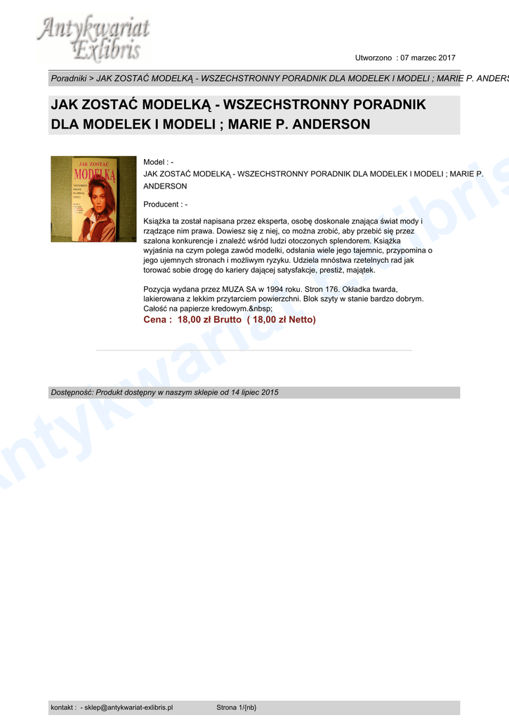Utworzono : 07 marzec 2017 Poradniki > JAK ZOSTAĆ MODELKĄ - WSZECHSTRONNY PORADNIK DLA MODELEK I MODELI ; MARIE P. ANDERS JAK ZOSTAĆ MODELKĄ - WSZECHSTRONNY PORADNIK DLA MODELEK I MODELI ; MARIE P. ANDERSON s i r b Model : - JAK ZOSTAĆ MODELKĄ - WSZECHSTRONNY PORADNIK DLA MODELEK I MODELI ; MARIE P. ANDERSON Producent : - i l x Książka ta został napisana przez eksperta, osobę doskonale znająca świat mody i rządzące nim prawa. Dowiesz się z niej, co można zrobić, aby przebić się przez szalona konkurencje i znaleźć wśród ludzi otoczonych splendorem. Książka wyjaśnia na czym polega zawód modelki, odsłania wiele jego tajemnic, przypomina o jego ujemnych stronach i możliwym ryzyku. Udziela mnóstwa rzetelnych rad jak torować sobie drogę do kariery dającej satysfakcje, prestiż, majątek. E t a i r a w k y t n A Pozycja wydana przez MUZA SA w 1994 roku. Stron 176. Okładka twarda, lakierowana z lekkim przytarciem powierzchni. Blok szyty w stanie bardzo dobrym. Całość na papierze kredowym. Cena : 18,00 zł Brutto ( 18,00 zł Netto) Dostępność: Produkt dostępny w naszym sklepie od 14 lipiec 2015 kontakt : - [email protected] Strona 1/{nb}