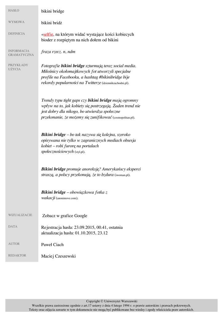 HASŁO bikini bridge WYMOWA bikini bridż DEFINICJA «selfie, na którym widać wystające kości kobiecych bioder z rozpiętym na nich dołem od bikini» INFORMACJA GRAMATYCZNA fraza rzecz. n, ndm PRZYKŁADY UŻYCIA Fotografie bikini bridge szturmują teraz social media. Miłośnicy okołomajtkowych fot utworzyli specjalne profile na Facebooku, a hashtag #bikinibridge bije rekordy popularności na Twitterze (dziennikzachodni.pl). Trendy typu tight gaps czy bikini bridge mają ogromny wpływ na to, jak kobiety się postrzegają. Żaden trend nie jest dobry dla nikogo, bo utwierdza społeczne przekonanie, że możemy się zunifikować (cosmopolitan.pl). Bikini bridge – bo tak nazywa się kolejna, szeroko opisywana nie tylko w zagranicznych mediach obsesja kobiet – robi furorę na portalach społecznościowych (styl.pl). Bikini bridge promuje anoreksję? Amerykańscy eksperci straszą, a polscy przekonują, że to bzdura (iwoman.pl). Bikini bridge – obowiązkowa fotka z wakacji (anonimove.com). WIZUALIZACJE Zobacz w grafice Google DATA Rejestracja hasła: 23.09.2015, 00.41, ostatnia aktualizacja hasła: 01.10.2015, 23.12 AUTOR Paweł Ciach REDAKTOR Maciej Czeszewski Copyright © Uniwersytet Warszawski Wszelkie prawa zastrzeżone zgodnie z art.17 ustawy z dnia 4 lutego 1994 r. o prawie autorskim i prawach pokrewnych. Teksty oraz zdjęcia zawarte w tym dokumencie nie mogą być publikowane bez wiedzy i zgody właściciela praw autorskich. Powered by TCPDF (www.tcpdf.org)