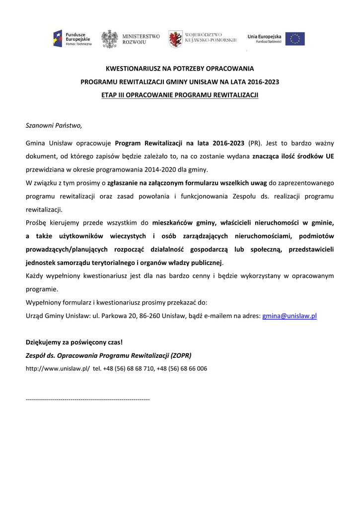 KWESTIONARIUSZ NA POTRZEBY OPRACOWANIA PROGRAMU REWITALIZACJI GMINY UNISŁAW NA LATA 2016-2023 ETAP III OPRACOWANIE PROGRAMU REWITALIZACJI Szanowni Państwo, Gmina Unisław opracowuje Program Rewitalizacji na lata 2016-2023 (PR). Jest to bardzo ważny dokument, od którego zapisów będzie zależało to, na co zostanie wydana znacząca ilość środków UE przewidziana w okresie programowania 2014-2020 dla gminy. W związku z tym prosimy o zgłaszanie na załączonym formularzu wszelkich uwag do zaprezentowanego programu rewitalizacji oraz zasad powołania i funkcjonowania Zespołu ds. realizacji programu rewitalizacji. Prośbę kierujemy przede wszystkim do mieszkańców gminy, właścicieli nieruchomości w gminie, a także użytkowników wieczystych i osób zarządzających nieruchomościami, podmiotów prowadzących/planujących rozpocząć działalność gospodarczą lub społeczną, przedstawicieli jednostek samorządu terytorialnego i organów władzy publicznej. Każdy wypełniony kwestionariusz jest dla nas bardzo cenny i będzie wykorzystany w opracowanym programie. Wypełniony formularz i kwestionariusz prosimy przekazać do: Urząd Gminy Unisław: ul. Parkowa 20, 86-260 Unisław, bądź e-mailem na adres: [email protected] Dziękujemy za poświęcony czas! Zespół ds. Opracowania Programu Rewitalizacji (ZOPR) http://www.unislaw.pl/ tel. +48 (56) 68 68 710, +48 (56) 68 66 006 -------------------------------------------------------------